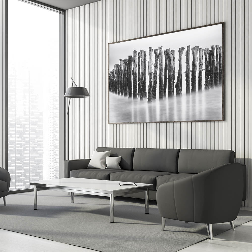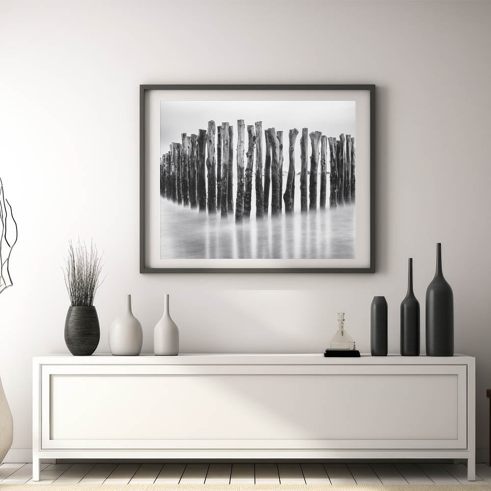 Whether you love coastal photography or abstract compositions, this misty wooden posts print adds a touch of elegance and intrigue to any space. Choose from multiple finishes, including canvas prints, acrylic prints, and framed prints, to complement your decor perfectly.