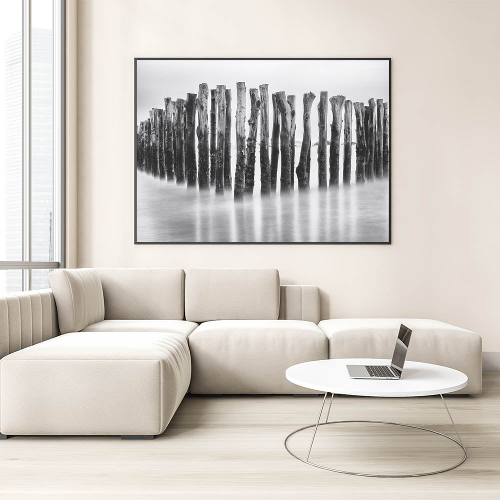Step into a world of mystery and tranquility with this breathtaking fine art photography canvas print. Featuring a row of weathered wooden posts standing in misty waters, this black-and-white composition exudes a timeless and ethereal quality.