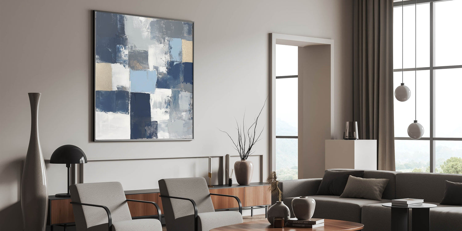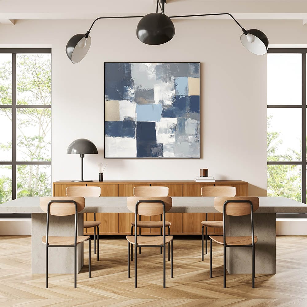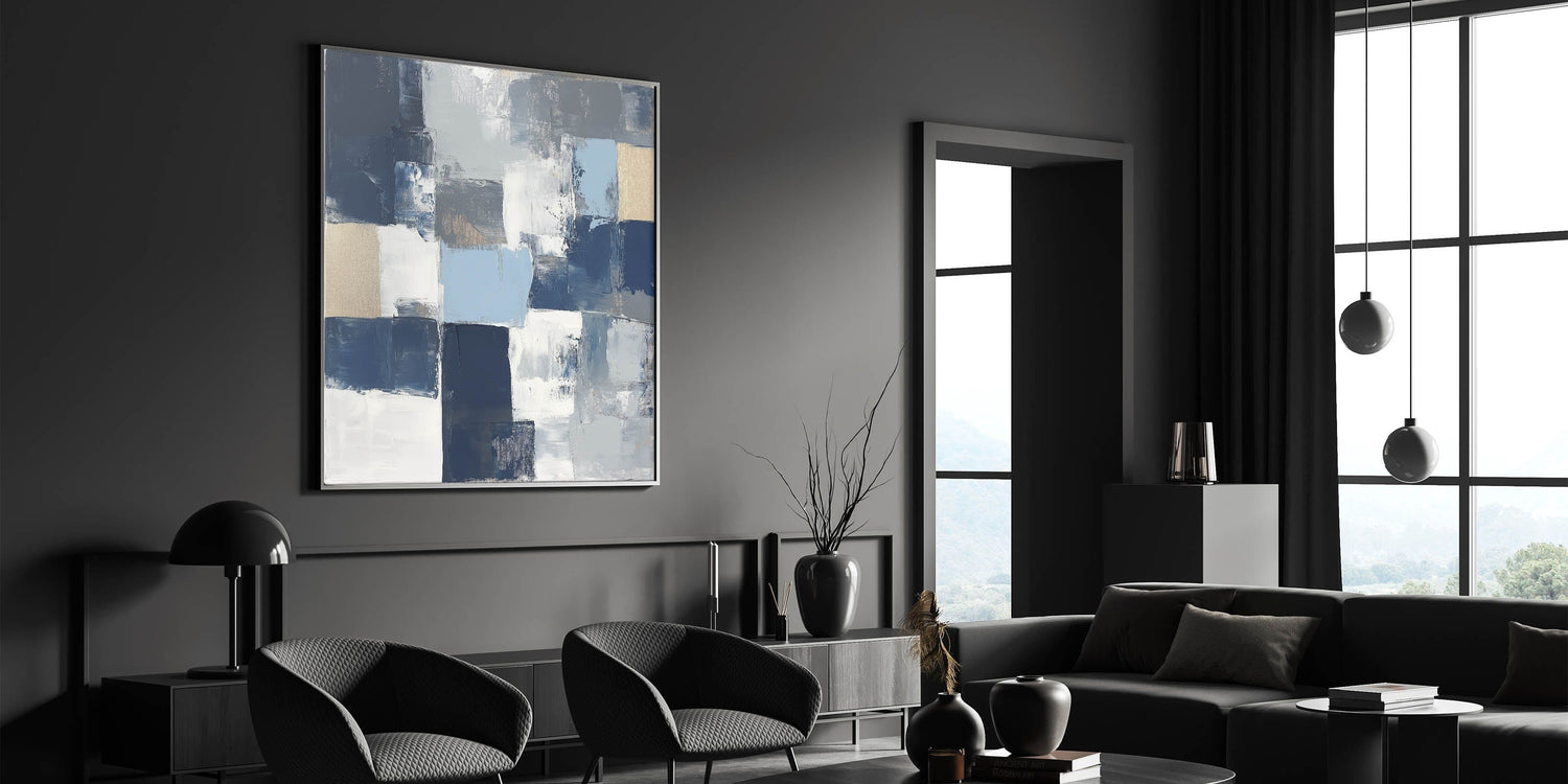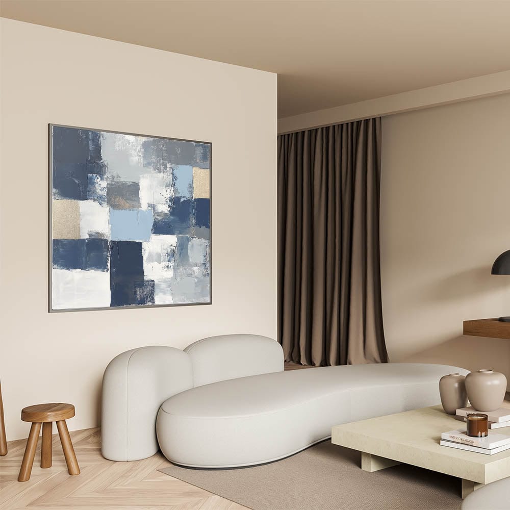 Balance your space with the calming sophistication of this modern abstract wall art. Featuring a patchwork of navy blue, gray blue, beige, light gray, and white, this artwork offers bold structure through layered, textured brushwork and tonal harmony.
