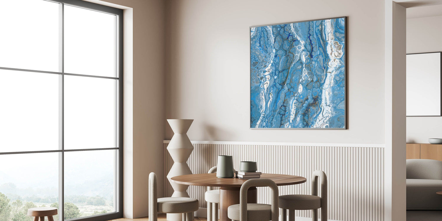 Immerse yourself in the fluidity of abstract expression with this modern fluid abstract wall art. Featuring a mesmerizing blend of deep blue, sky blue, and white, this piece evokes the movement of ocean waves, creating a sense of depth and tranquility. The intricate acrylic pour technique enhances the organic textures, making it a striking addition to any space.