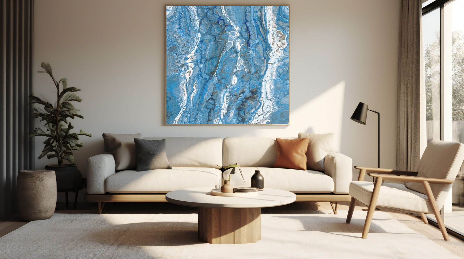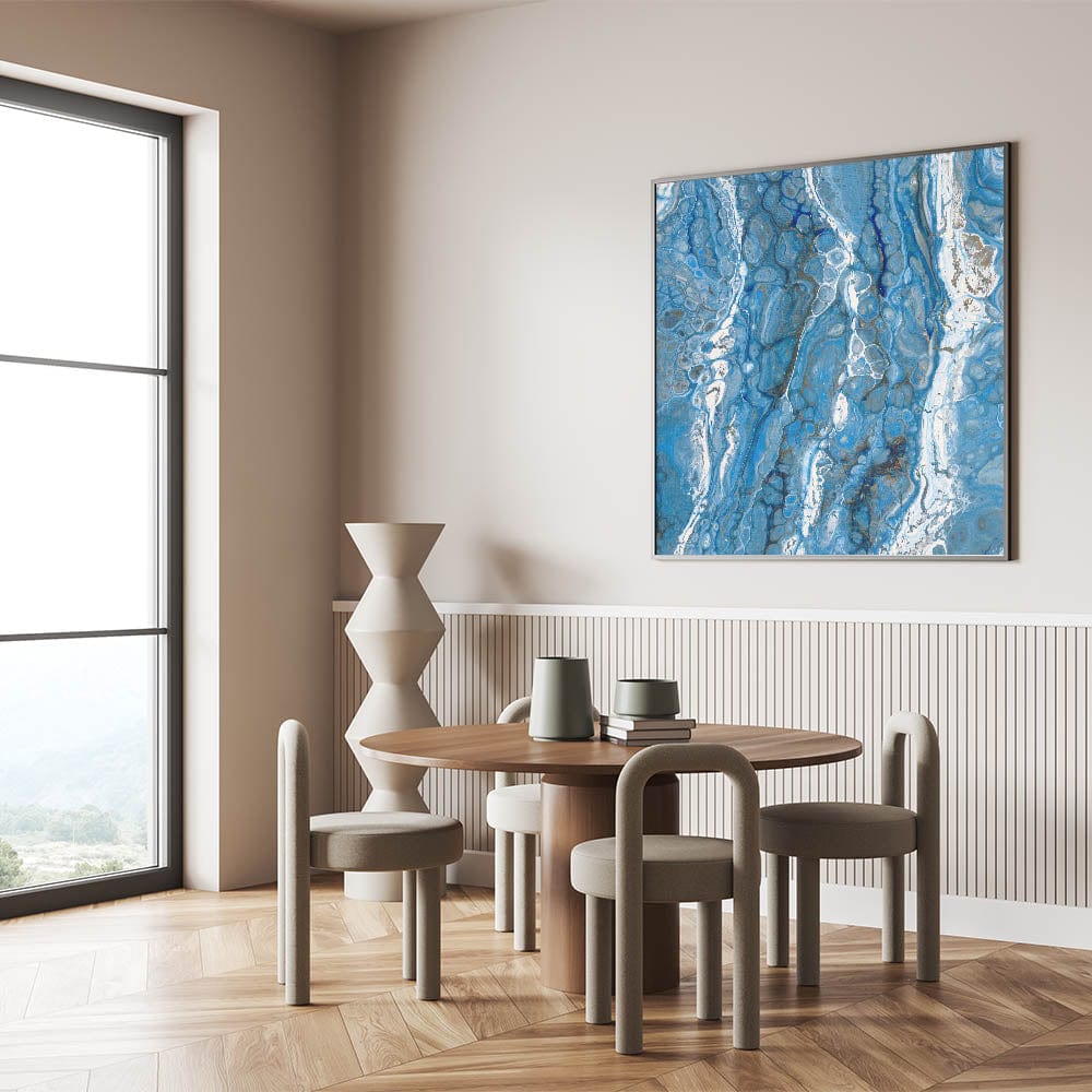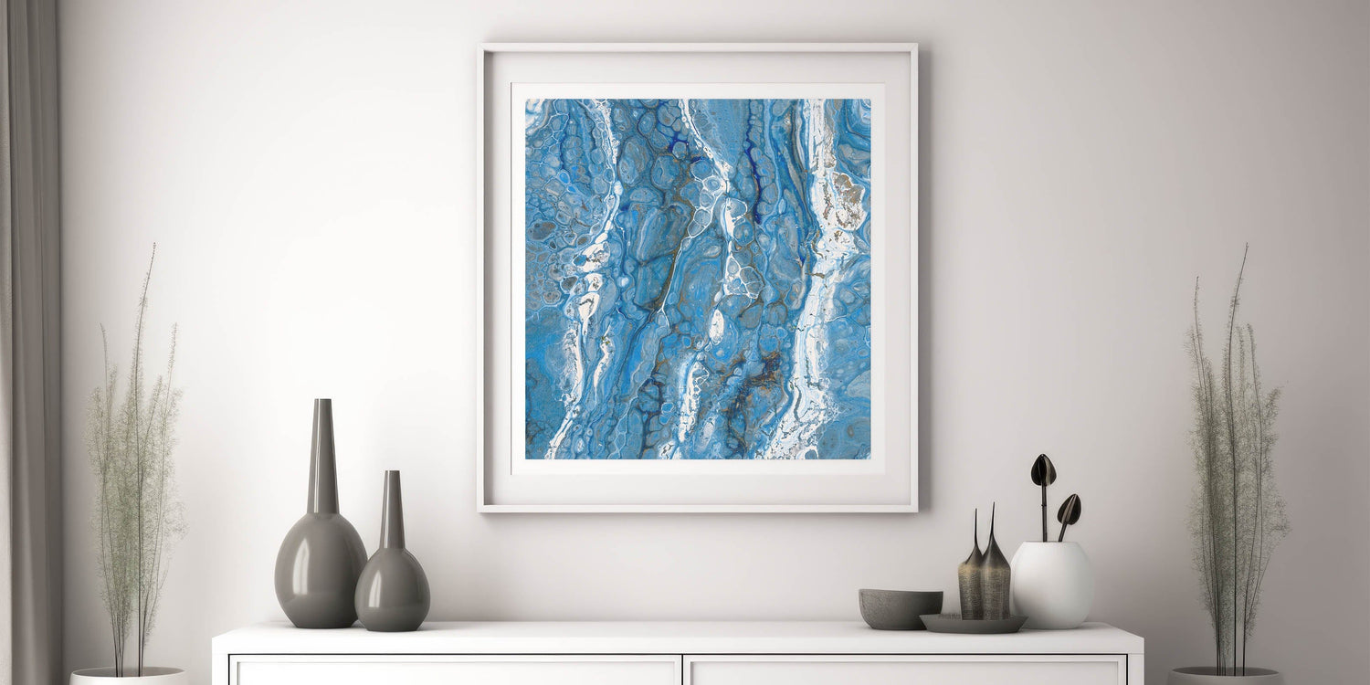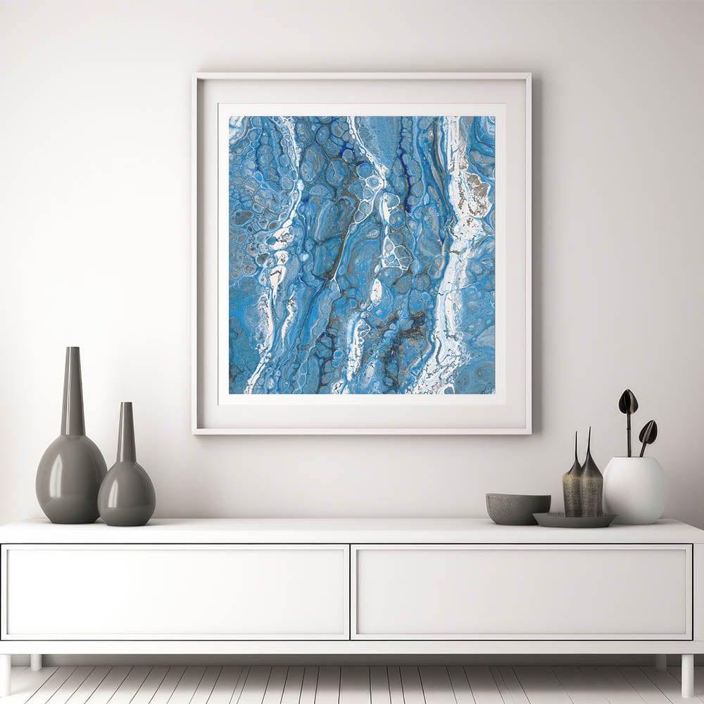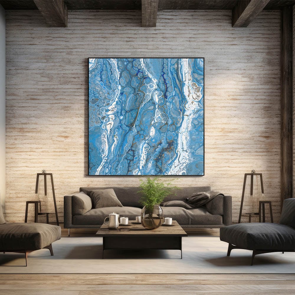 - Rich blue hues with flowing white details, creating a fluid acrylic wall decor aesthetic.