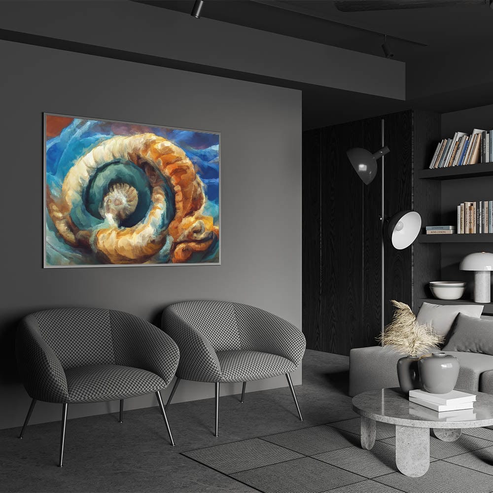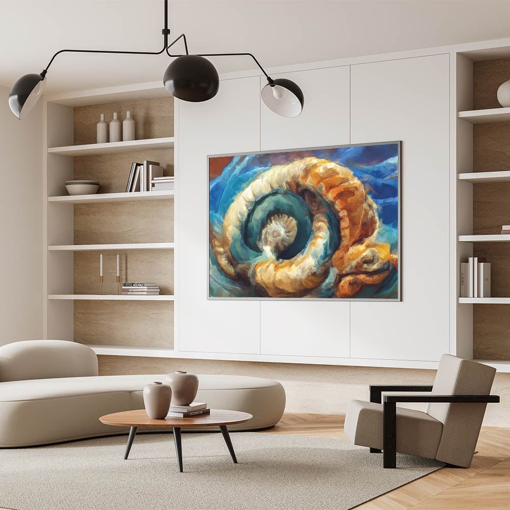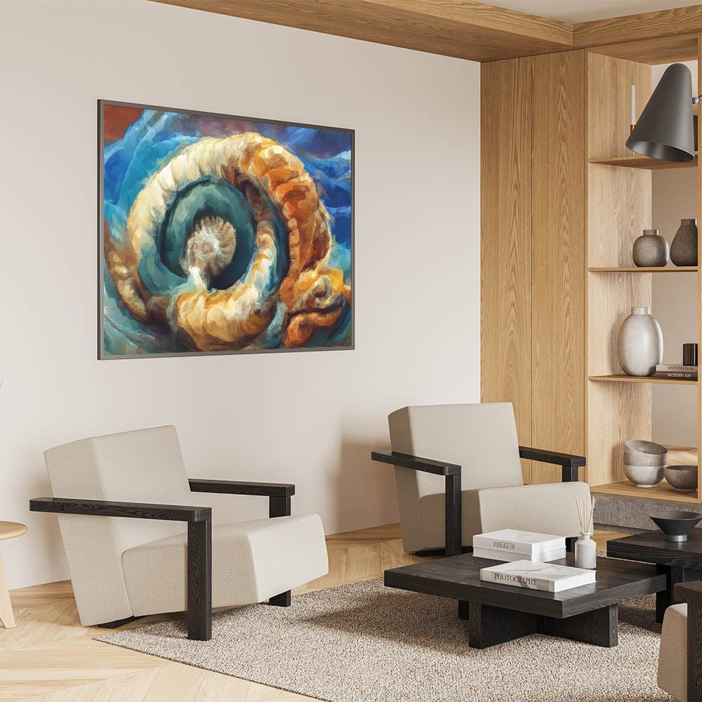 Bring the allure of the ocean into your living space with our mesmerizing Fluid Abstract Wall Art from the Modern Fluid Art Prints collection. Featuring an elegant spiral shell-inspired design, this abstract fluid canvas art combines tranquil shades of blue, rich orange accents, and soothing earth tones to create a stunning visual centerpiece.
