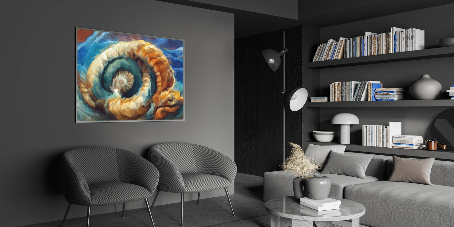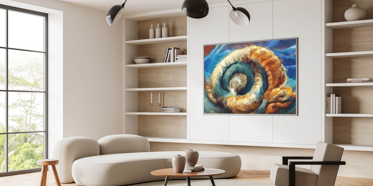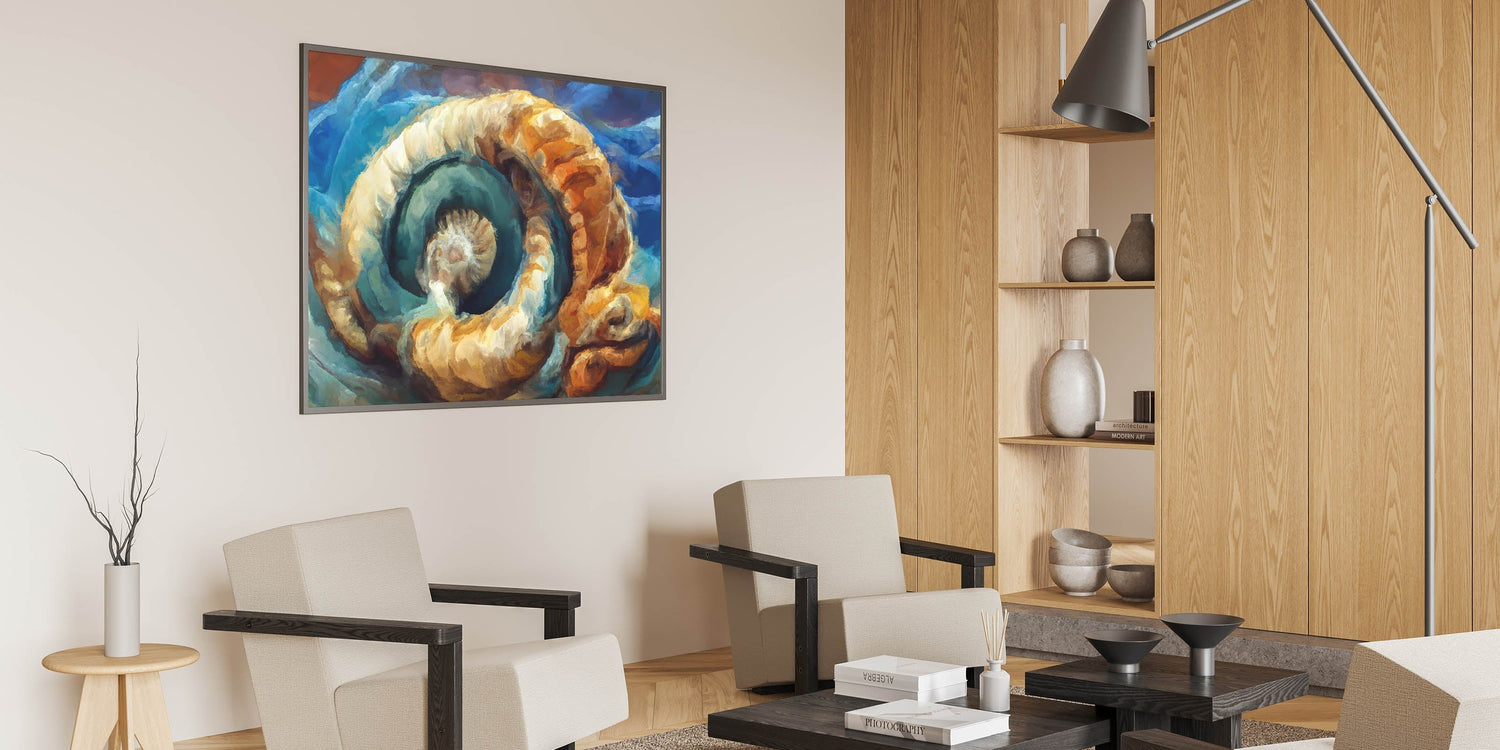 Bring the allure of the ocean into your living space with our mesmerizing Fluid Abstract Wall Art from the Modern Fluid Art Prints collection. Featuring an elegant spiral shell-inspired design, this abstract fluid canvas art combines tranquil shades of blue, rich orange accents, and soothing earth tones to create a stunning visual centerpiece.