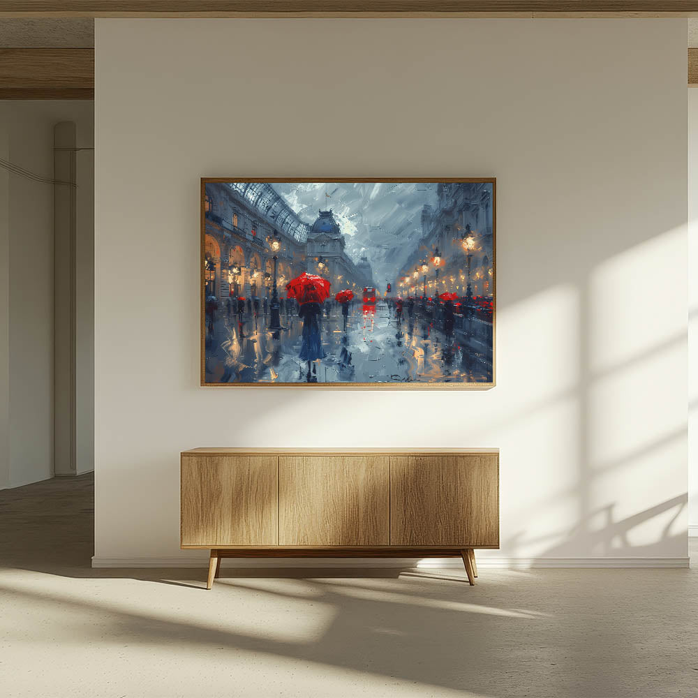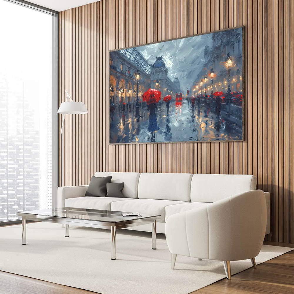 Modern Landscape Abstract - Red Umbrellas in Rainy Cityscape Canvas Art