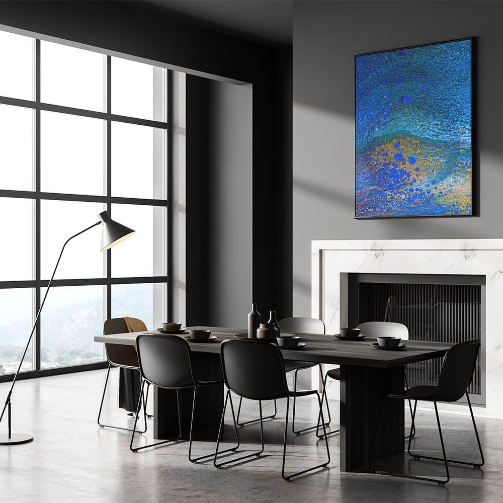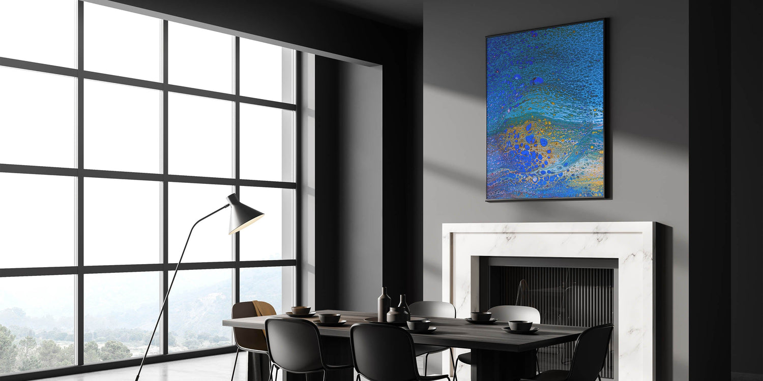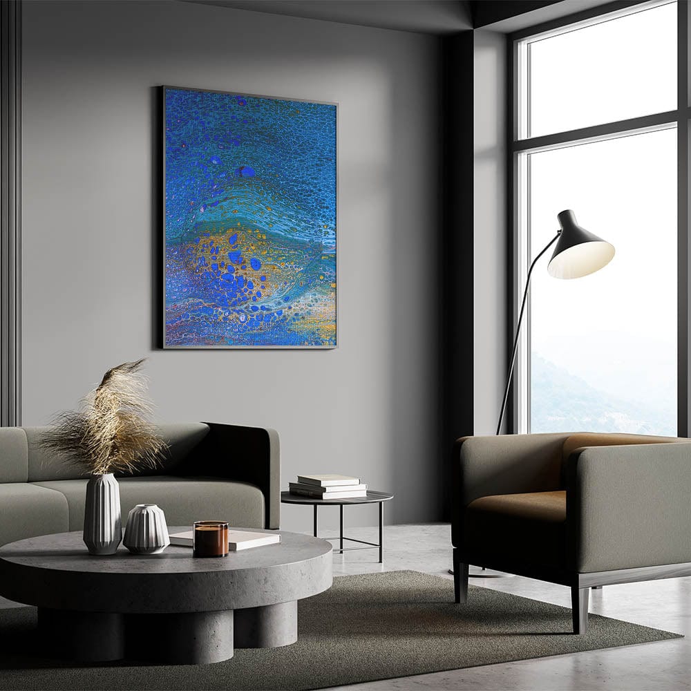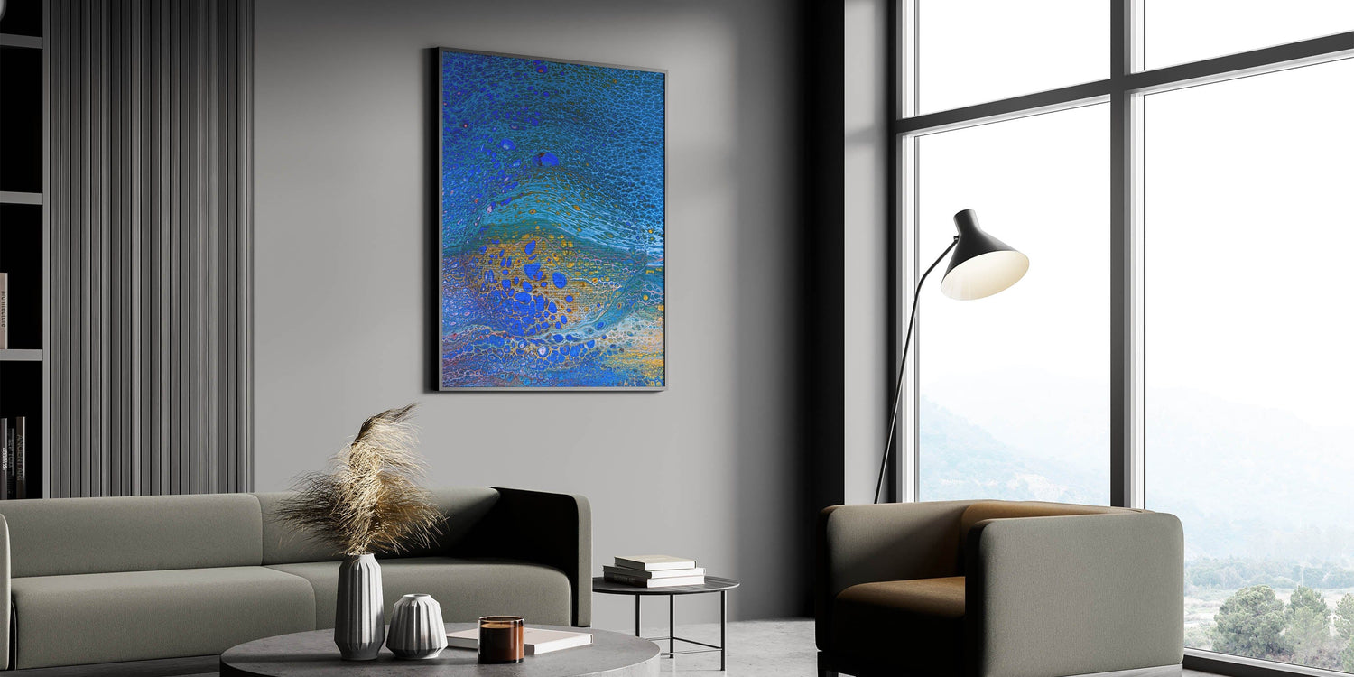 Bring the beauty of the ocean into your space with this ocean-inspired fluid art print. Featuring mesmerizing shades of royal blue, shimmering gold, and soft aqua, this abstract coastal wall decor captures the essence of fluid movement and natural elegance. The intricate textures and dynamic patterns create a visually striking masterpiece.
