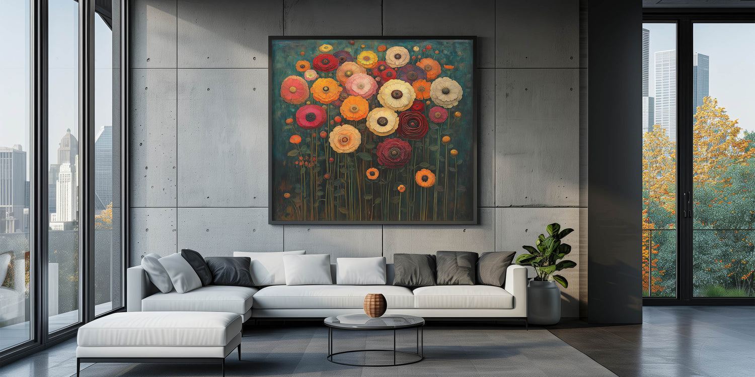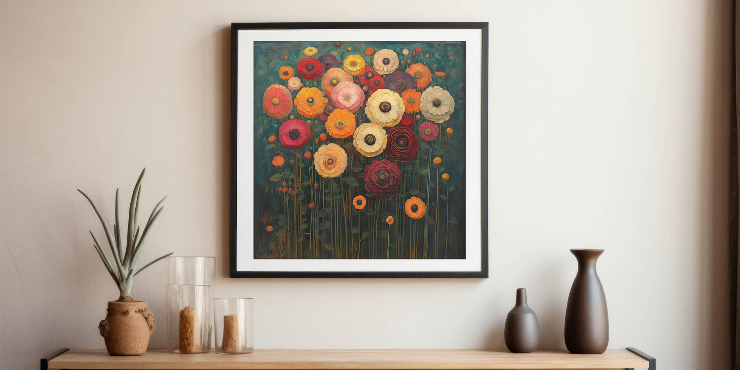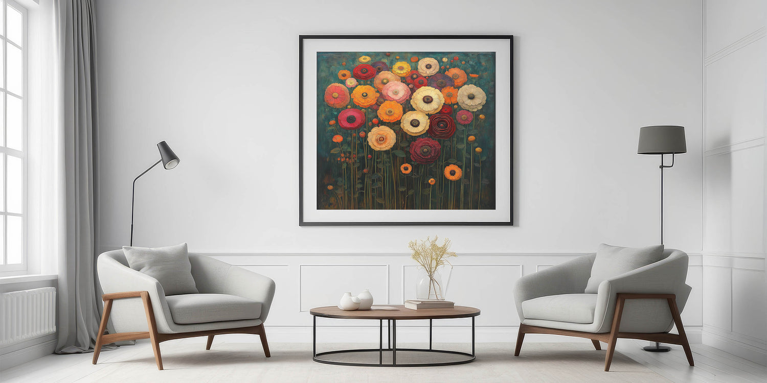 - High-quality abstract floral artwork for home decor available in multiple sizes and materials
