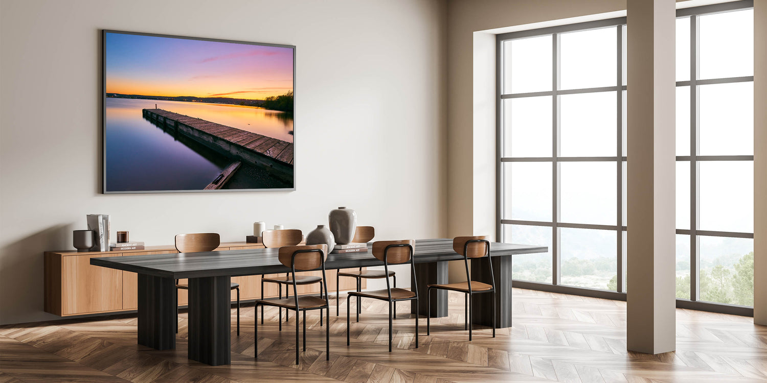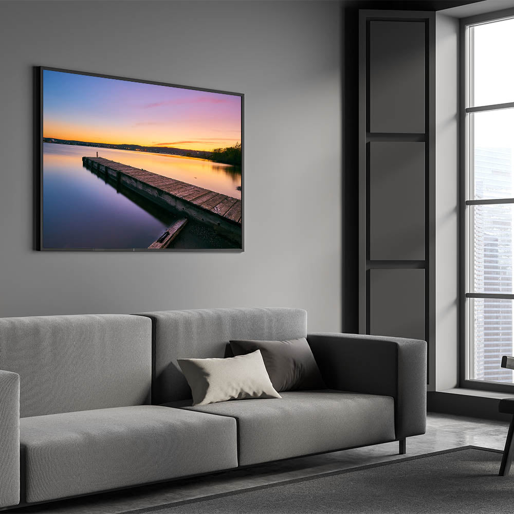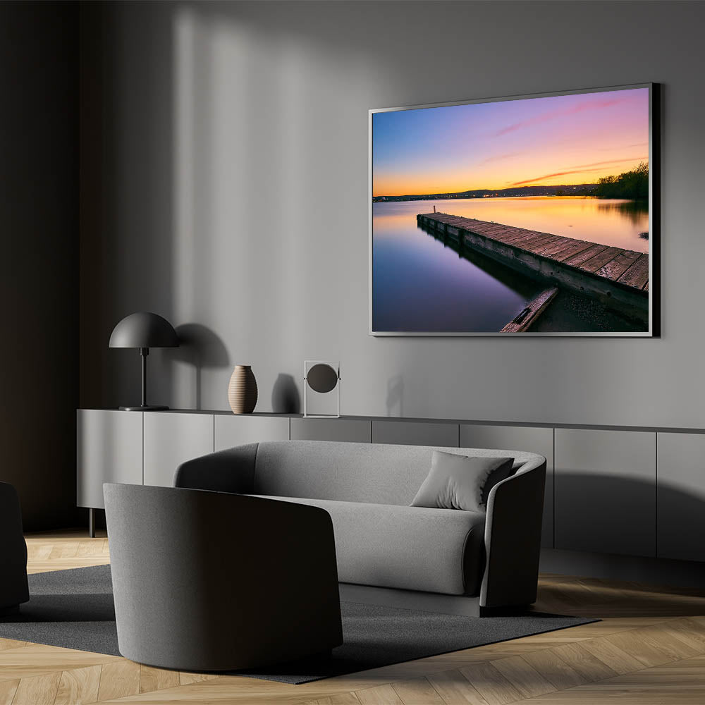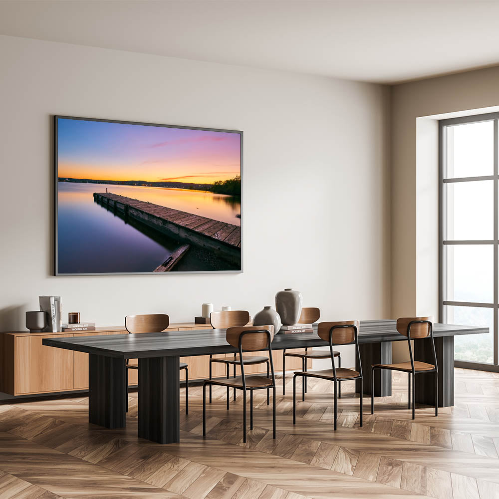 Capture the essence of Minnesota’s tranquil beauty with this breathtaking wall art featuring a serene sunset over a peaceful lake. This Minnesota wall art showcases the captivating colors of dusk, blending vibrant hues that reflect off calm waters and highlight the rustic charm of the wooden dock. Ideal for any living room, bedroom, or office, this high-quality Minnesota landscape art brings a sense of peace and natural beauty to your space.