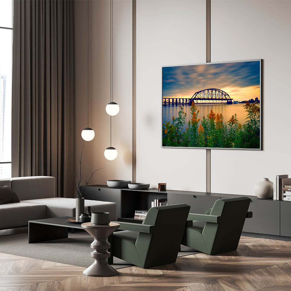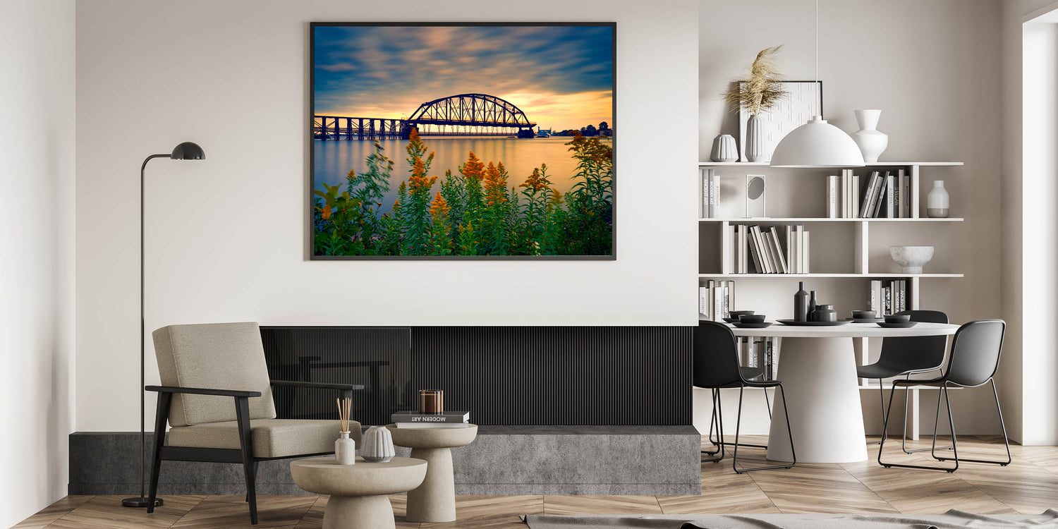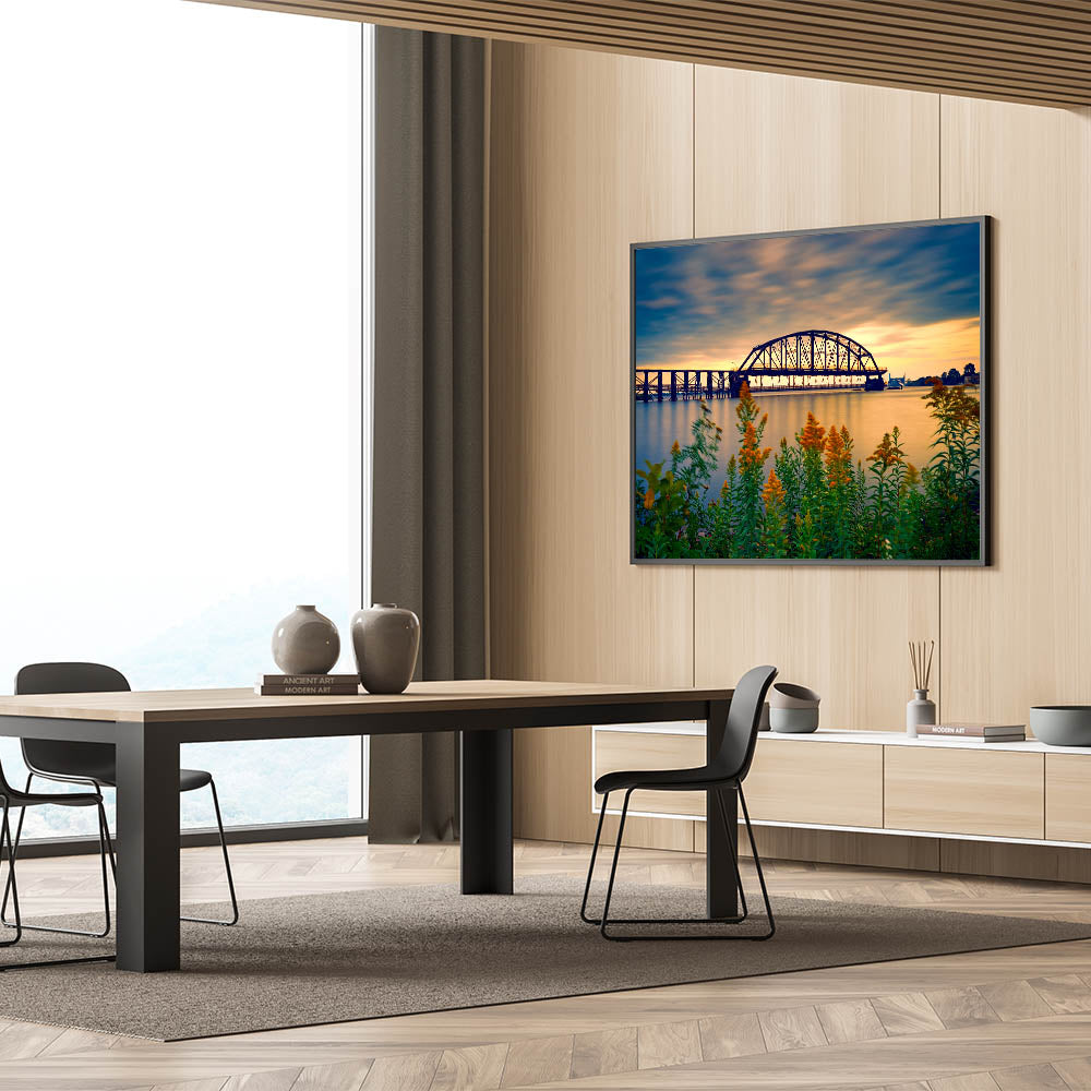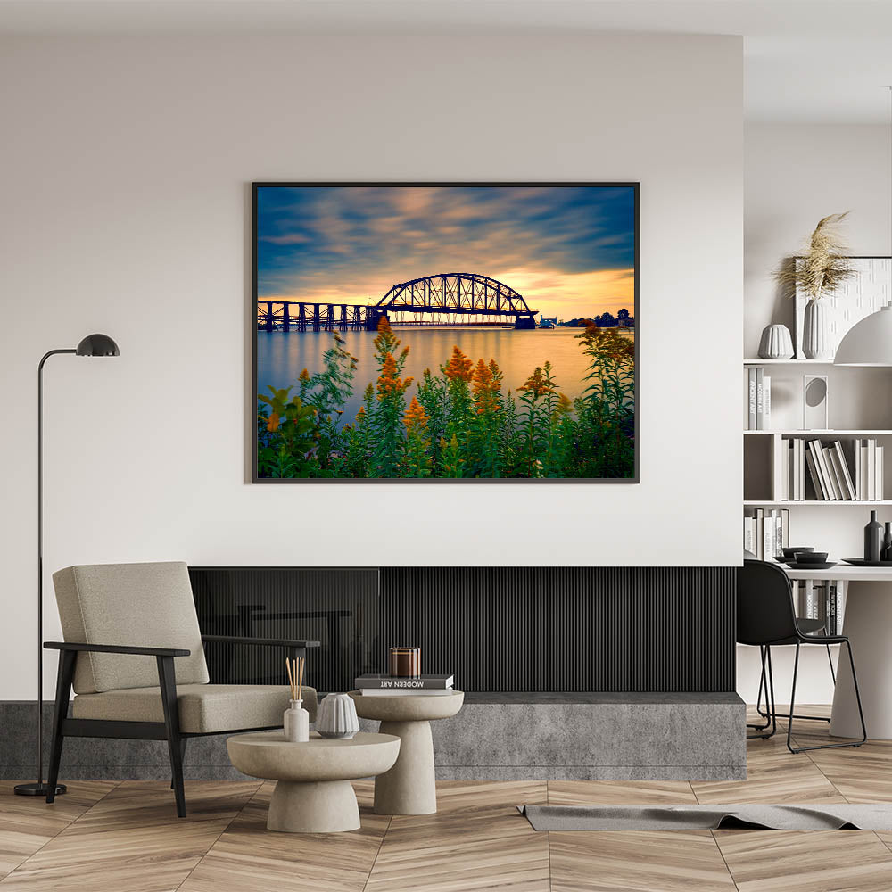 Bring the tranquil beauty of Missouri’s natural landscapes into your space with this captivating St. Louis wall art. Featuring a historic bridge framed by vibrant wildflowers and a warm sunset sky, this piece captures a peaceful moment along the river. The combination of architectural strength and natural beauty makes this artwork perfect for those who appreciate scenic views and serene decor.