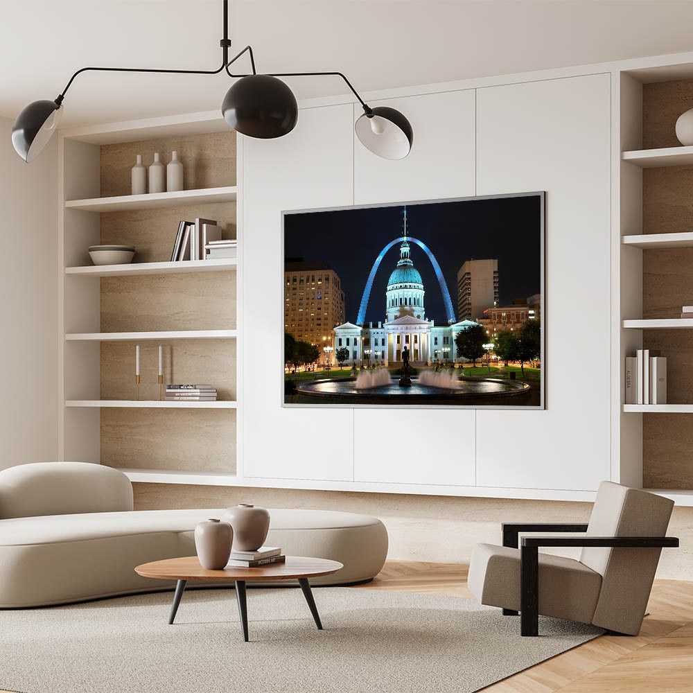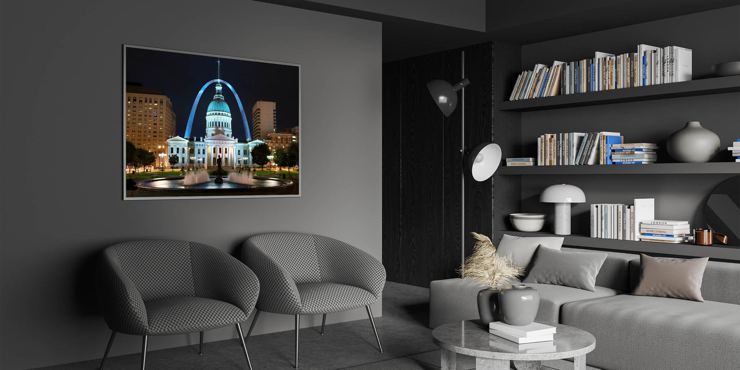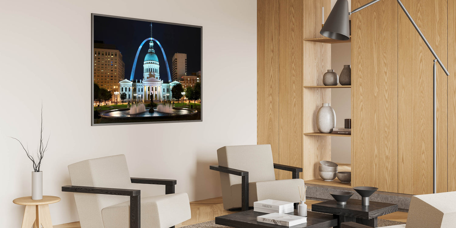 Capture the stunning beauty of St. Louis at night with this captivating wall art featuring the illuminated Gateway Arch and historic Old Courthouse. This Missouri Scenic Print showcases the city’s architectural grandeur, blending modern design with historical charm. The soft glow of city lights against the deep night sky creates an inviting ambiance, perfect for elevating any room’s decor.