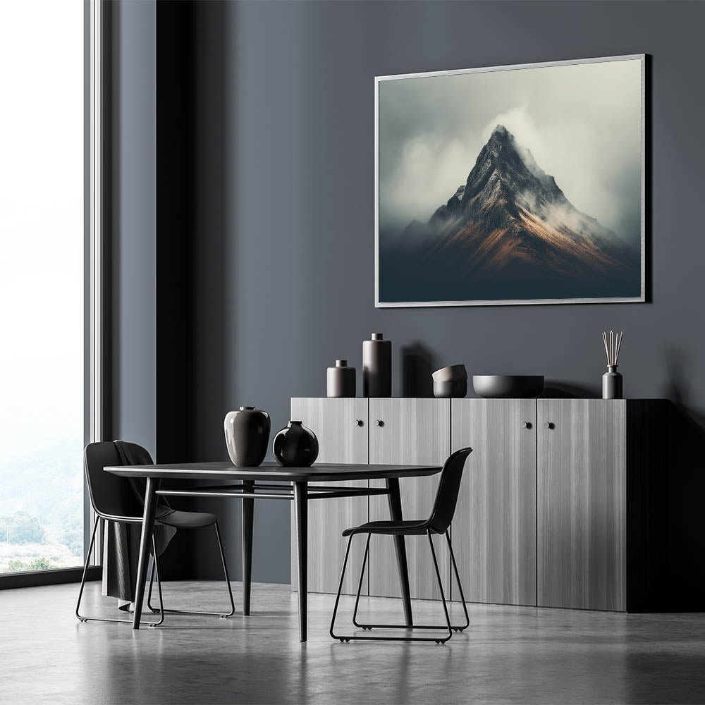 Elevate your space with the striking beauty of this Misty Mountain Peak Art, a dramatic piece that captures the awe-inspiring power of nature. This image showcases a towering mountain peak shrouded in ethereal fog, creating a captivating contrast between the rugged terrain and the soft mist. The play of light and shadow adds depth and intensity, making it an ideal centerpiece for any room that seeks to evoke a sense of strength and serenity.