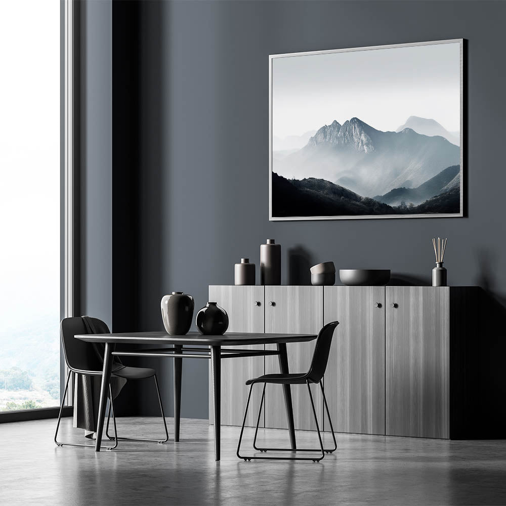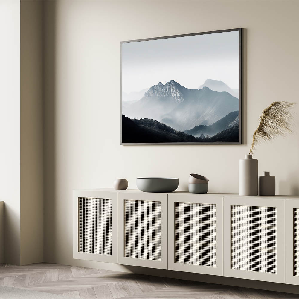 Immerse yourself in the tranquil beauty of nature with our Misty Mountain Range Art. This stunning artwork captures a peaceful mountain range shrouded in soft mist, creating a sense of depth and serenity. The muted tones and gentle fog evoke a calm and reflective atmosphere, making this piece a perfect addition to any space seeking tranquility and elegance.