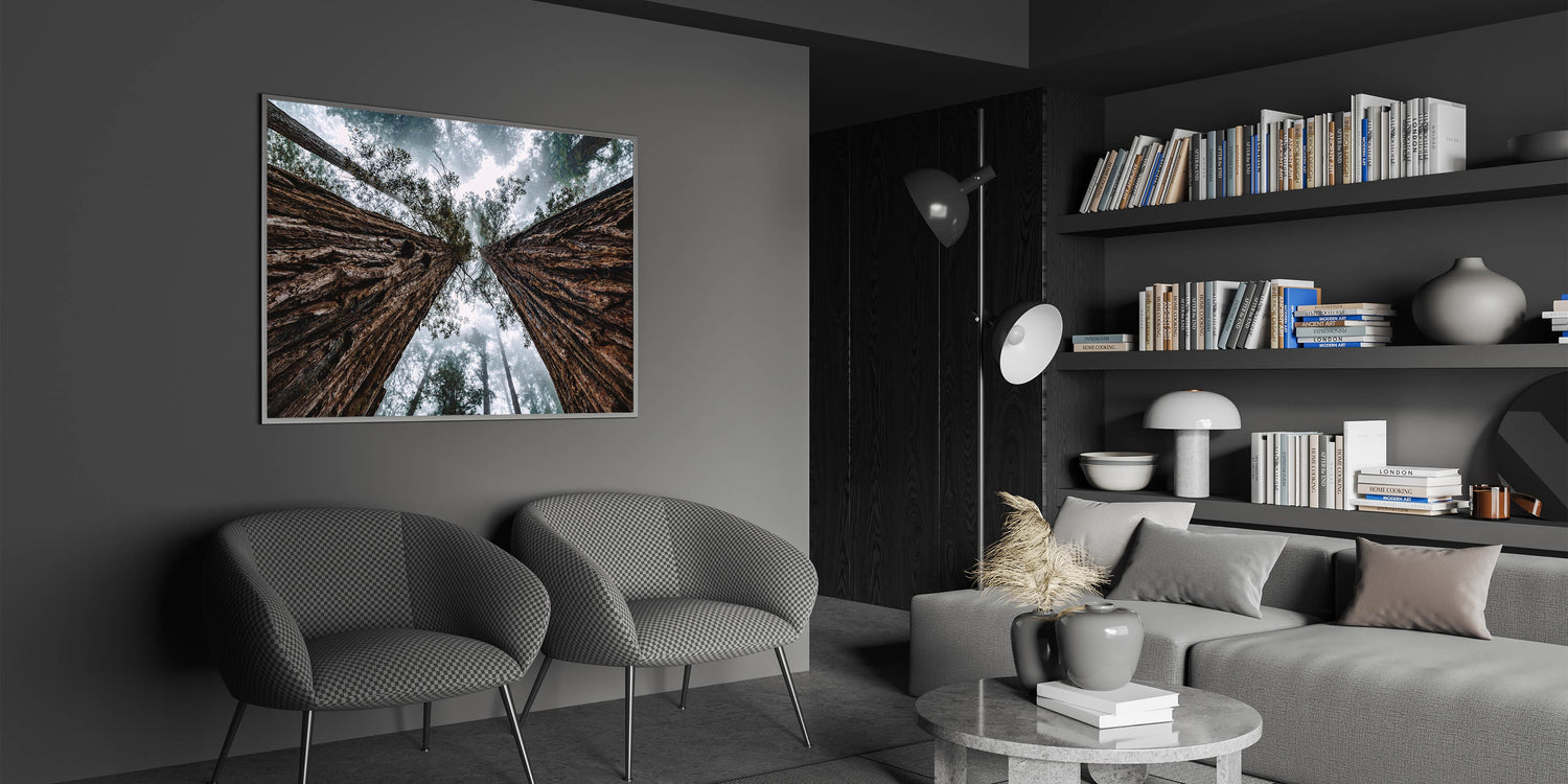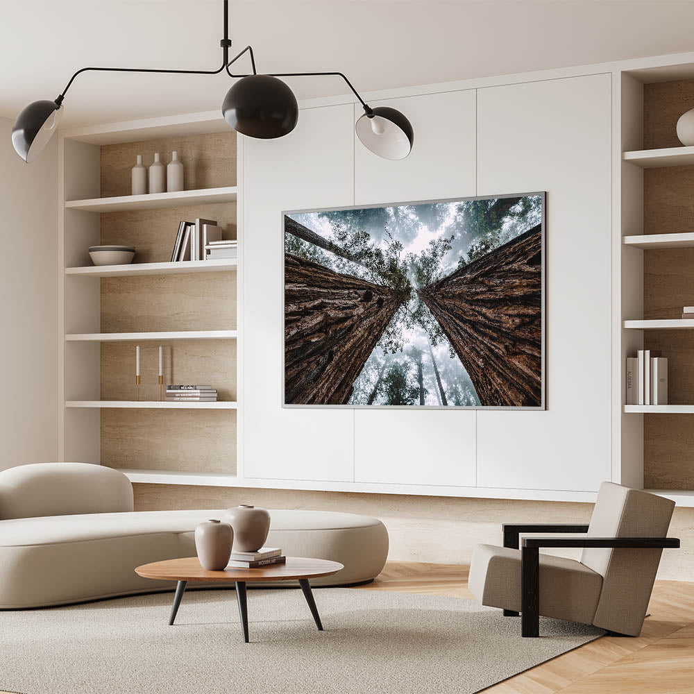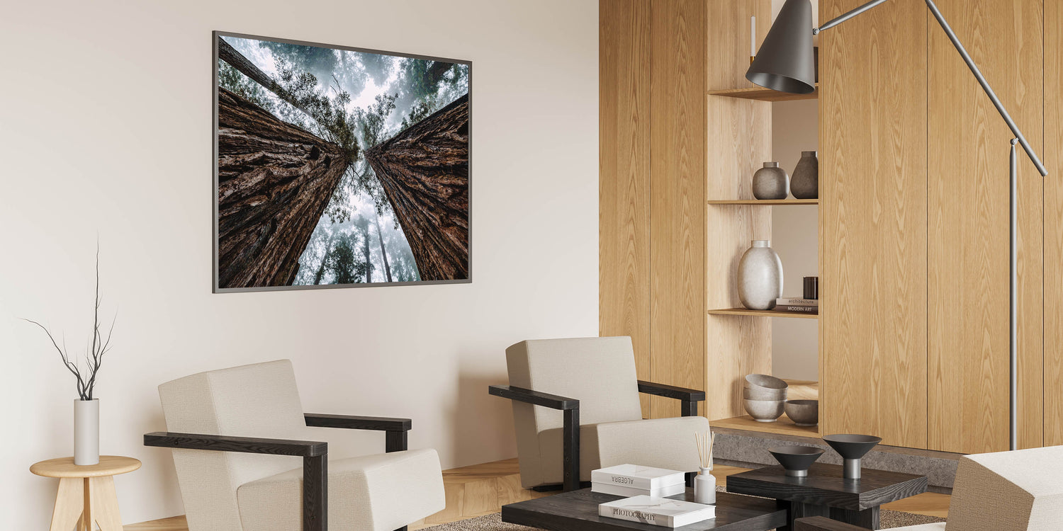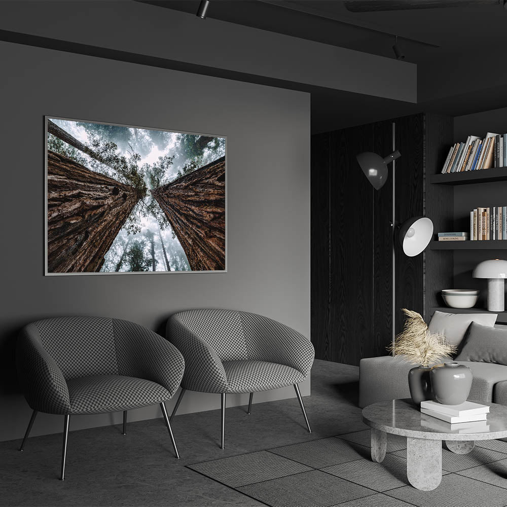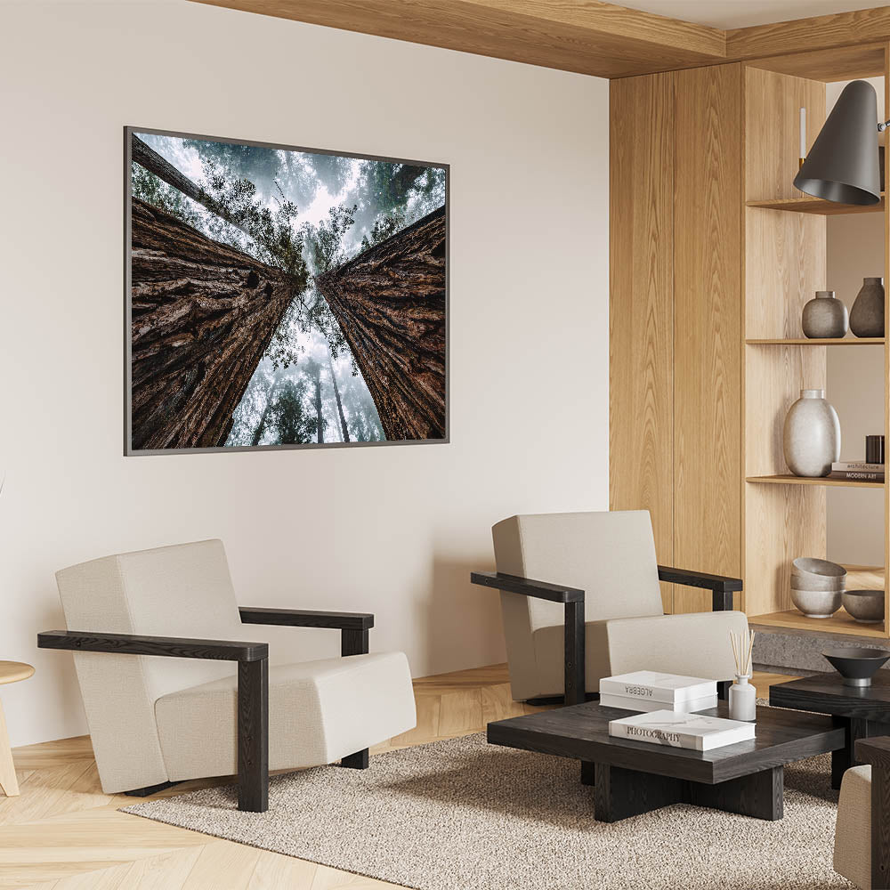 Elevate your space with the awe-inspiring grandeur of our Towering Redwood Trees in Mist Art. This captivating artwork offers a unique perspective from the forest floor, looking up at the towering redwood trees as they reach into the mist-covered sky. The intricate textures of the ancient bark contrast beautifully with the soft, ethereal fog, creating a stunning visual experience that captures the majesty of nature in its purest form.