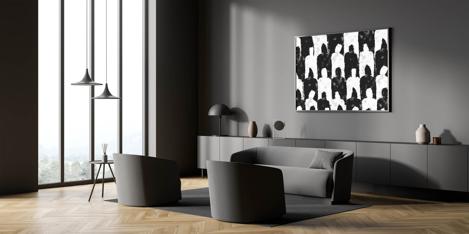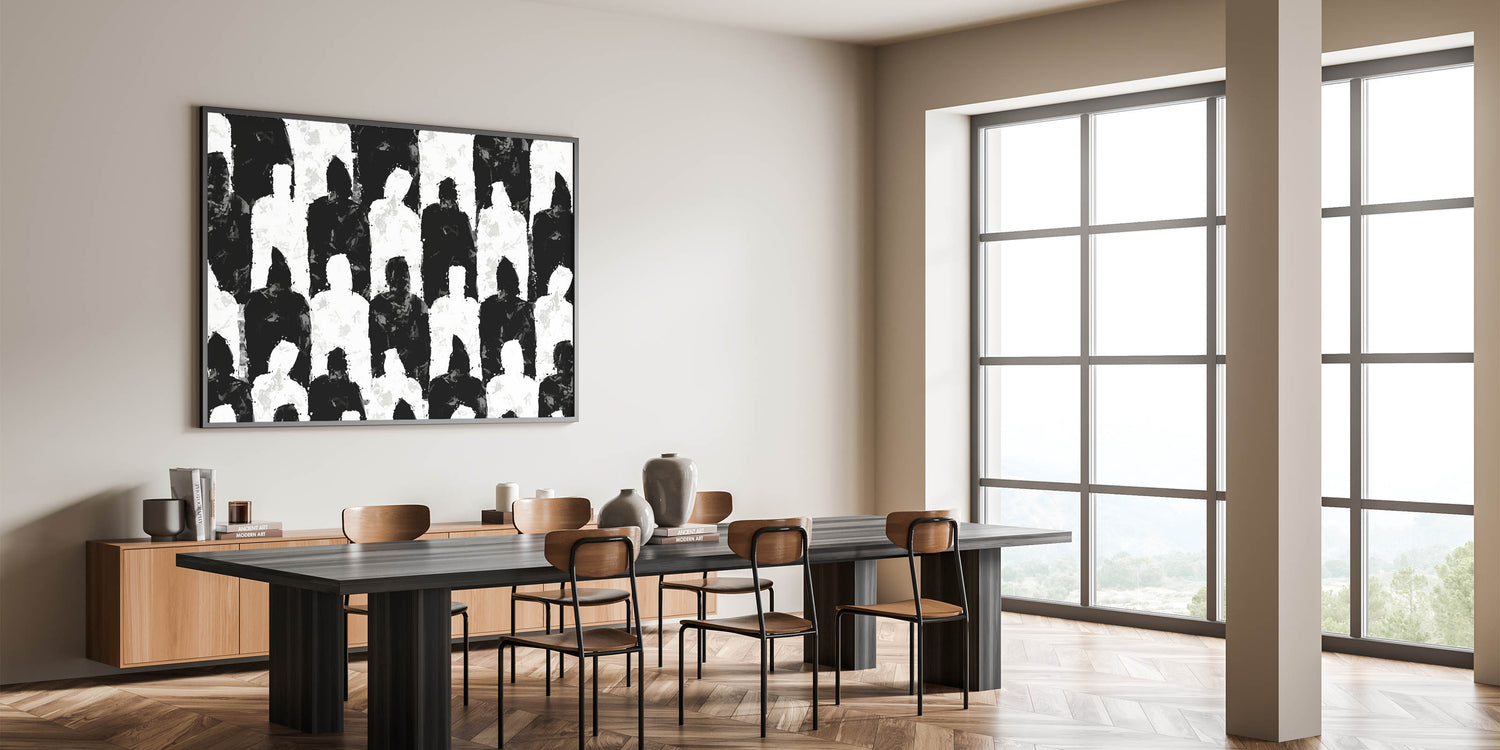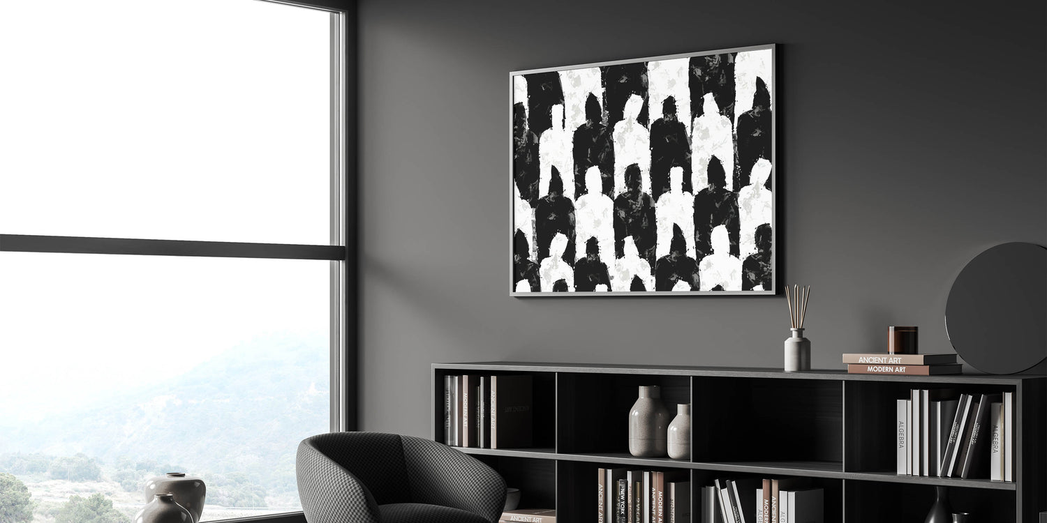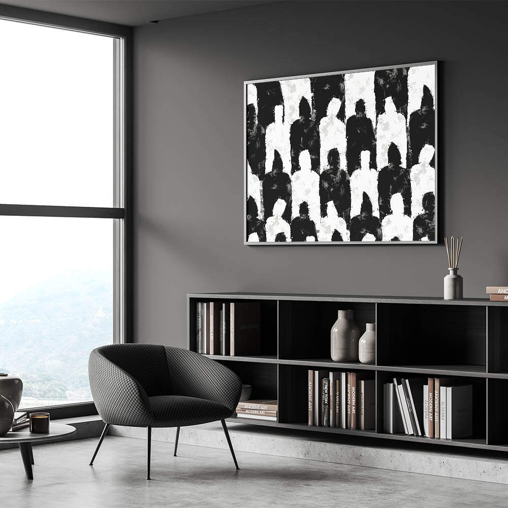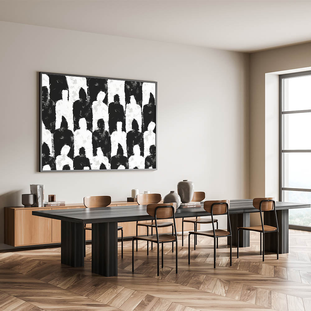 Introduce a bold statement to your space with this artistic black and white silhouette canvas. This modern abstract art piece features an intriguing pattern of alternating black and white human silhouettes, creating a visually compelling composition. The unique design and intricate details make this artwork a perfect addition to any contemporary decor.
