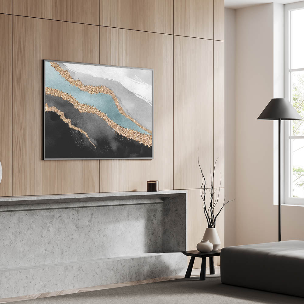 Elevate your space with the dramatic elegance of this "Black & Gold Strokes & Lines" abstract canvas art. This striking piece features bold black and soft gray tones, interwoven with a subtle teal accent and shimmering gold lines that create a sense of depth and movement. The combination of these rich colors and textures results in a modern and sophisticated artwork that makes a powerful statement in any room.