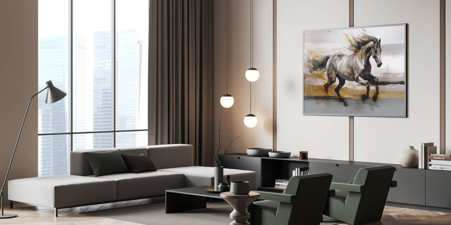 • Dynamic Design: The combination of strong, flowing lines and subtle color transitions captures the raw power and grace of the horse, making it a captivating focal point.