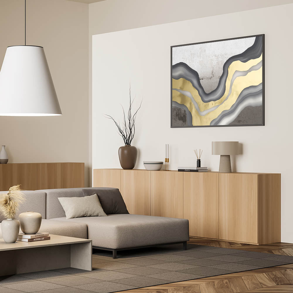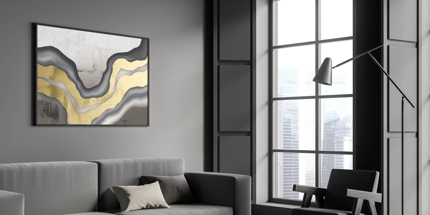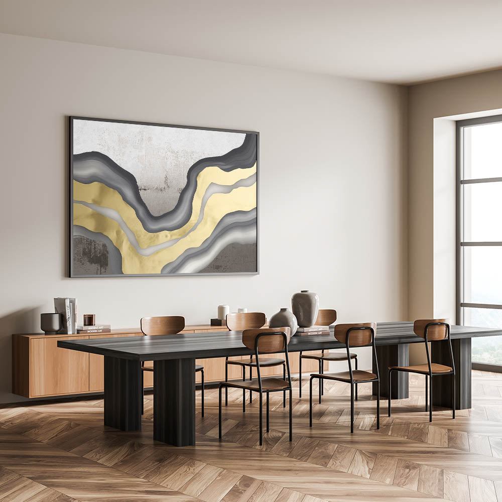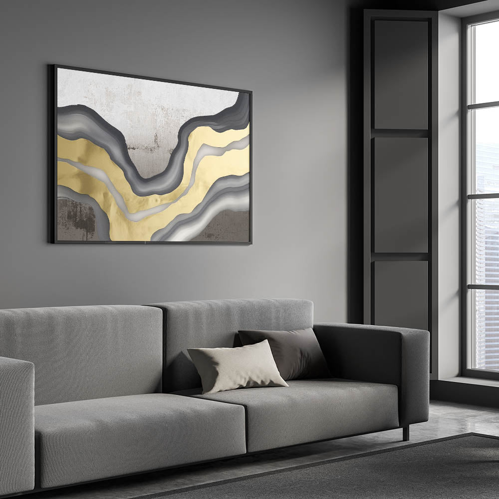 Elevate your interior decor with this striking gold and gray geometric line art. This modern abstract design features dynamic, layered strokes in luxurious gold and sleek gray, creating a sophisticated visual impact that’s perfect for contemporary spaces. The blend of metallic tones with deep gray hues adds depth and elegance, making this artwork an ideal centerpiece for living rooms, offices, or any stylish setting.