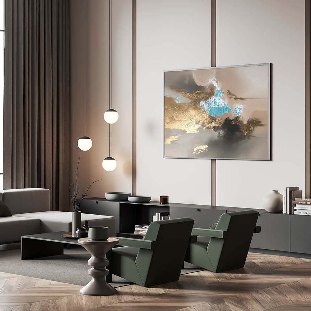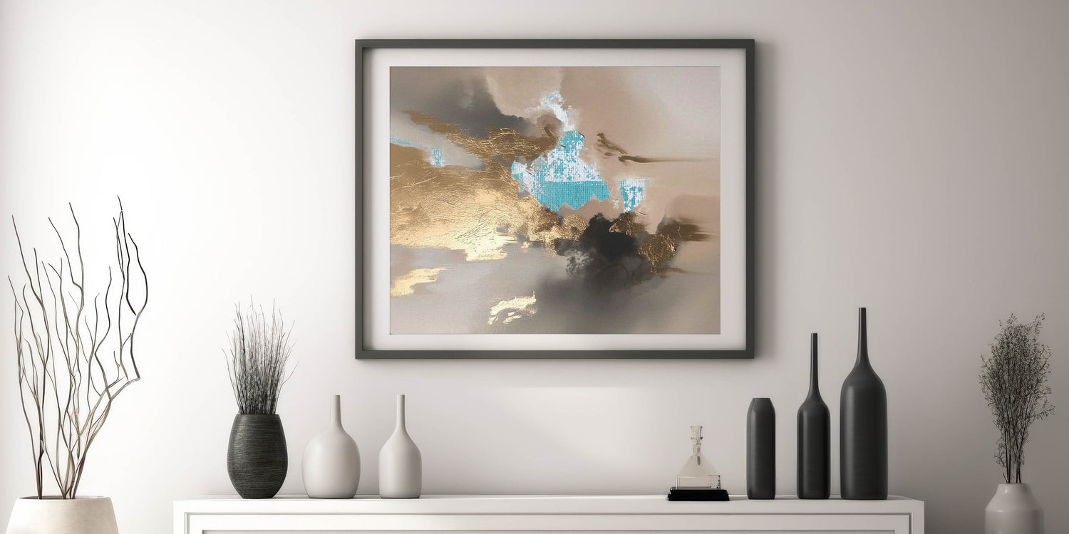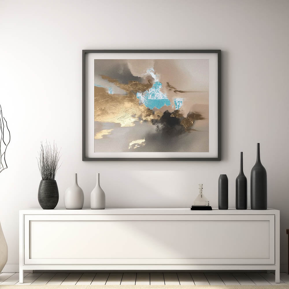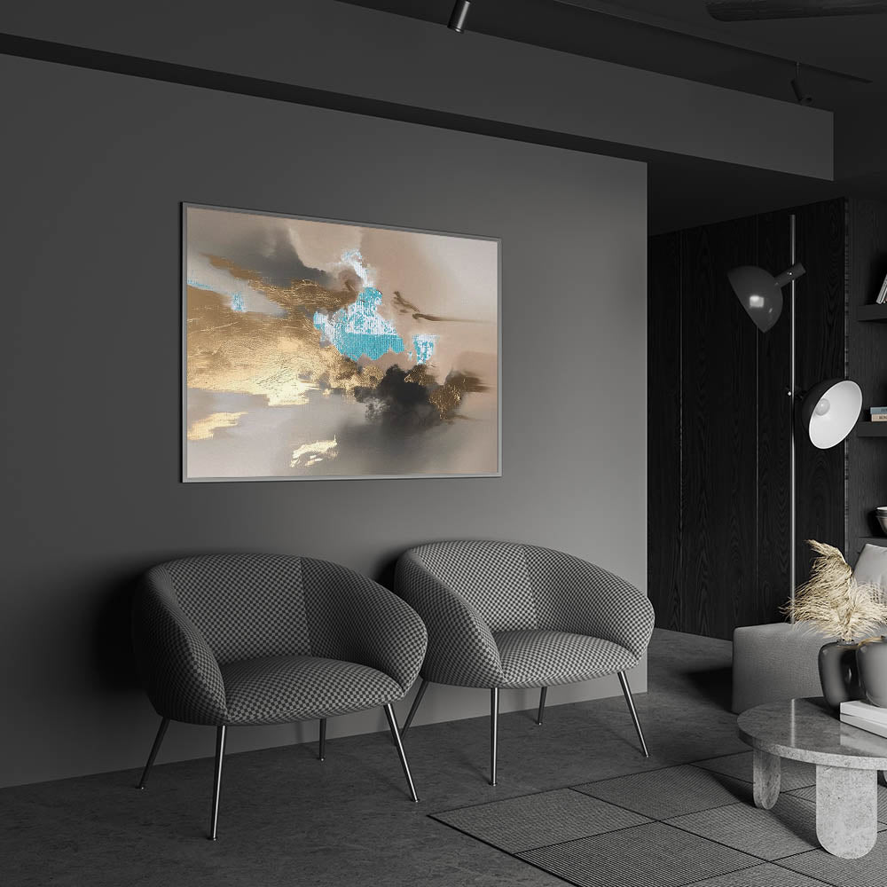 Enhance your decor with this stunning piece that combines the rich texture of gold with the soothing tones of beige and turquoise. Its graceful composition and luxurious feel make it a standout addition to any art collection.