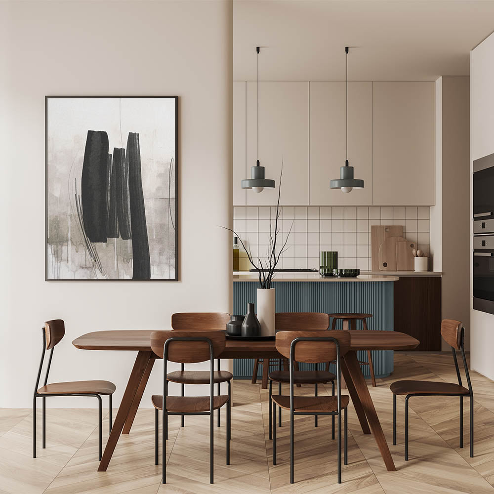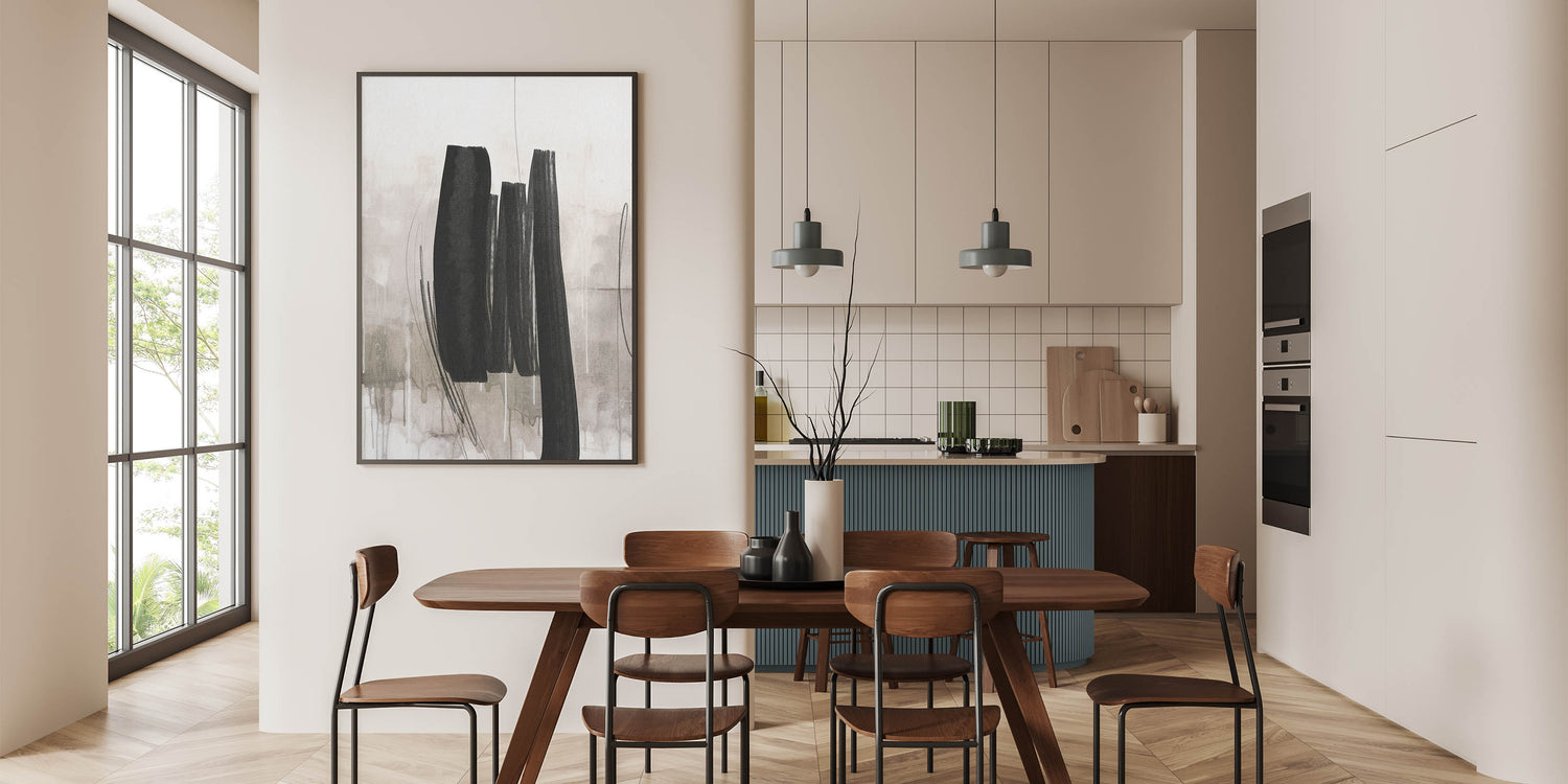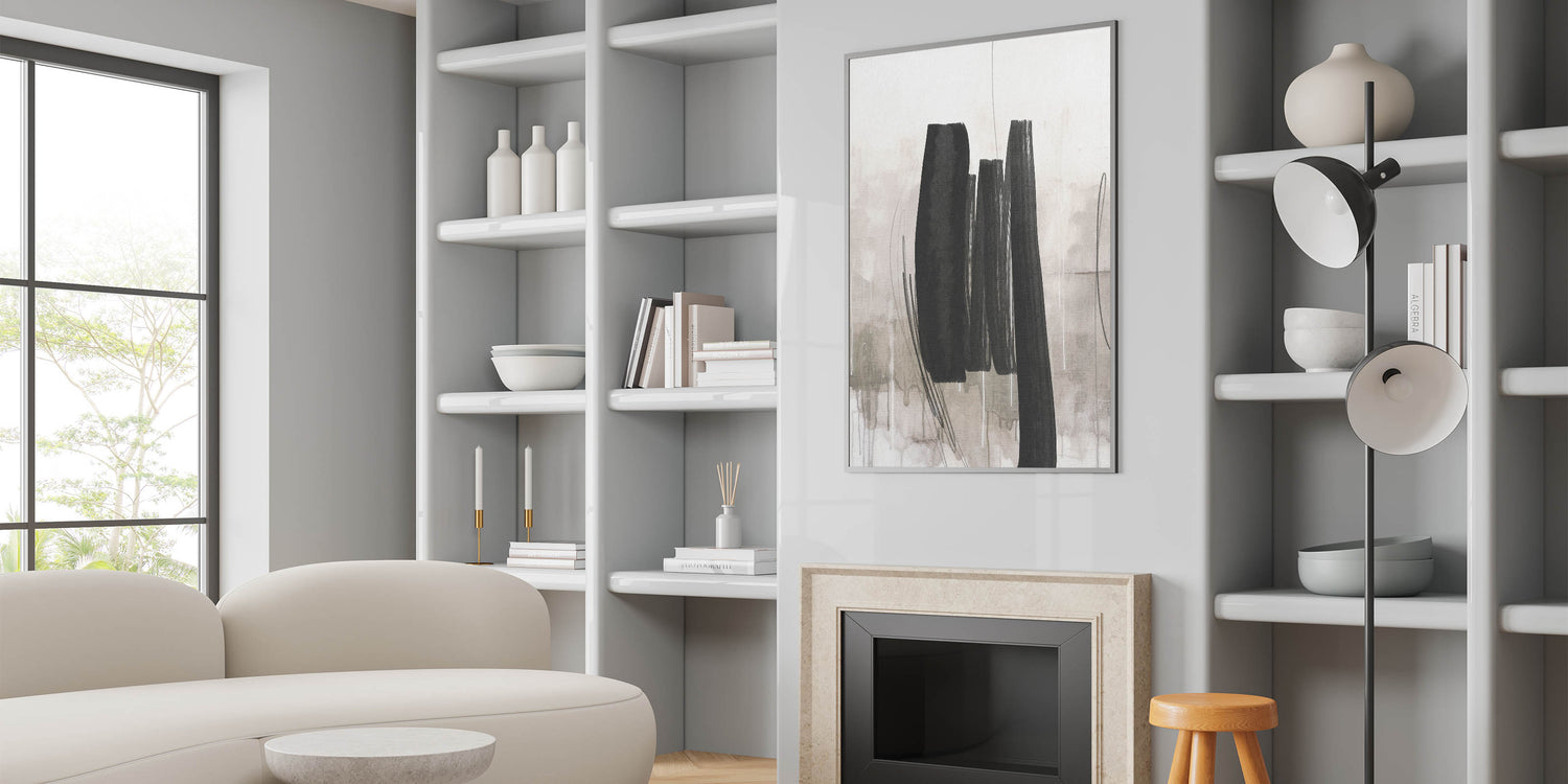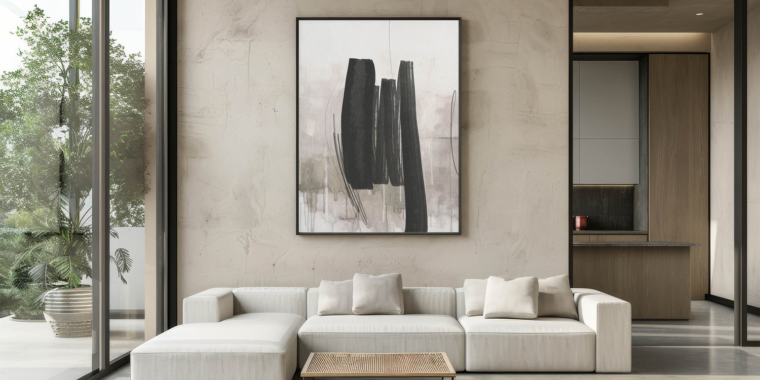- Design: Modern abstract painting with bold black brushstrokes on a soft, neutral background.