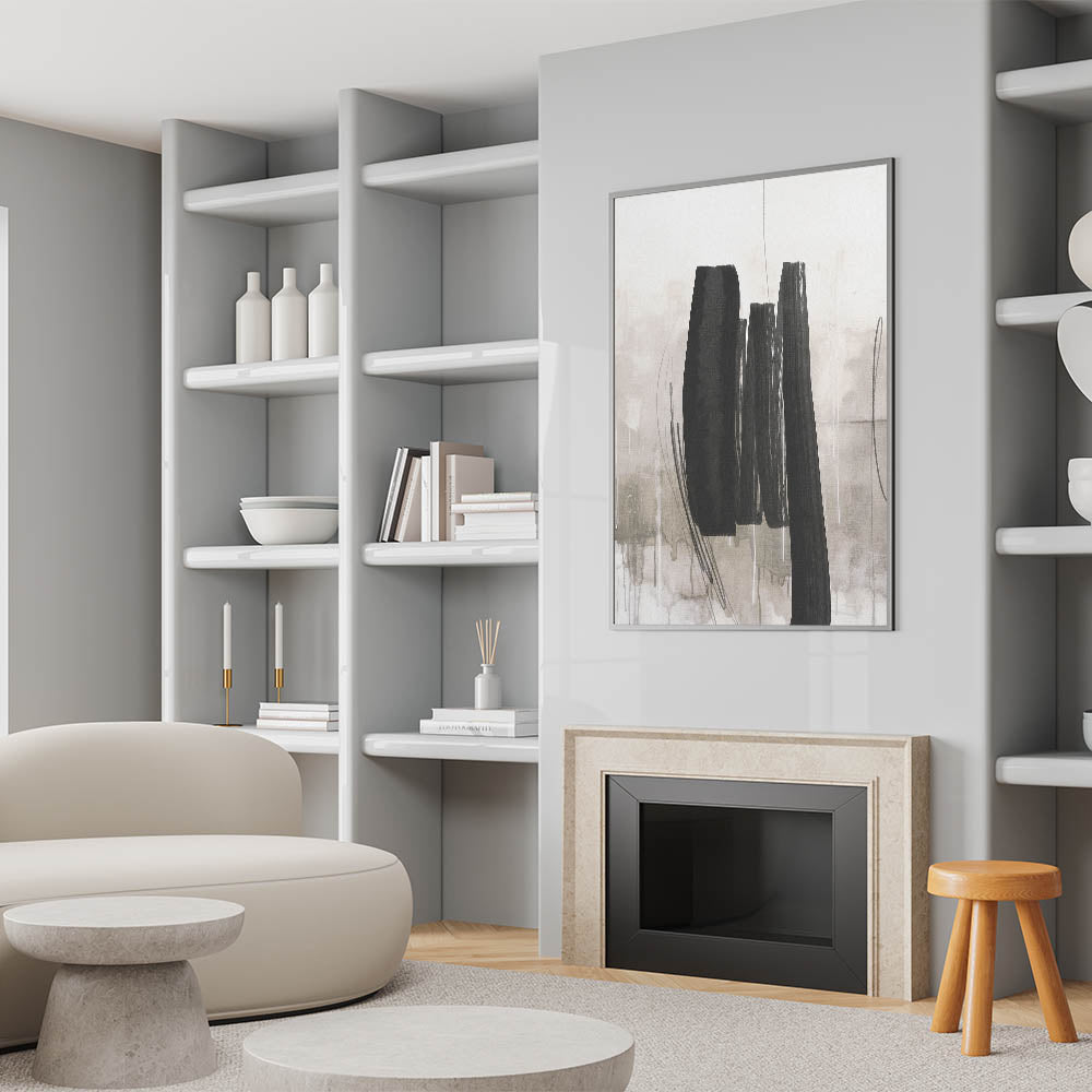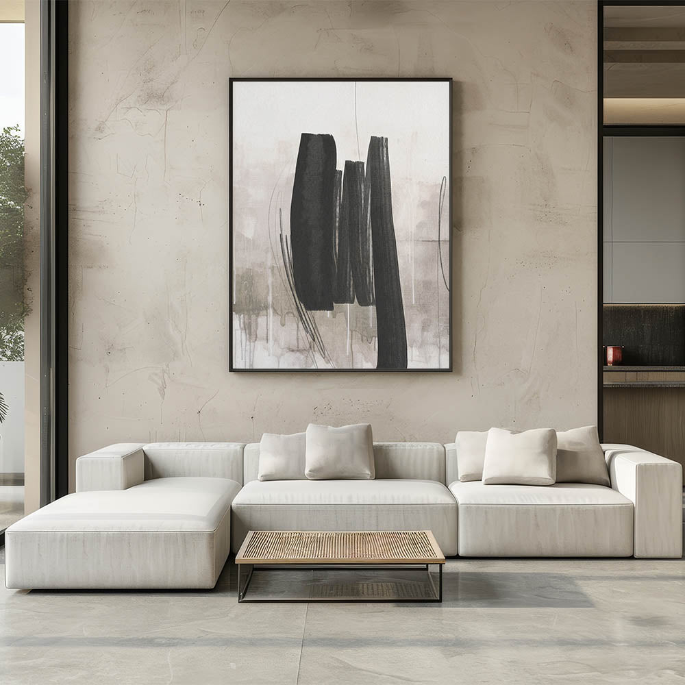 Introduce a sense of refined simplicity to your space with this minimalist black brushstroke abstract wall art. The design features bold, vertical brushstrokes in deep black, set against a soft beige and gray-toned background, creating a striking contrast that embodies the essence of modern minimalism. Perfect for those who appreciate clean lines and a subtle yet impactful design, this artwork is ideal for enhancing contemporary, minimalist, or industrial interiors. Whether displayed in a living room, office, or bedroom, this piece brings a sophisticated edge to any decor.