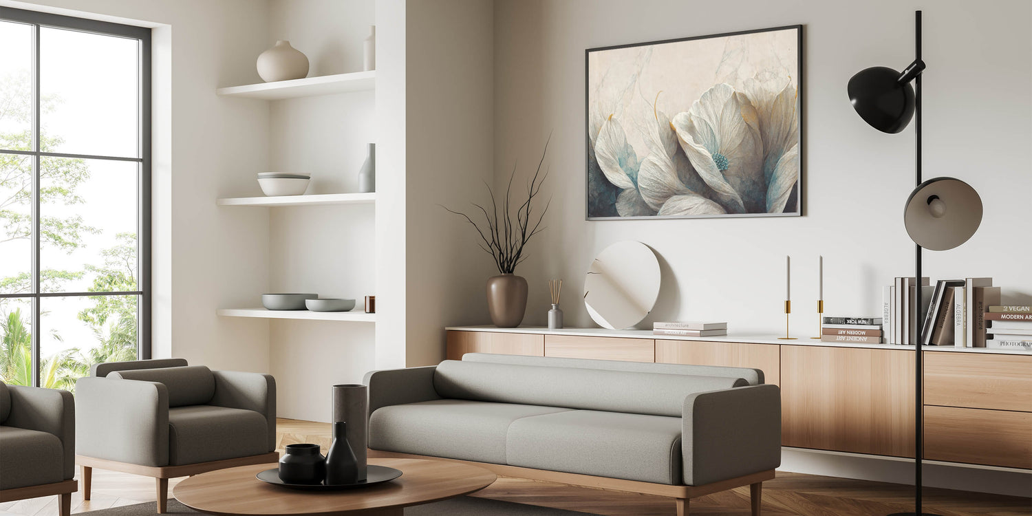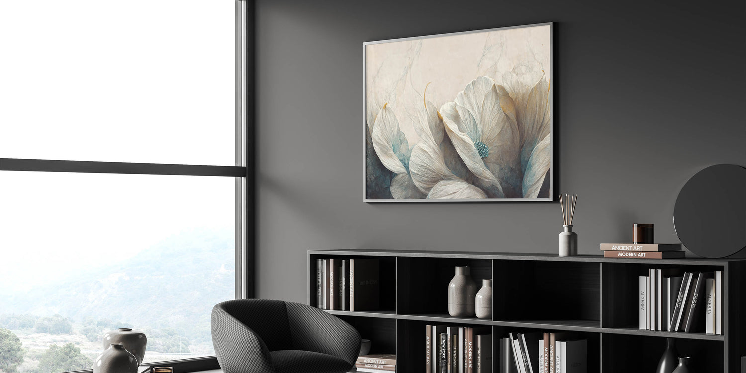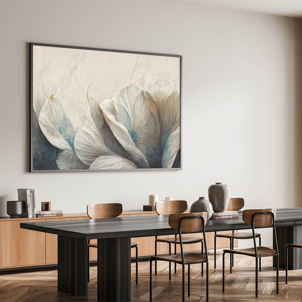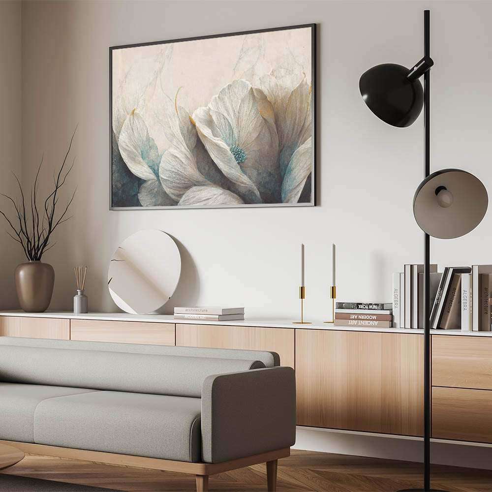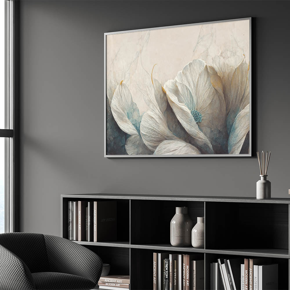 Bring a touch of serenity to your space with this beautiful piece of modern abstract florals wall art. The artwork showcases delicate floral elements in soft shades of white, teal, and beige, creating a calming and ethereal atmosphere. The gentle textures and soothing color palette make it an ideal choice for contemporary interiors seeking tranquility and elegance. Available in various formats, including stretched canvas, framed prints, and acrylic glass, this piece offers versatility and style. The geometric floral design and serene tones make it a perfect addition to living rooms, bedrooms, or offices, enhancing your decor with a peaceful and refined touch.