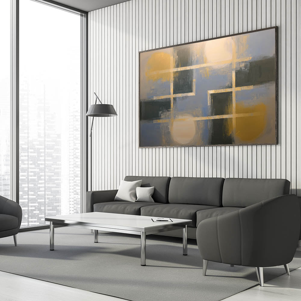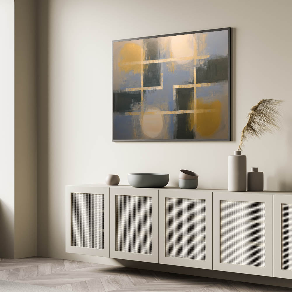 Elevate your home décor with this Living Room Wall Art, featuring a bold yet refined geometric composition in muted blue, deep green, and gold tones. This Modern Wall Art combines structured patterns with artistic brushstrokes, creating a visually dynamic and sophisticated piece, perfect for Modern Living Room Décor. The combination of intersecting lines and soft blended hues brings depth and contemporary elegance to any space.