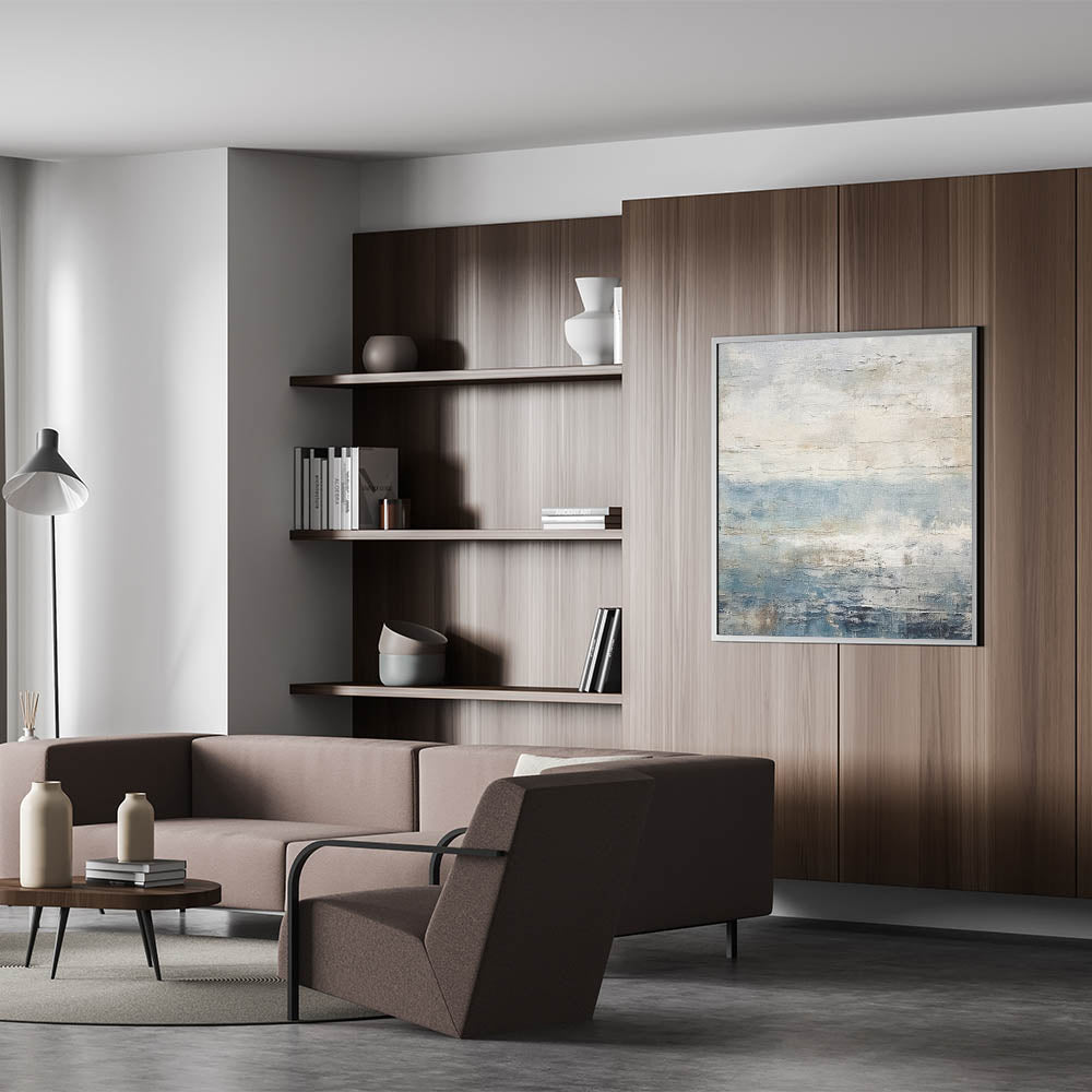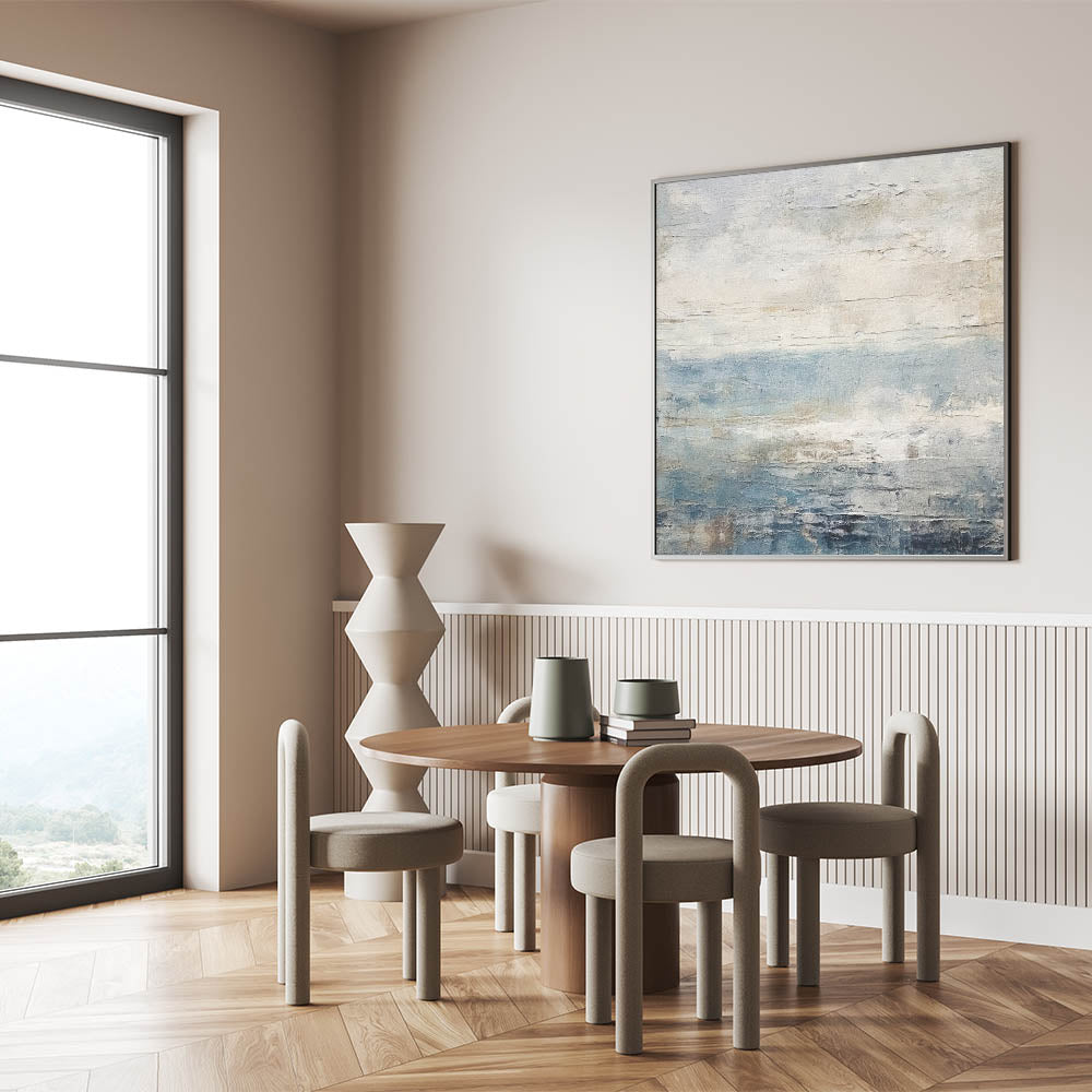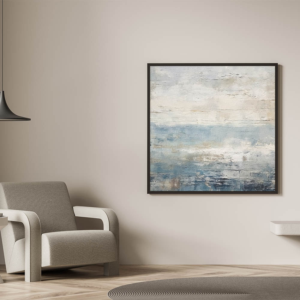 This modern abstract landscape captures the serene beauty of a calm ocean horizon. With soft shades of blue, beige, and light gray, this artwork reflects the tranquil essence of a seascape on a peaceful day. Its textured finish and gentle color transitions make it an ideal piece for contemporary and minimalist decor, bringing a touch of nature’s quiet elegance to any room.