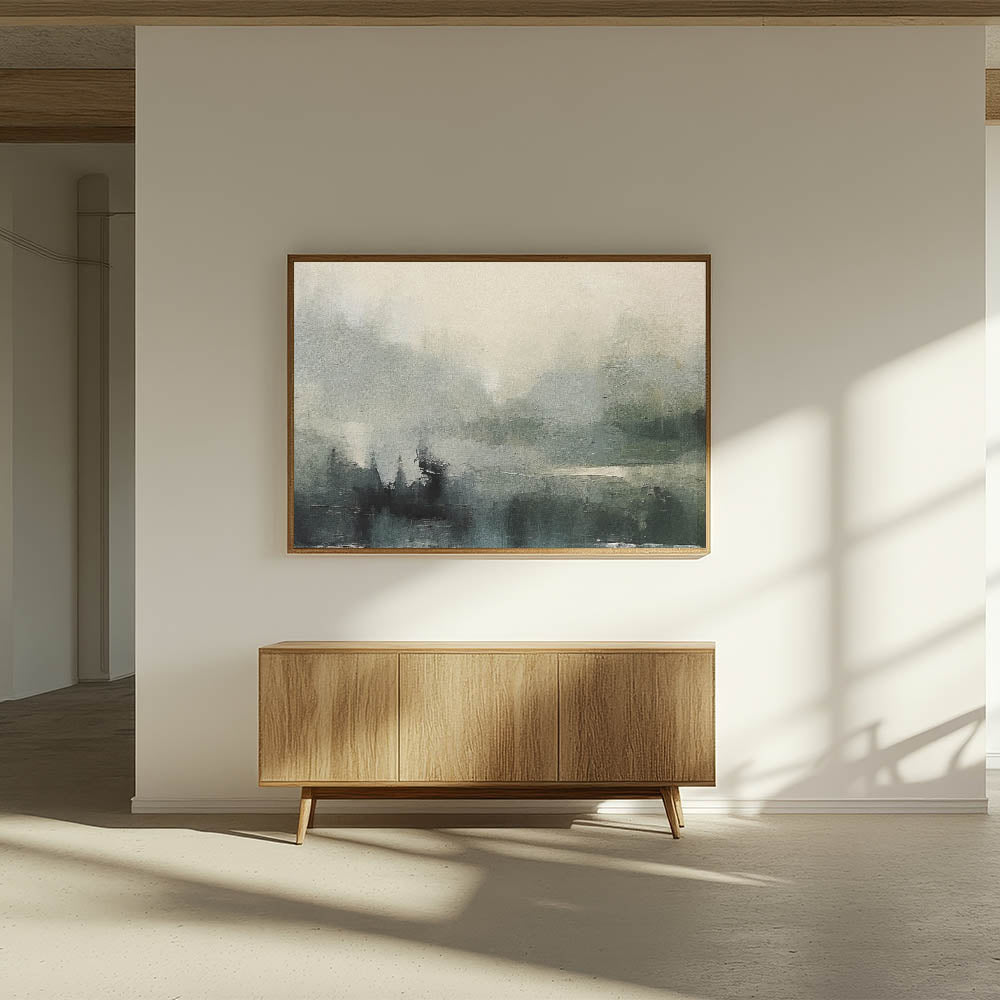 Embrace the calm and quiet beauty of a misty forest with this abstract landscape artwork. Featuring a blend of soft greens and grays, this piece evokes a tranquil morning in nature, with fog gently resting over a serene forest. Perfect for those who appreciate minimalist decor and earthy tones, this artwork adds a peaceful ambiance to any space, from living rooms to bedrooms.