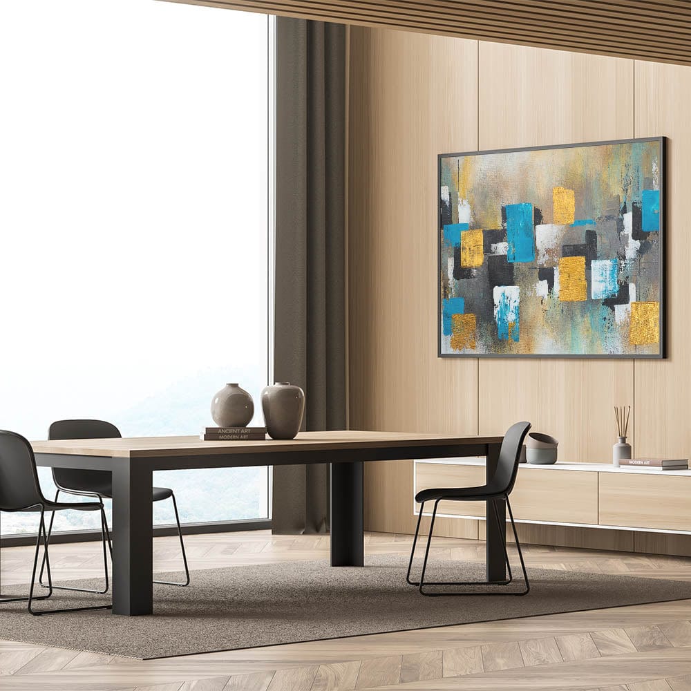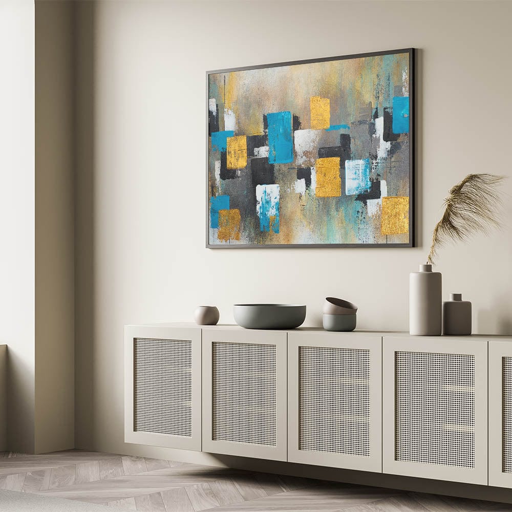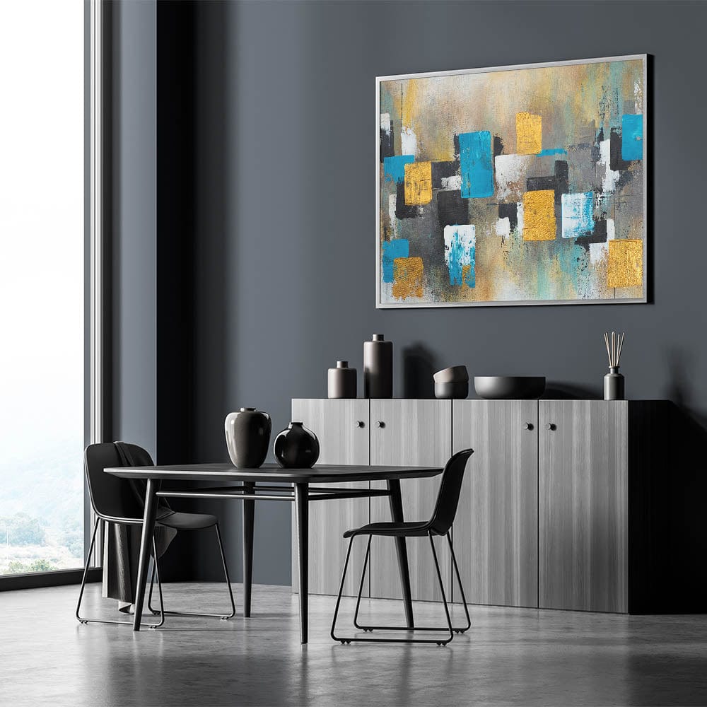 Transform your space with this modern abstract painting, a striking combination of teal, gold, black, and white. This moody modern wall art features bold geometric blocks layered with textured brushstrokes, creating a sense of movement and depth. The rich metallic gold accents contrast beautifully with the cool teal hues, making this abstract wall art a standout piece for contemporary interiors. Whether you prefer large abstract wall art for a grand statement or a smaller size for a stylish accent, this painting adds a sophisticated artistic touch to any setting.