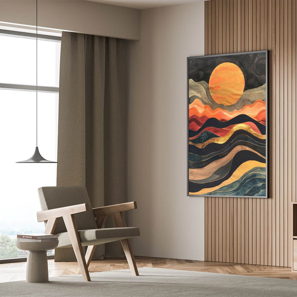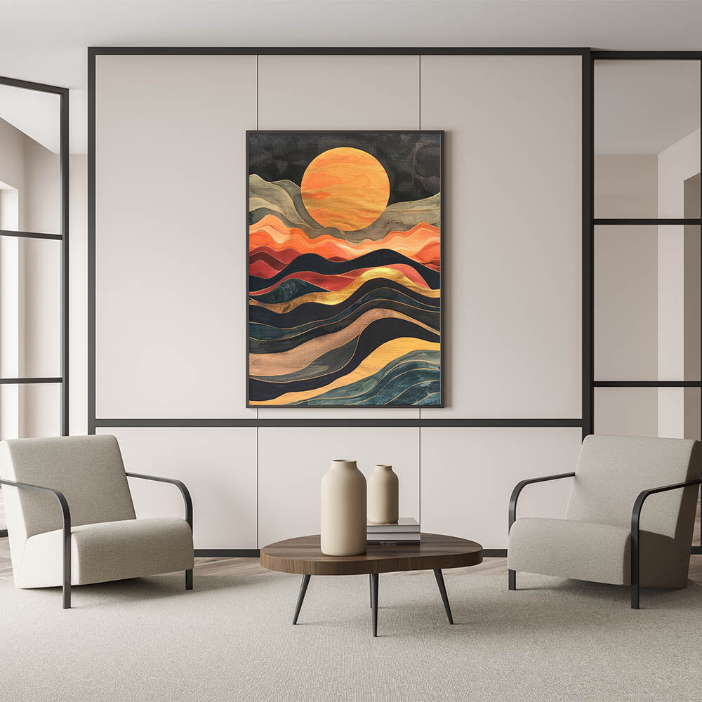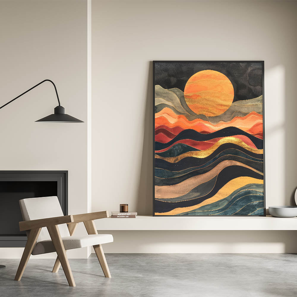 Enhance your living space with this Beautiful Sun Wall Art, showcasing a modern and abstract take on the sun. This unique piece features a large, glowing orange sun set against rich, rolling waves of black, red, and gold, evoking both warmth and movement. The layered lines create a sense of depth and elegance, making this Space-Themed Sun Print a bold yet refined addition to any room.