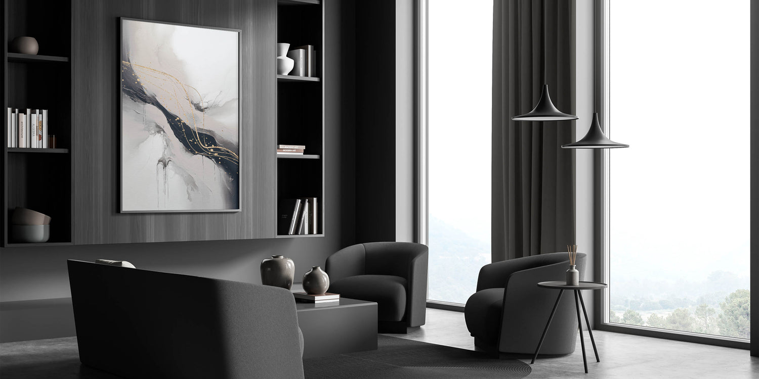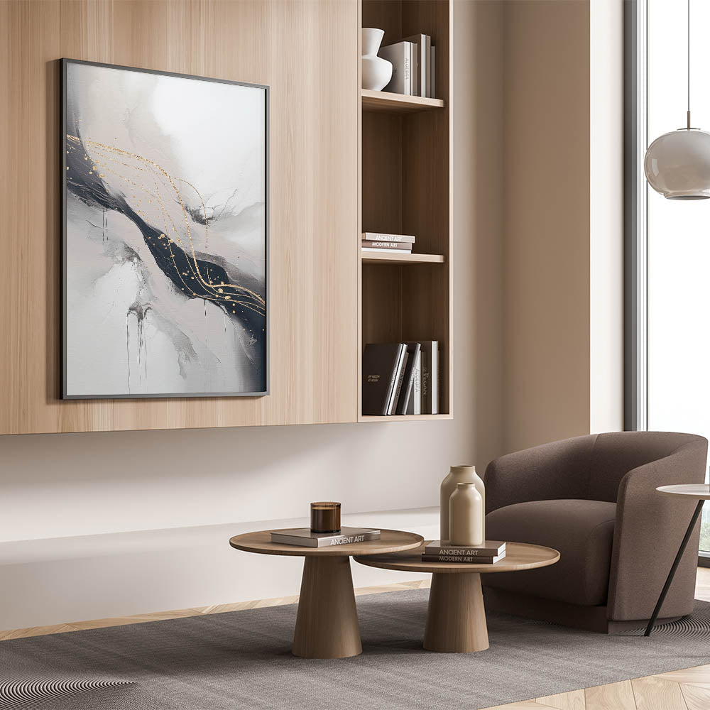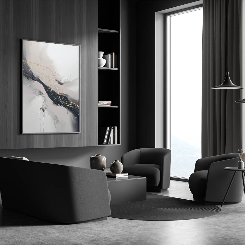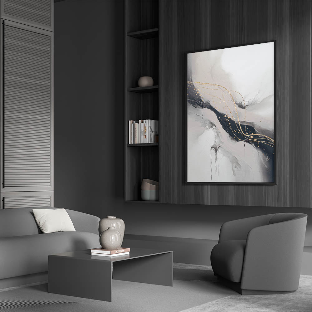 Elevate your home decor with this striking piece of modern abstract wall art. The artwork features a sophisticated blend of deep black and soft grey tones, accentuated with luxurious gold detailing. The flowing lines and elegant composition create a sense of movement and grace, making this piece a perfect addition to contemporary and minimalist interiors.