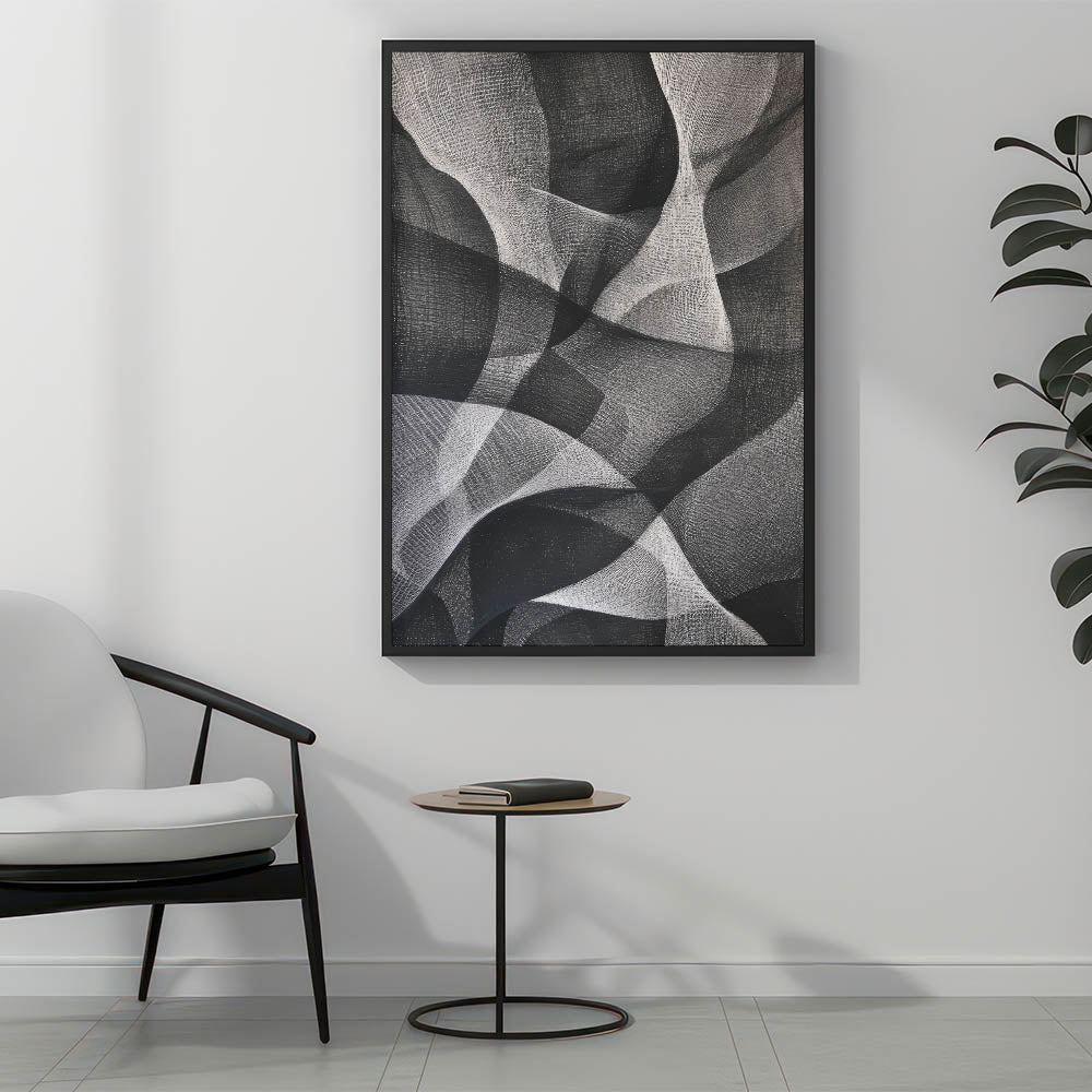 Immerse yourself in the beauty of contemporary black and white abstract art with this fluid geometric masterpiece. The intricate interplay of delicate curves and layered textures creates a sense of motion and depth, making it a perfect addition to modern, minimalist, and sophisticated interiors. The contrast between deep black and soft white tones enhances its elegant and timeless appeal.