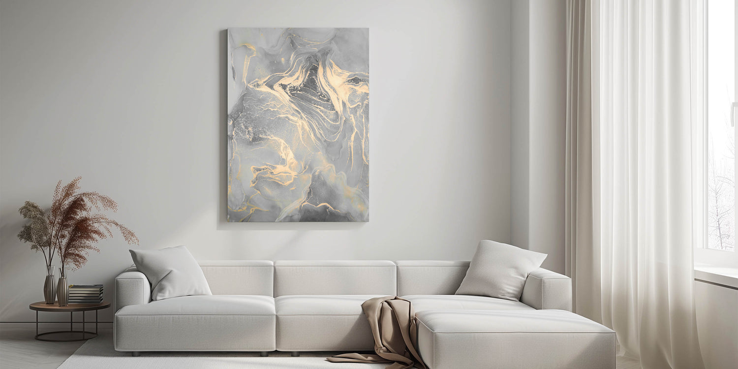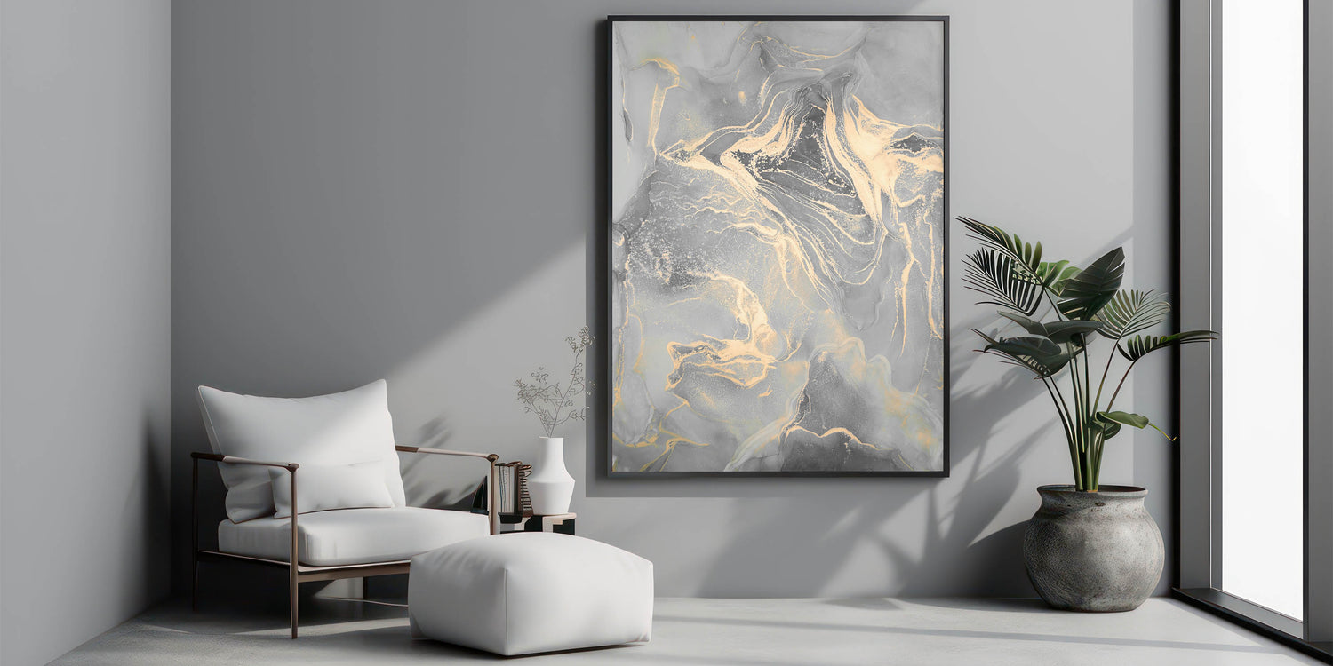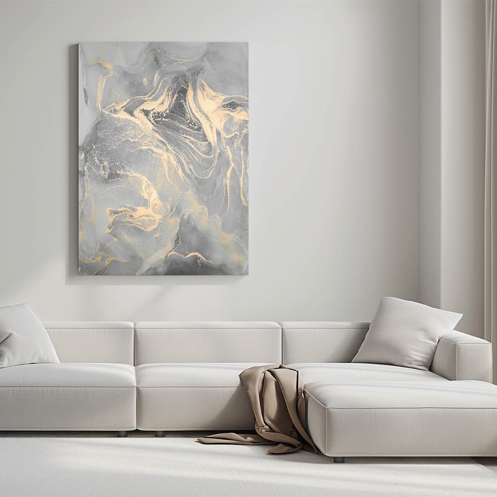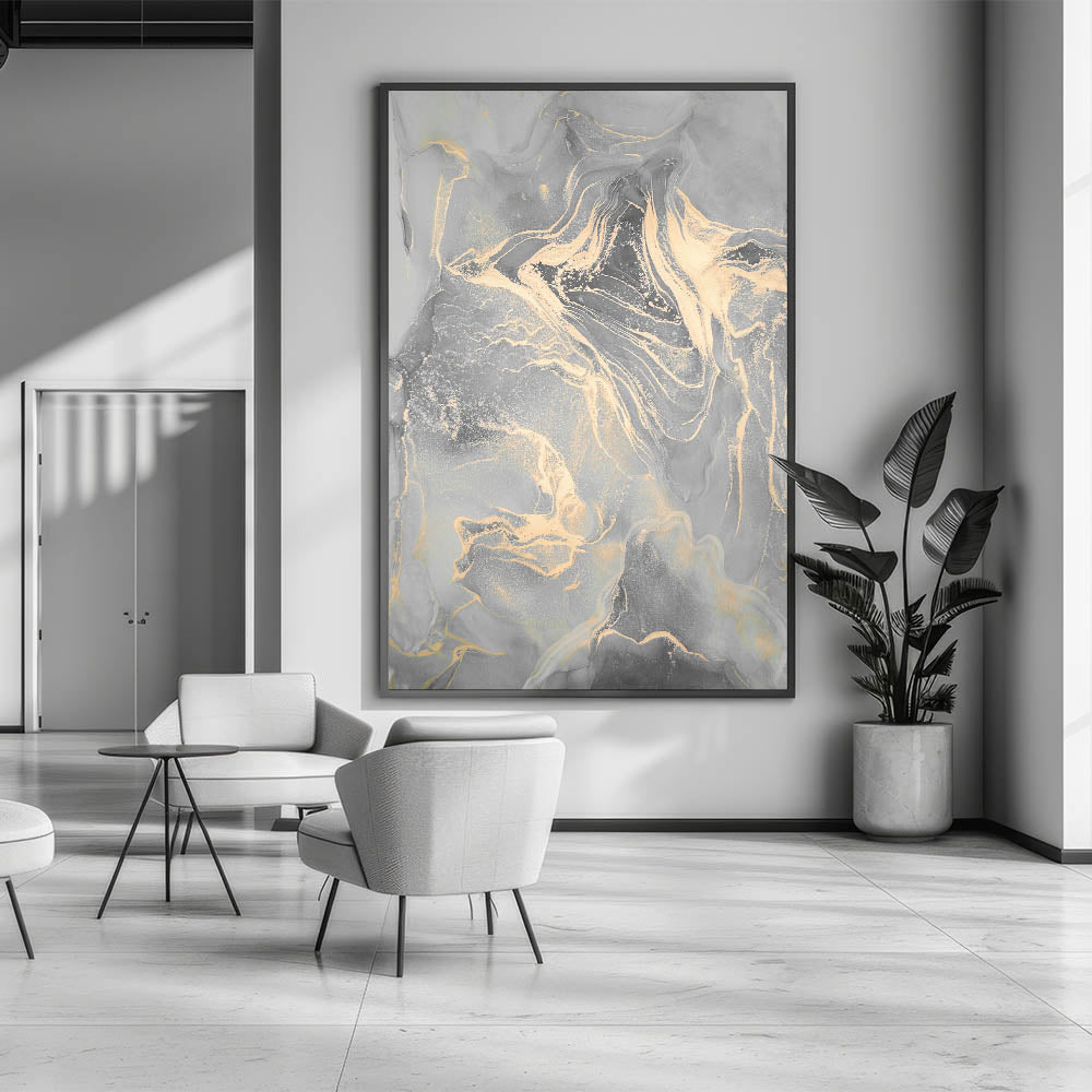 Transform your interiors with contemporary luxury abstract paintings, featuring a stunning interplay of light gray, dark gray, and shimmering gold. This high-quality abstract canvas print offers a refined elegance, making it an ideal statement piece for modern and upscale interiors. The delicate gold veining over smooth gray tones creates an airy and sophisticated ambiance, perfect for a living room, bedroom, office, or luxury hotel space.