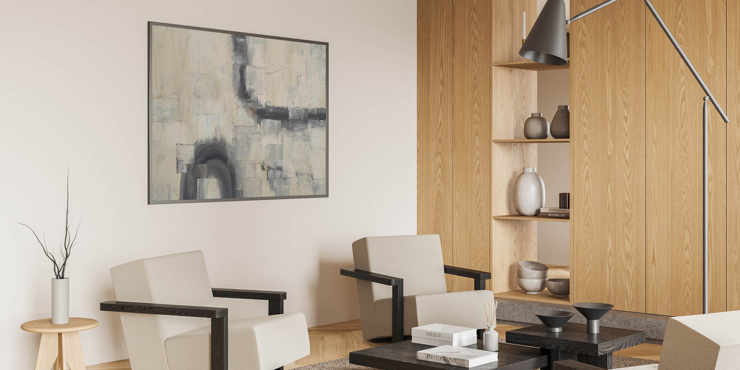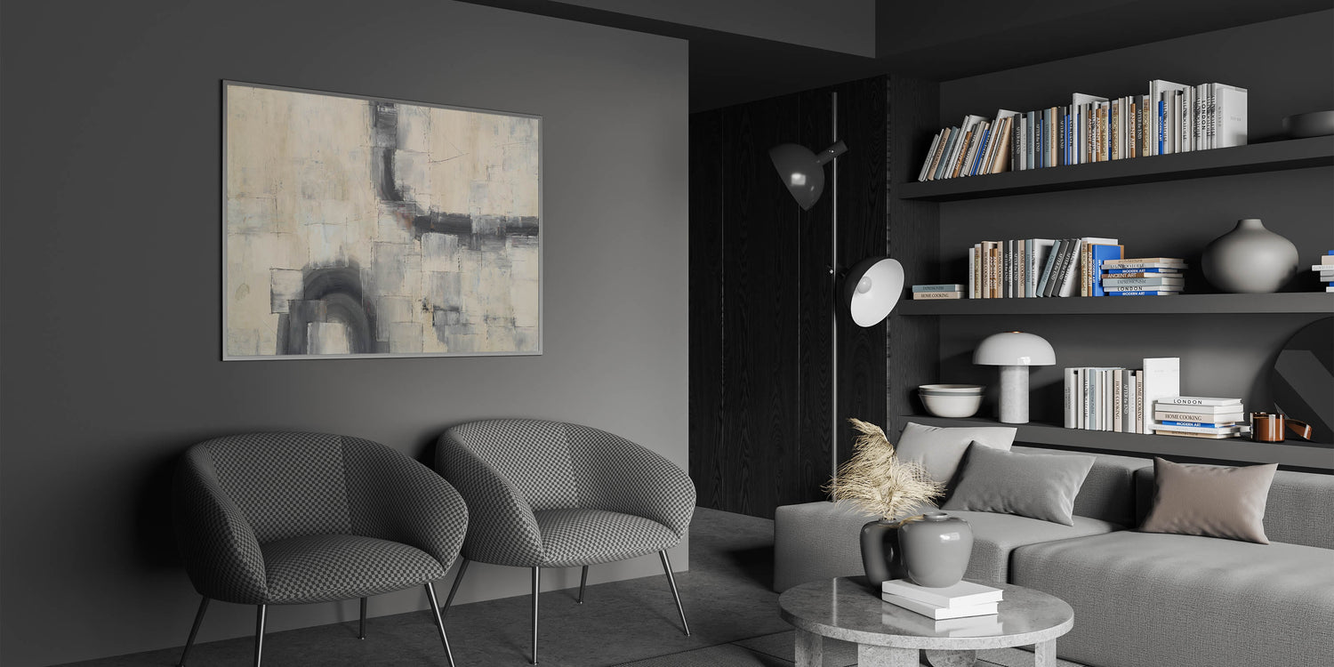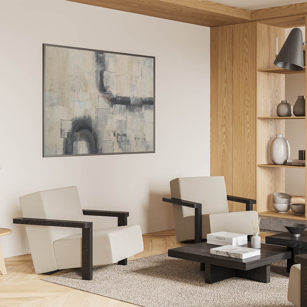 Introduce a refined sense of modern minimalism with this moody modern wall art, featuring a sophisticated composition in beige, gray, and black hues. The structured geometric elements and subtle shading create a dynamic yet balanced abstract wall art piece. Its soft neutral tones make it an ideal addition to contemporary and industrial interiors, offering a sleek and timeless aesthetic.