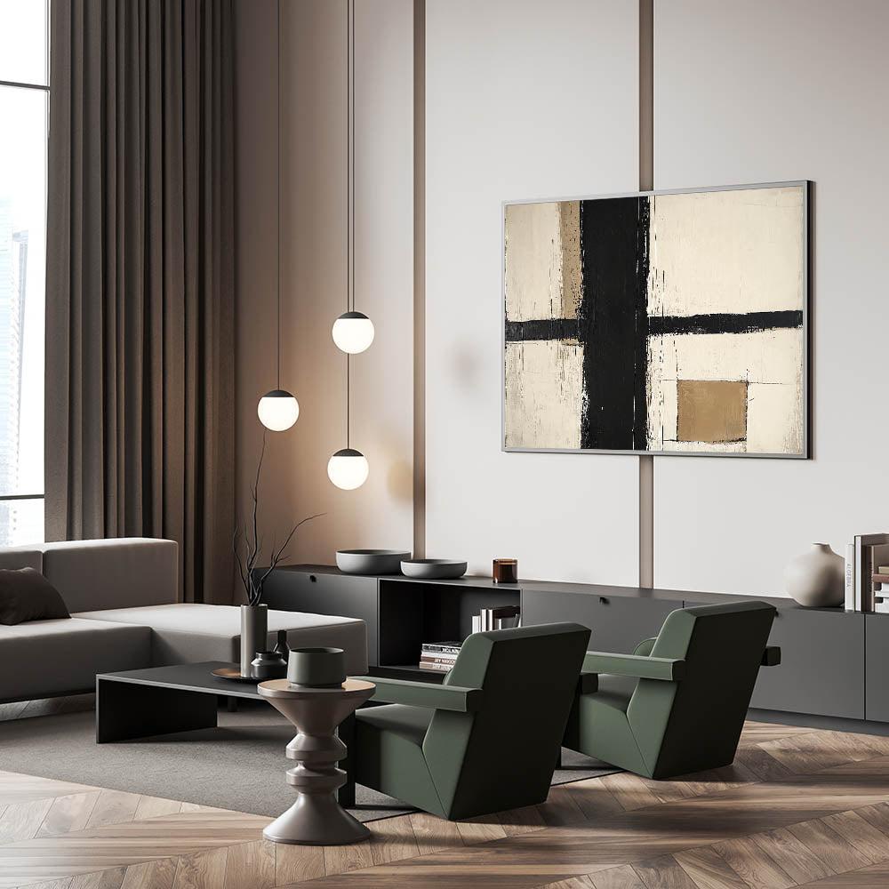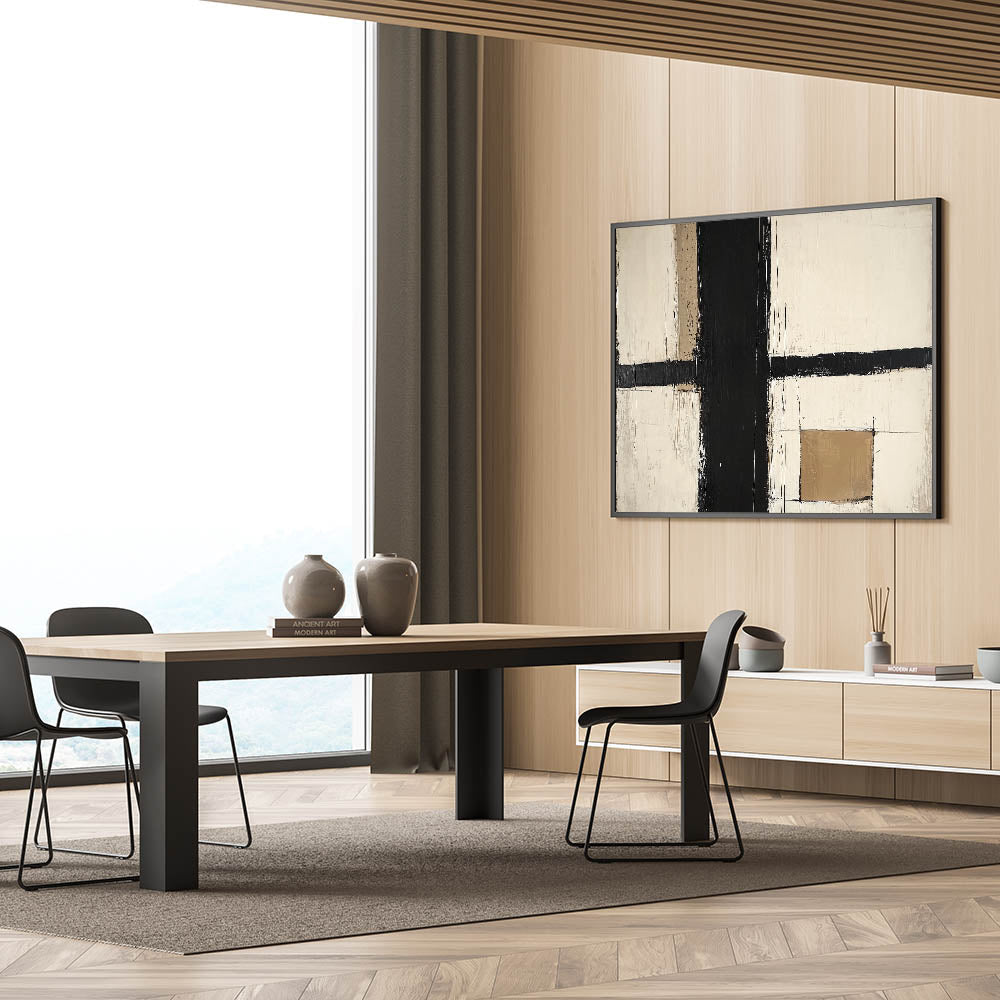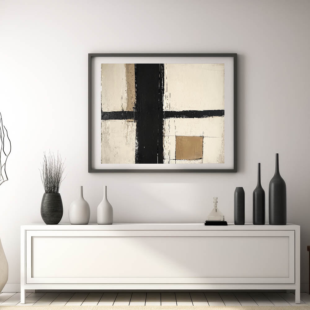 Make a statement with this living room wall art, featuring a bold abstract geometric design in black, white, and beige. The strong vertical and horizontal lines create a structured yet expressive composition, perfect for modern living room decor. The raw brushstrokes and textured details add depth, making this modern wall art an eye-catching centerpiece for contemporary interiors.