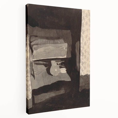 • Abstract minimalist stretched canvas artwork showcasing soft, muted colors and geometric patterns, viewed from the side, ideal for modern home decor.