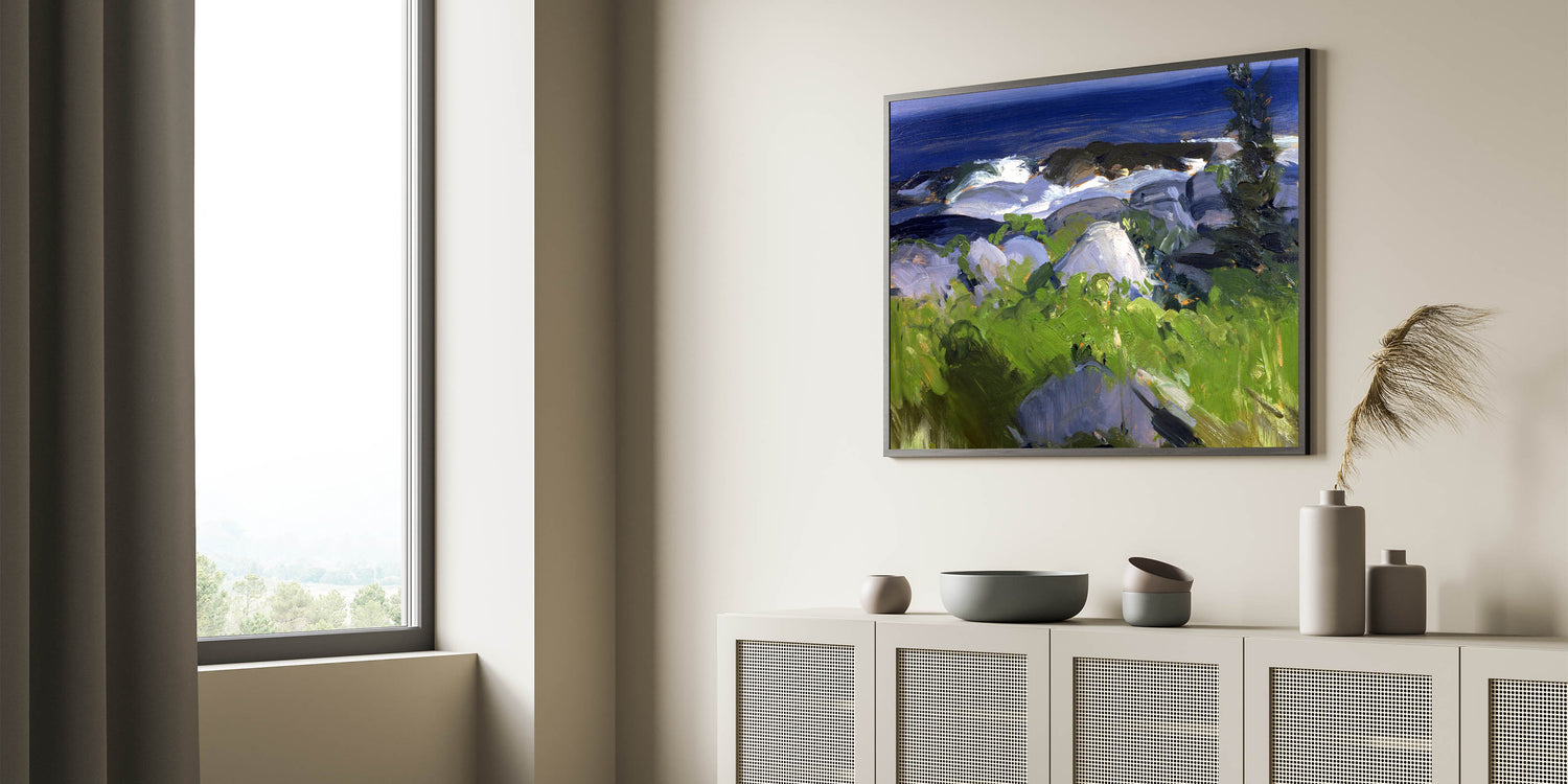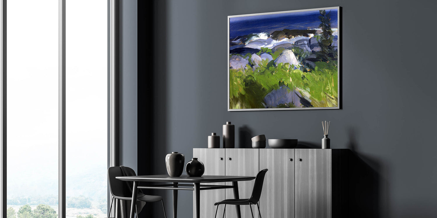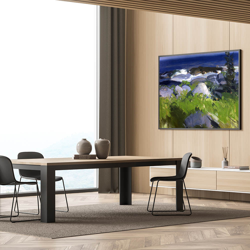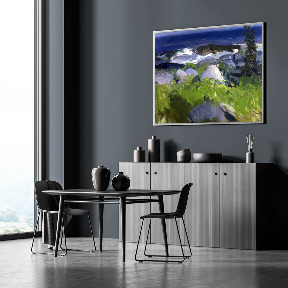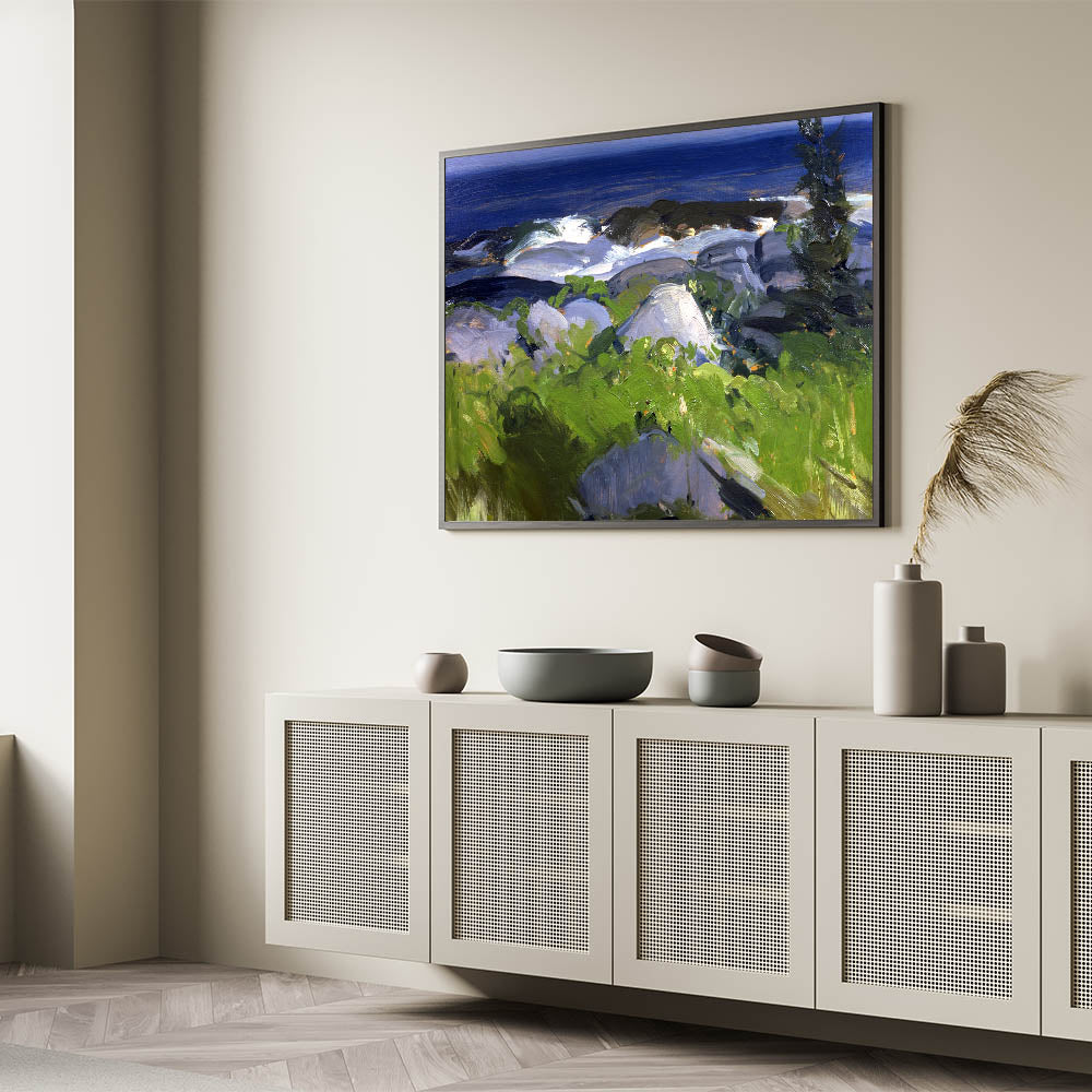 Bring the beauty of nature into your space with this stunning modern wall art inspired by George Wesley Bellows' "Vine Clad Shore, Monhegan Island" (1913). This captivating artwork captures the rugged beauty of a coastal landscape, featuring lush green foliage, dramatic rocks, and deep blue ocean waves under a vivid sky. The bold brushstrokes and rich palette offer a perfect blend of modern artistry and timeless natural beauty.