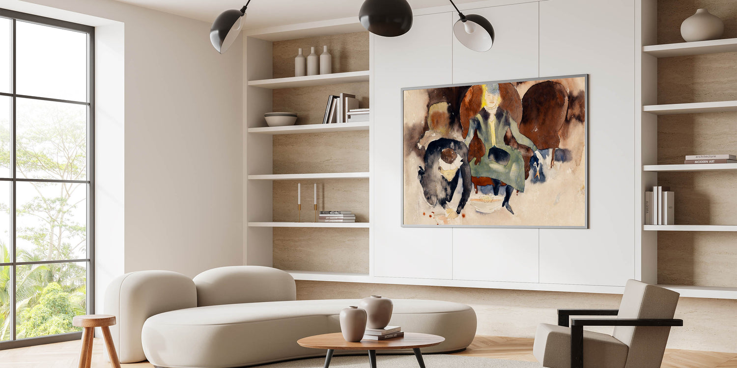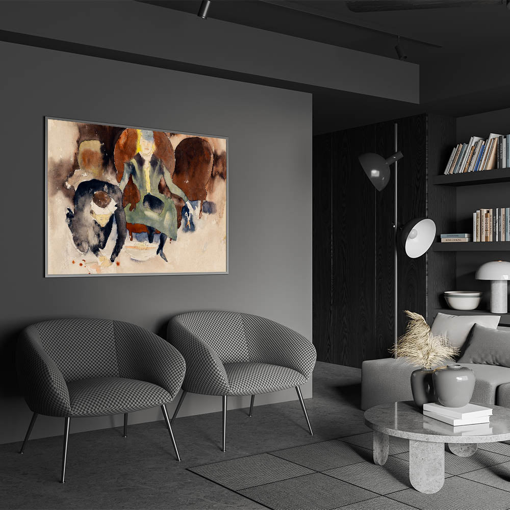 Add a touch of emotional depth to your decor with this modern wall art, inspired by Charles Demuth’s Scene after Georges Stabs Himself with the Scissors (1916). This evocative watercolor captures an intimate, dramatic moment with muted tones of beige, brown, and green, accented by subtle splashes of blue and yellow. The soft, fluid brushstrokes create an atmosphere of raw emotion and vulnerability, perfect for lovers of contemporary art with narrative intensity.