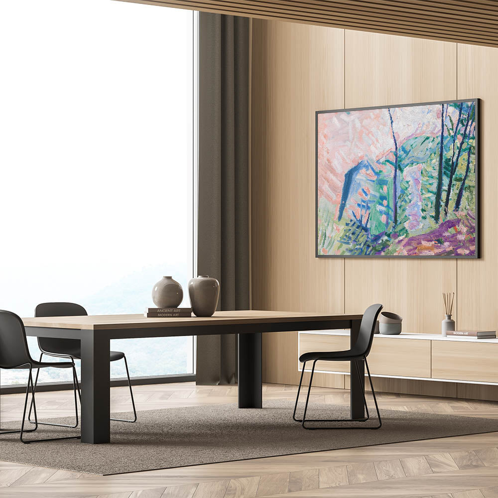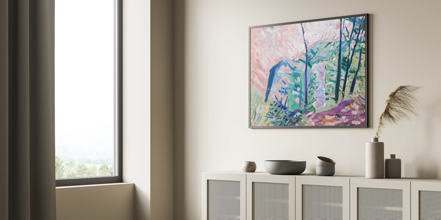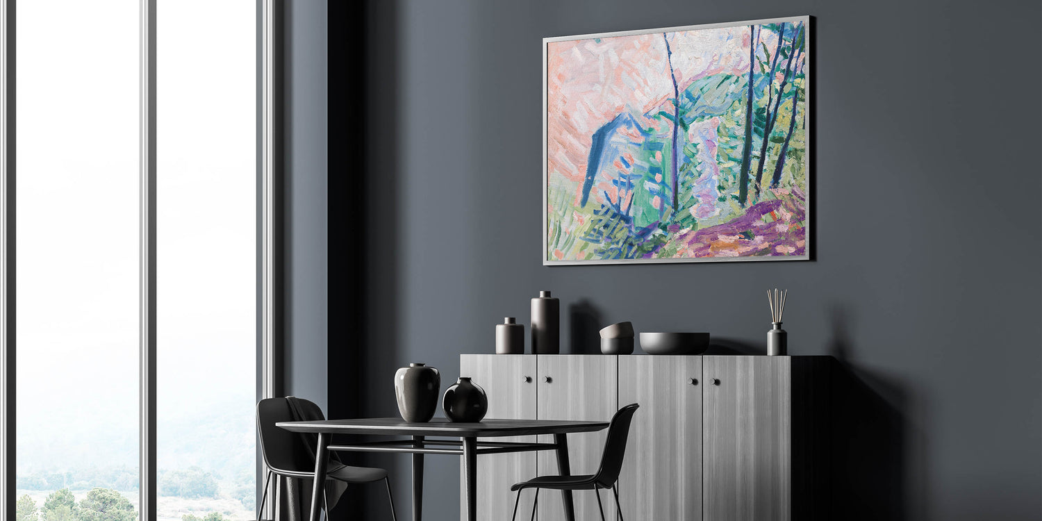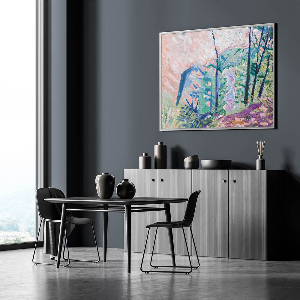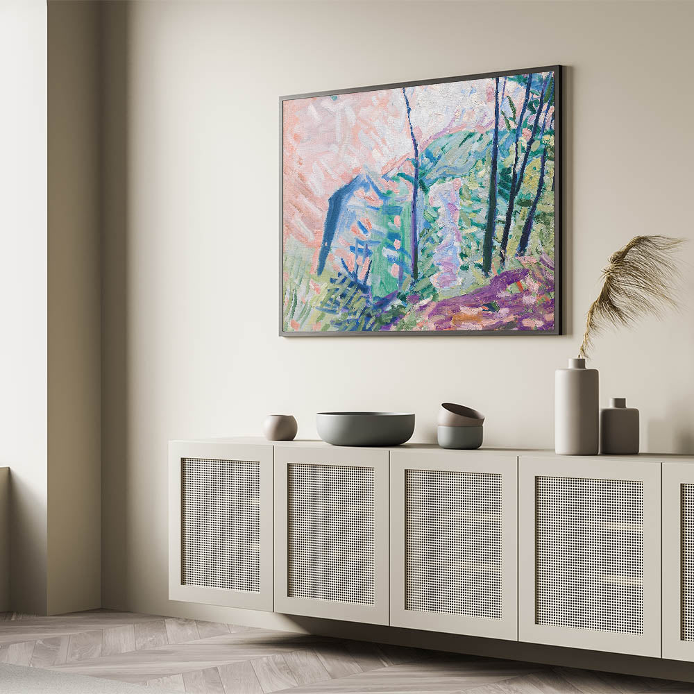 Bring the vibrant beauty of nature into your space with "Forest by Lake Bagsværd" by Niels Larsen Stevns. This expressive artwork captures a lush forest scene with a serene lake in the background. Rendered in soft yet dynamic strokes, the painting features a playful mix of greens, blues, and pinks, evoking a peaceful yet lively atmosphere. Perfect for contemporary interiors, this piece blends unique modern art with trendy home decor.