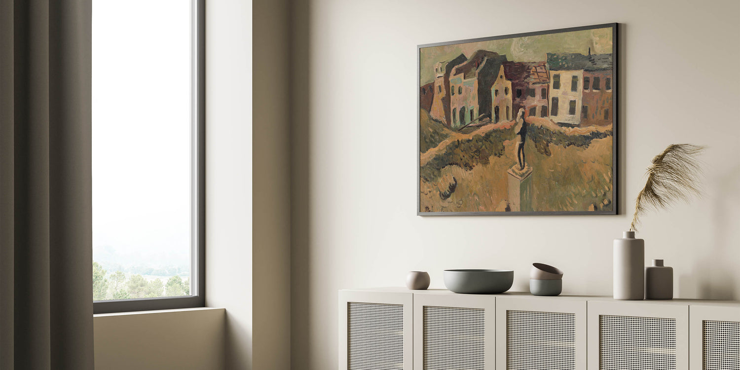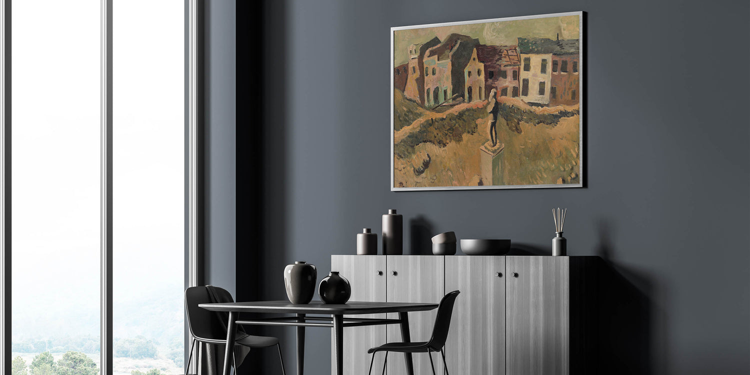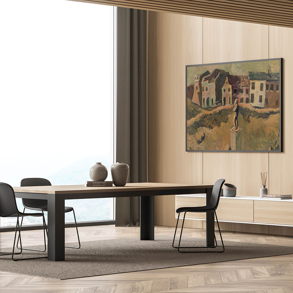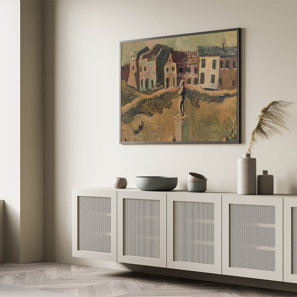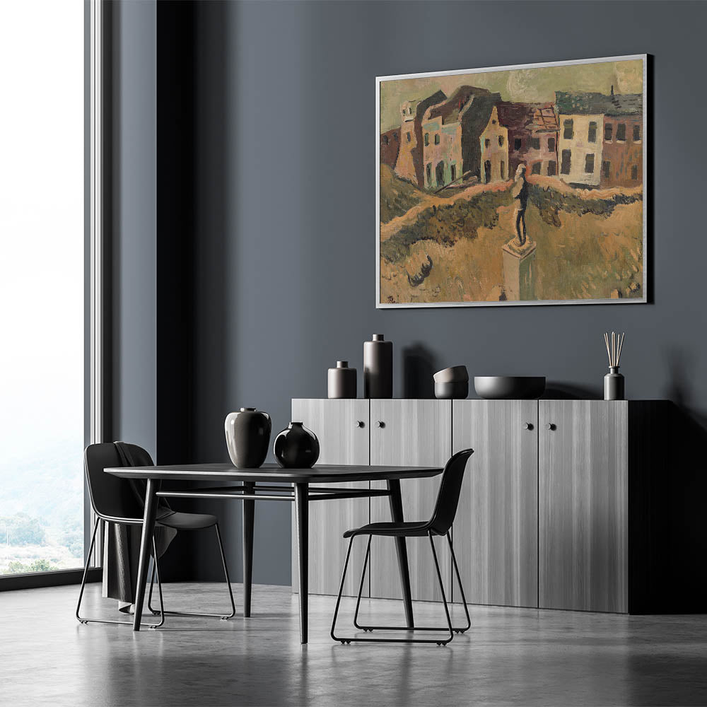 Explore the poignant artistry of Cyprián Majerník with this modern wall art, inspired by his work Monument (Memorial of a Famous Man). This evocative painting depicts a desolate urban scene, centered around a solitary monument amidst earthy tones of brown, green, and beige. The textured brushwork and somber color palette convey a deep sense of nostalgia and reflection, making this piece perfect for lovers of contemporary art that tells a story.