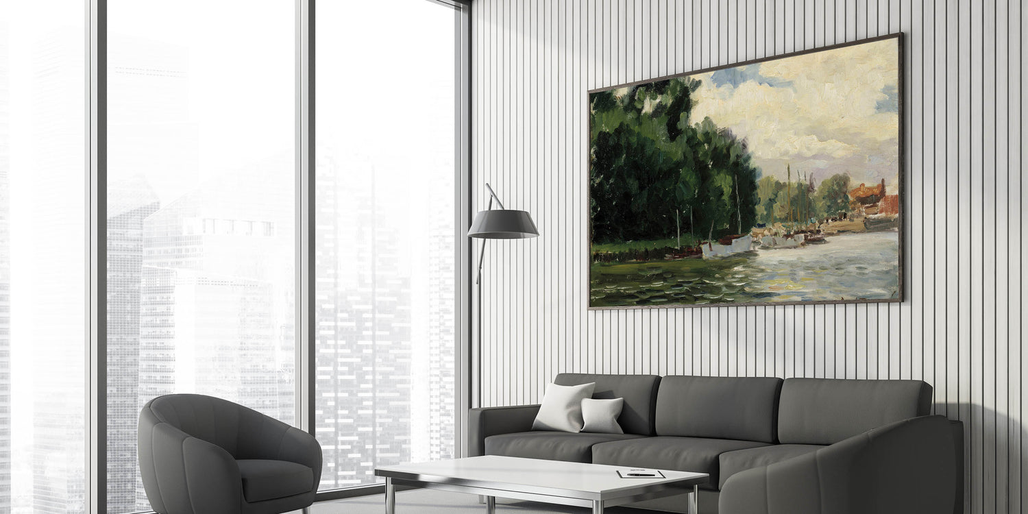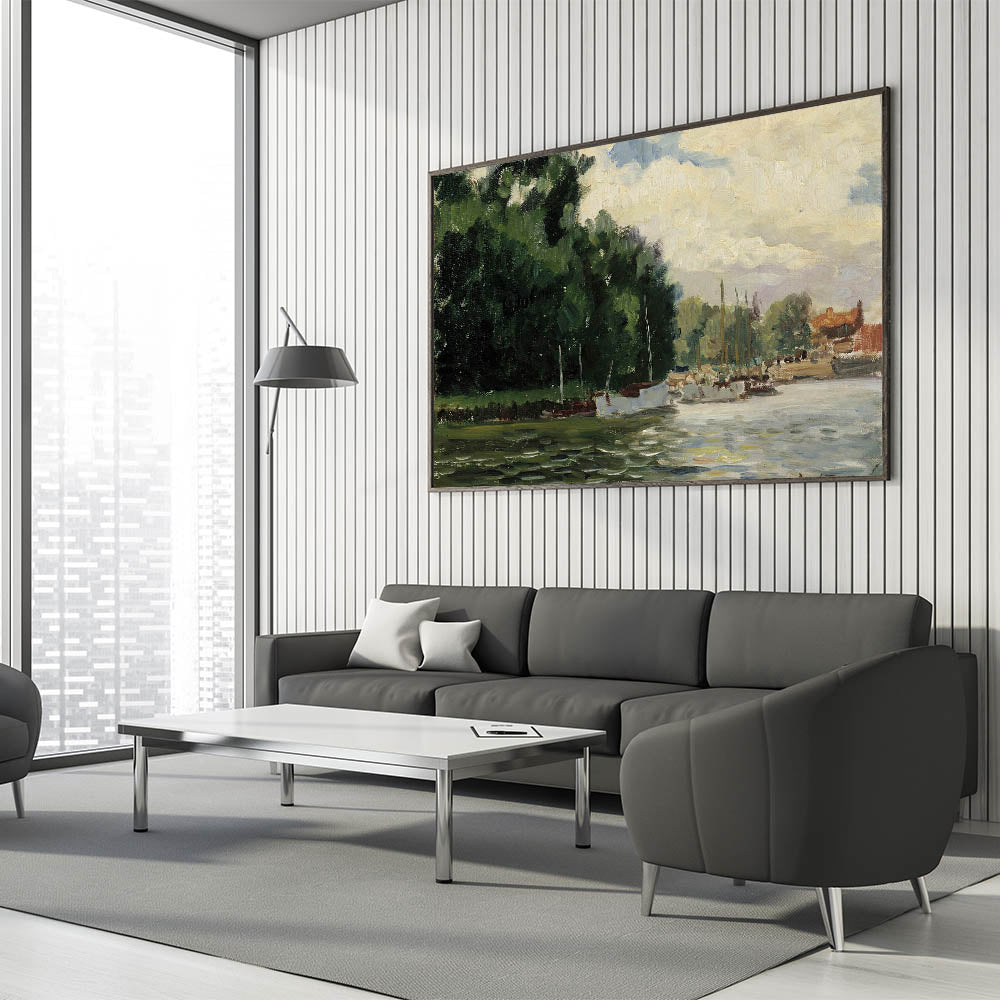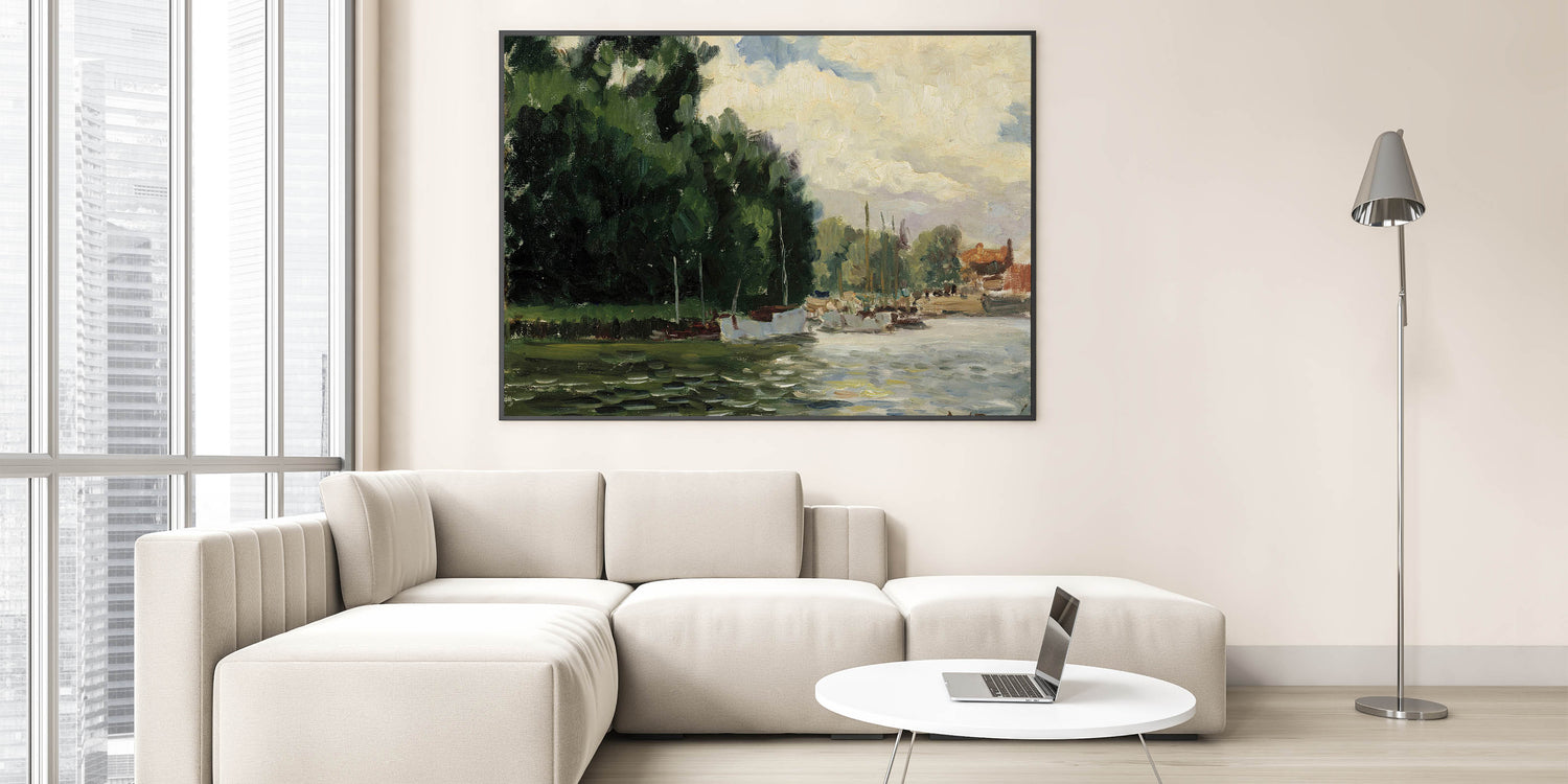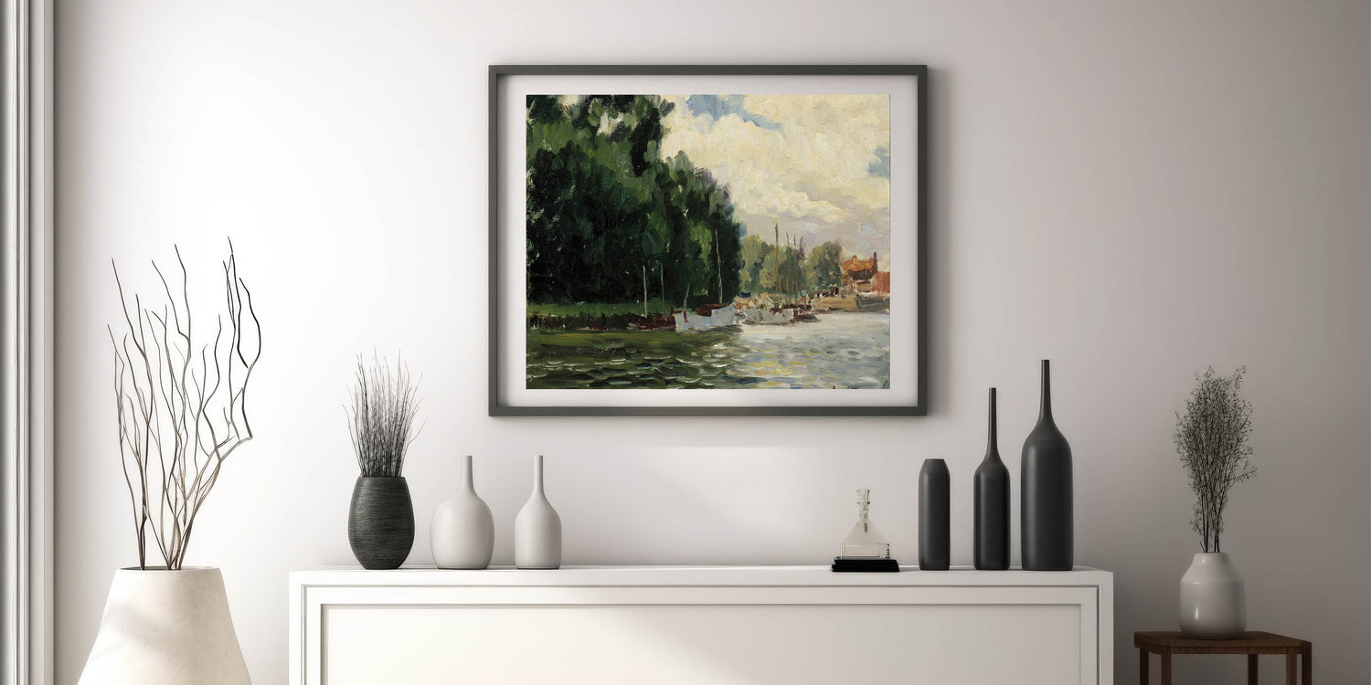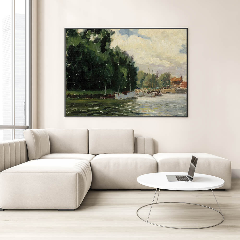 Enhance your living space with the serene beauty of Richmond, Thames by Alfred William Finch. This picturesque artwork captures a peaceful riverside scene with lush greenery, tranquil waters, and moored boats. Finch’s impressionistic strokes bring the scene to life, making it a perfect addition to modern and classic interiors alike.