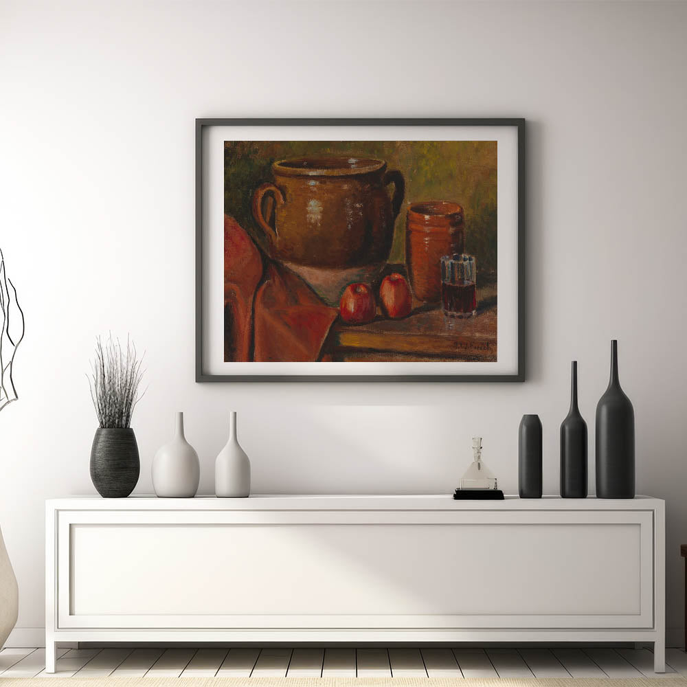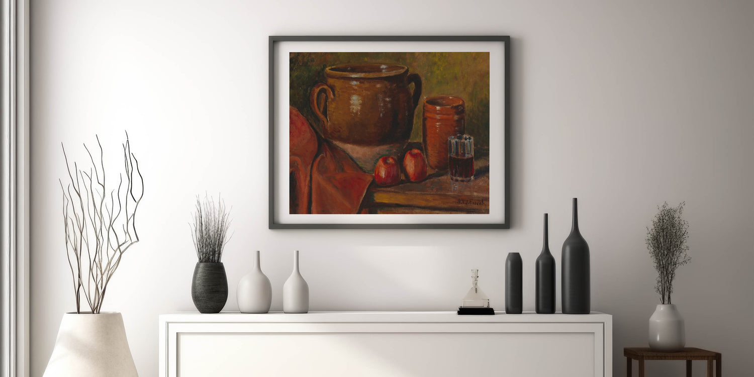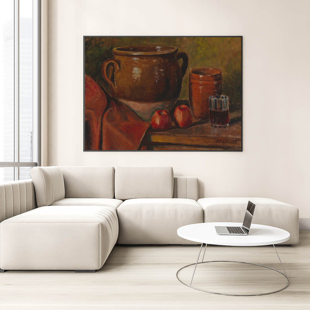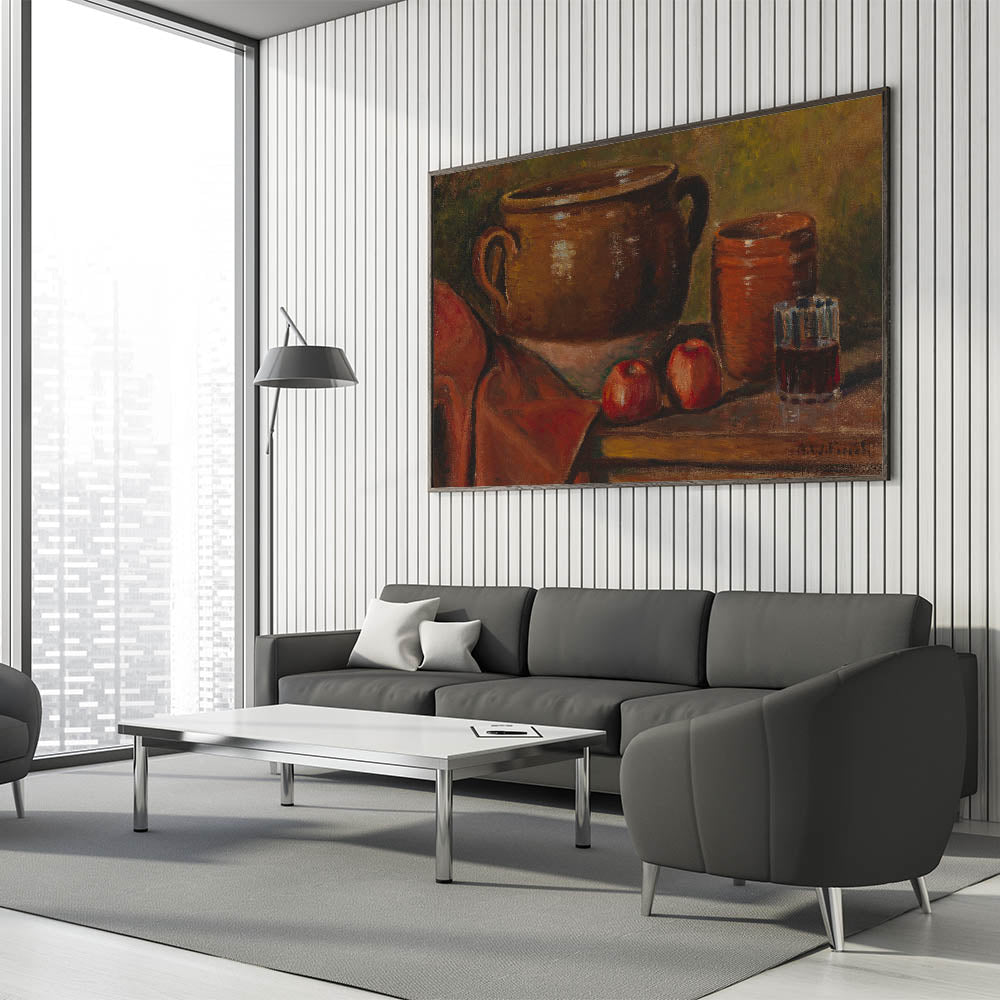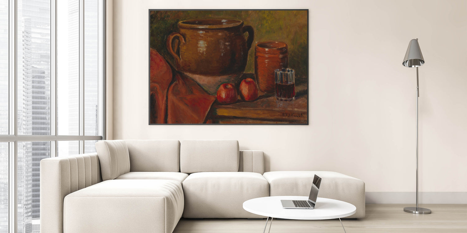 Infuse your home with timeless charm through this stunning modern wall art inspired by Alfred William Finch's "Still Life, 1923." This captivating piece showcases a warm, rustic arrangement of pottery, a glass of wine, and vibrant red apples set against a textured backdrop. The earthy tones and realistic detailing evoke a sense of coziness and sophistication, making it a perfect addition to modern and traditional decor alike.