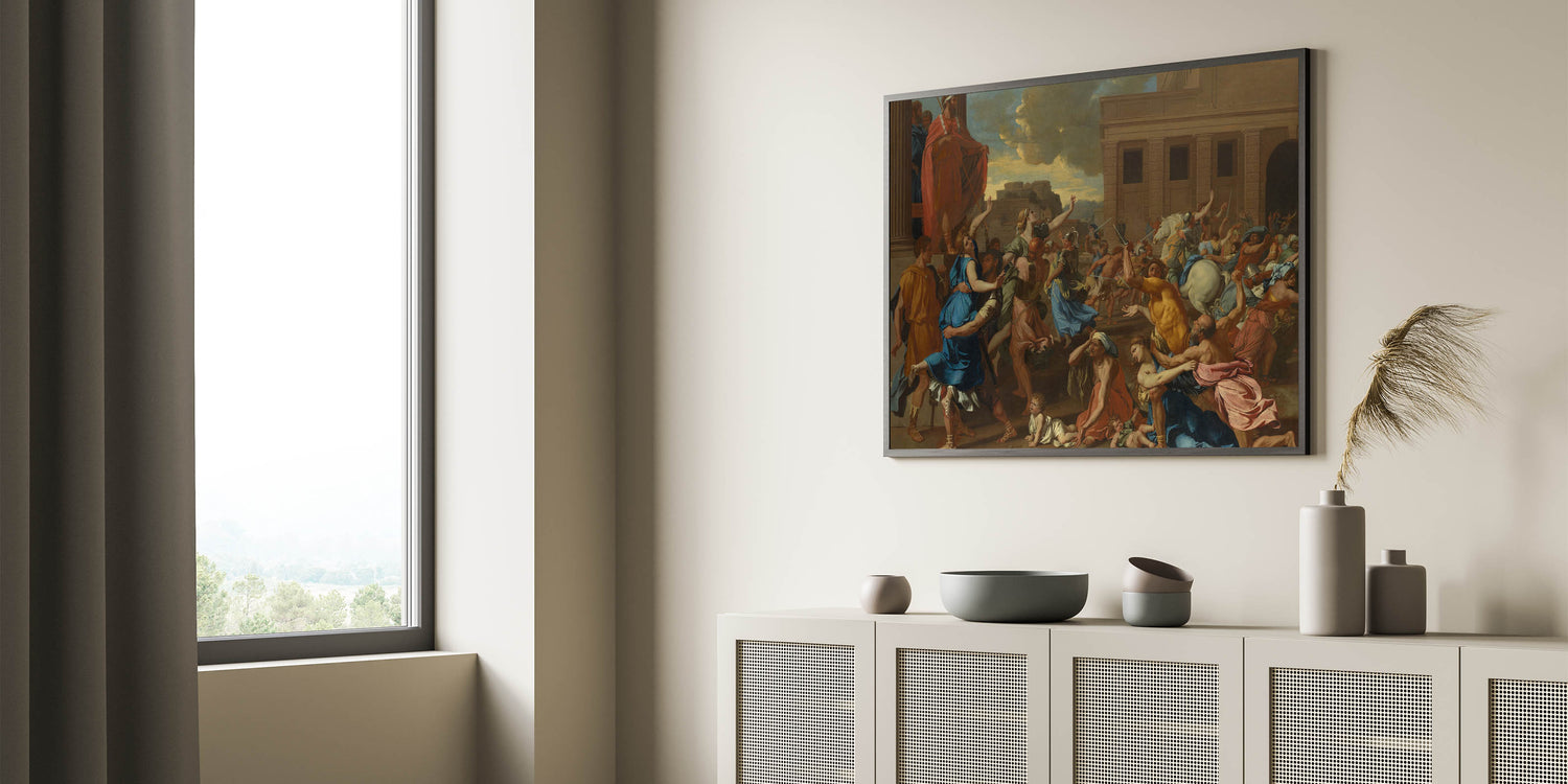 Bring a touch of classical drama to your space with this modern wall art inspired by Nicolas Poussin's iconic masterpiece, "The Abduction of the Sabine Women." This artwork captures a pivotal historical moment with intense emotions, dynamic movement, and intricate detailing. Featuring vibrant colors and dramatic lighting, it’s a timeless piece that blends historical storytelling with modern decor trends.