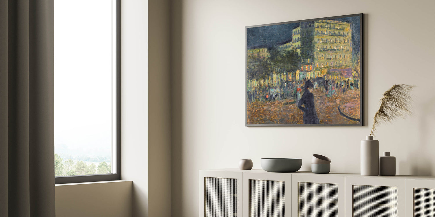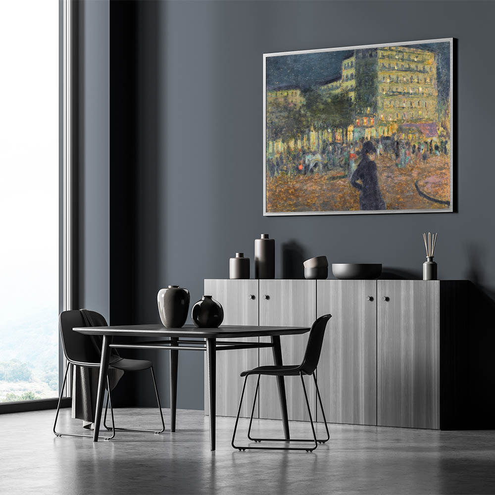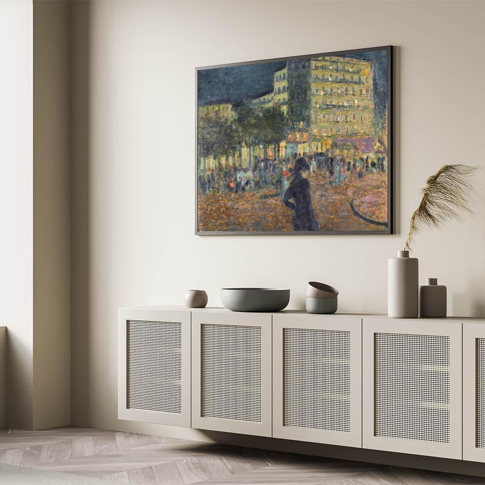 Step into the enchanting nightlife of early 20th-century Paris with Place Pigalle at Night by Pierre Bonnard. This exquisite artwork captures the lively energy and mystique of a bustling city square, illuminated by the warm glow of streetlights and the allure of vibrant nightlife. Bonnard’s Impressionist touch and use of muted yet striking colors create a captivating and atmospheric scene.