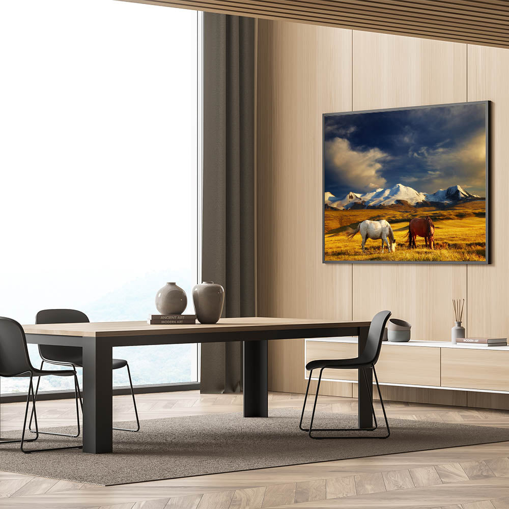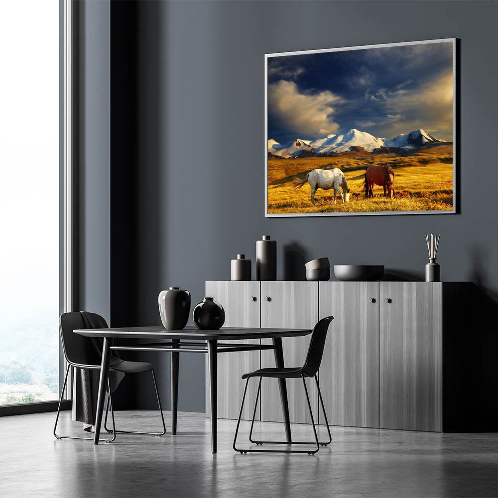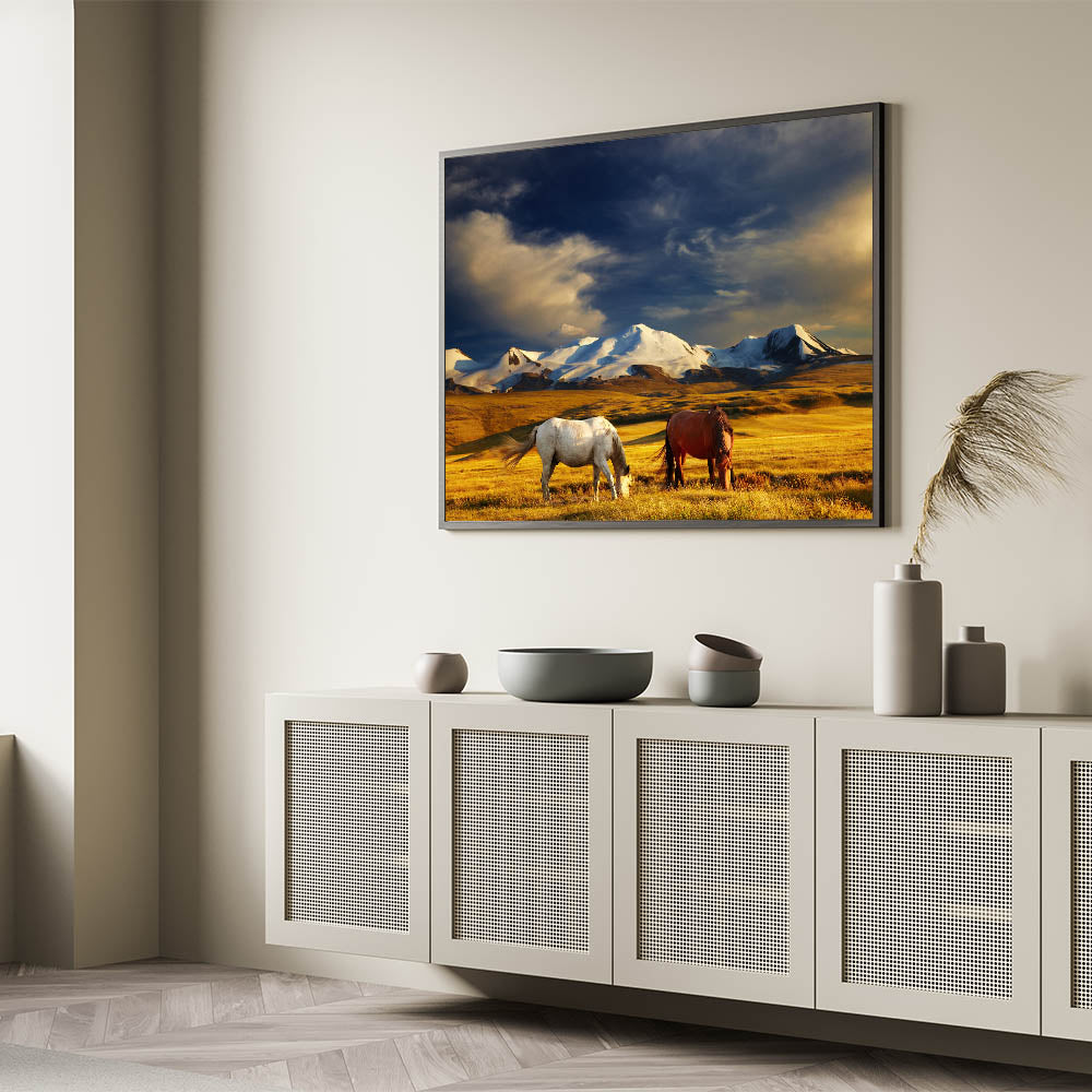 Bring the majestic beauty of Mongolia into your home with this captivating wall art. Featuring two horses grazing peacefully against the backdrop of towering snow-capped mountains, this artwork encapsulates the harmony between nature and the wild spirit of Mongolia. The dark, dramatic sky contrasts beautifully with the golden plains, creating a sense of depth and wonder. This piece perfectly captures the natural beauty and cultural heritage of Mongolia, making it an ideal addition to any space.