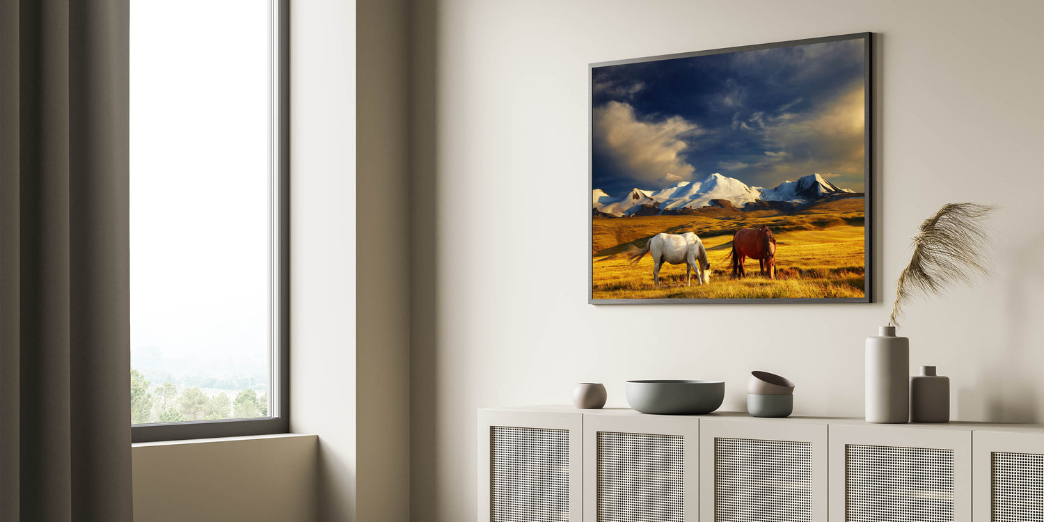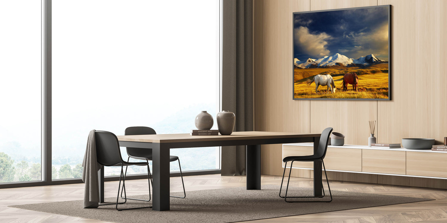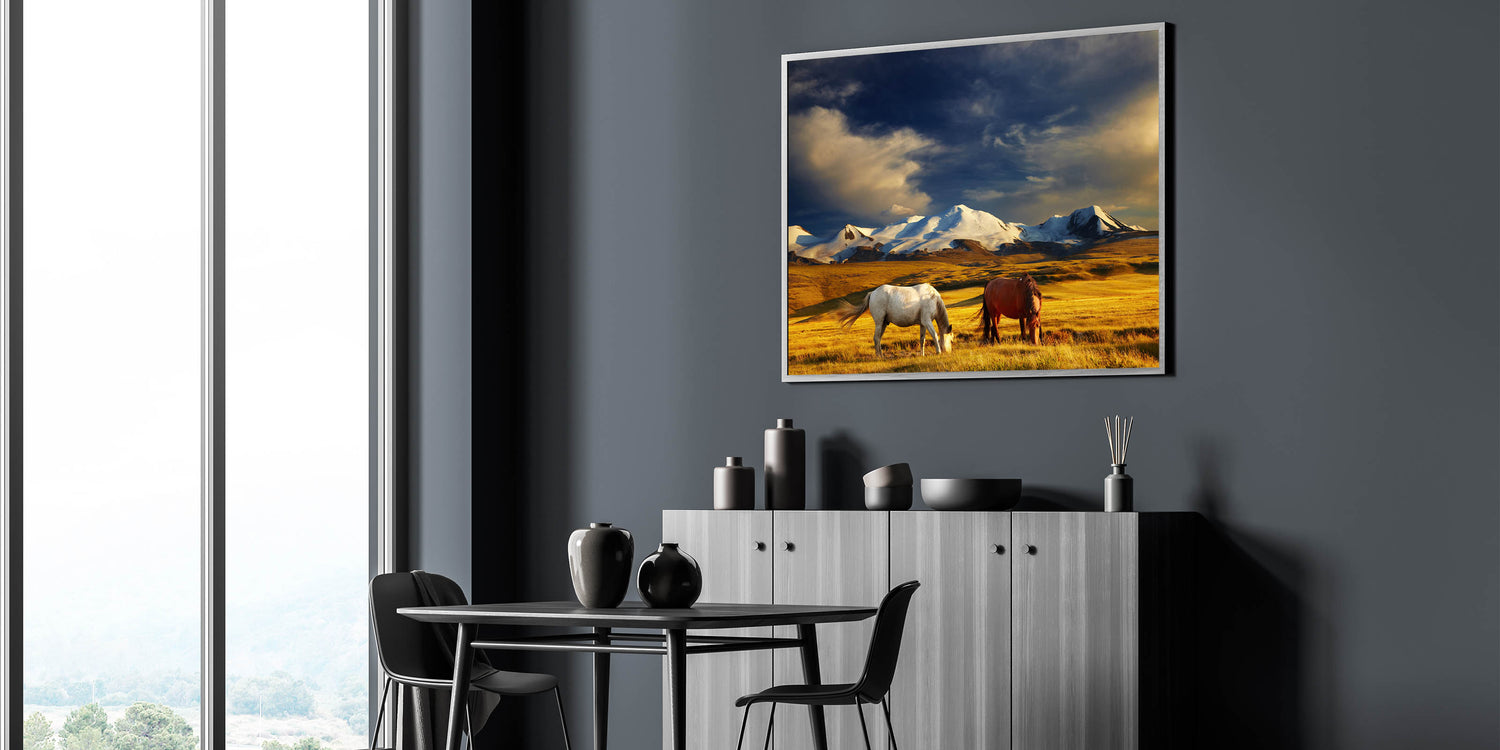 Bring the majestic beauty of Mongolia into your home with this captivating wall art. Featuring two horses grazing peacefully against the backdrop of towering snow-capped mountains, this artwork encapsulates the harmony between nature and the wild spirit of Mongolia. The dark, dramatic sky contrasts beautifully with the golden plains, creating a sense of depth and wonder. This piece perfectly captures the natural beauty and cultural heritage of Mongolia, making it an ideal addition to any space.