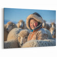 Nomadic Life Art - Smiling Child with Sheep in Mongolian Winter Landscape