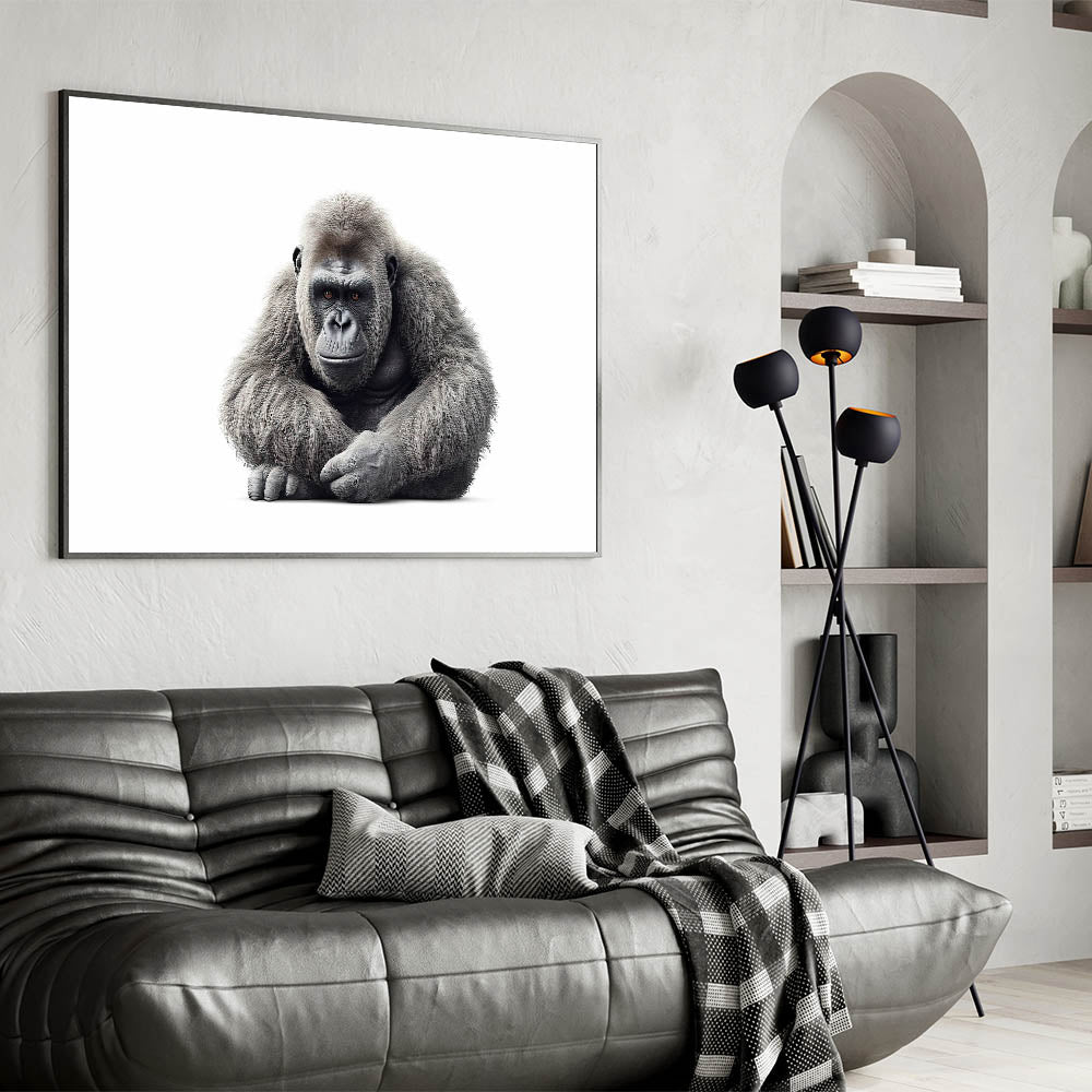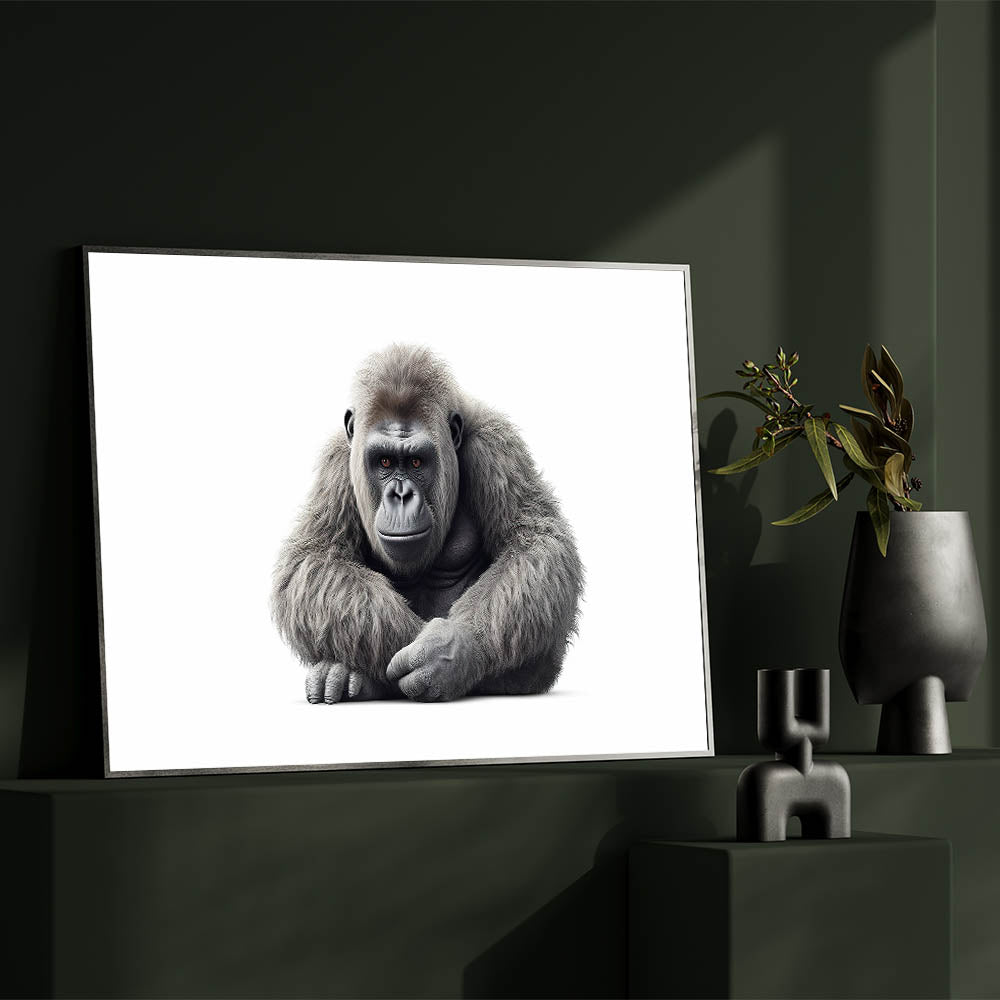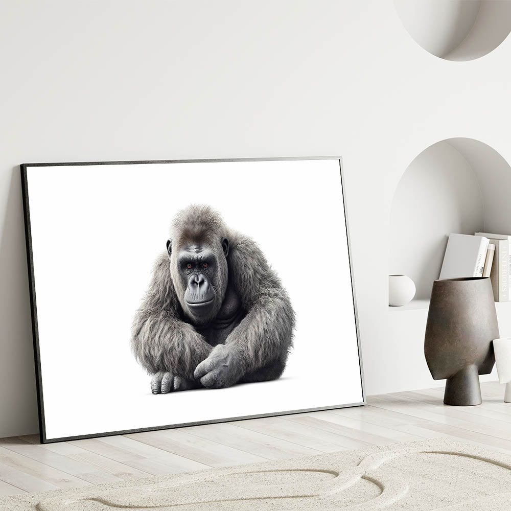 Add a touch of tranquility to your space with this serene gorilla art, featuring a calm and contemplative gorilla sitting gracefully against a pristine white background. The detailed portrayal of the gorilla's features and fur creates a captivating contrast, making this piece a standout addition to any room. Ideal for those who appreciate the beauty of wildlife and seek to incorporate nature's peacefulness into their home or office decor.