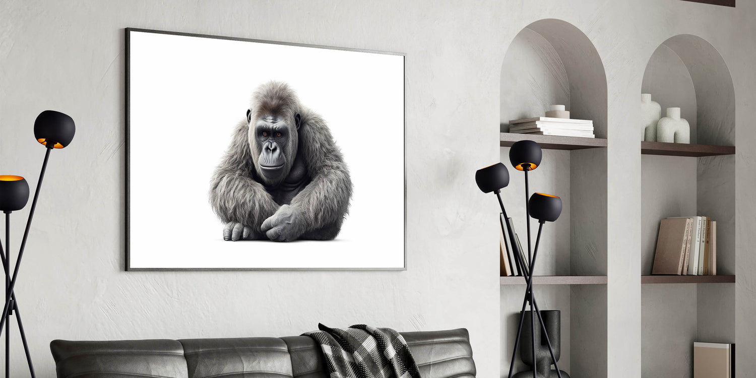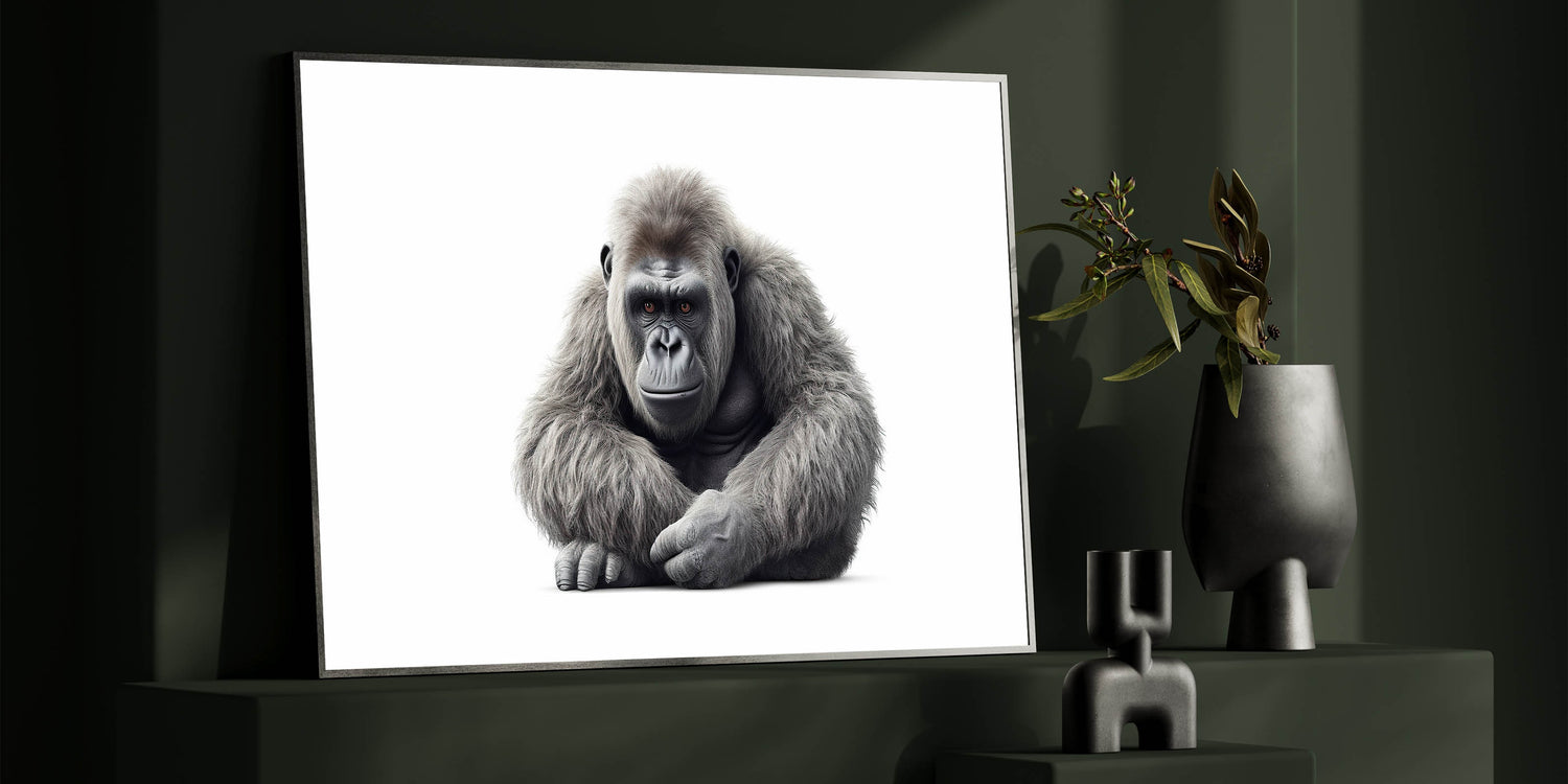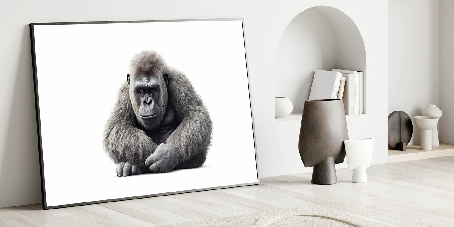 Add a touch of tranquility to your space with this serene gorilla art, featuring a calm and contemplative gorilla sitting gracefully against a pristine white background. The detailed portrayal of the gorilla's features and fur creates a captivating contrast, making this piece a standout addition to any room. Ideal for those who appreciate the beauty of wildlife and seek to incorporate nature's peacefulness into their home or office decor.