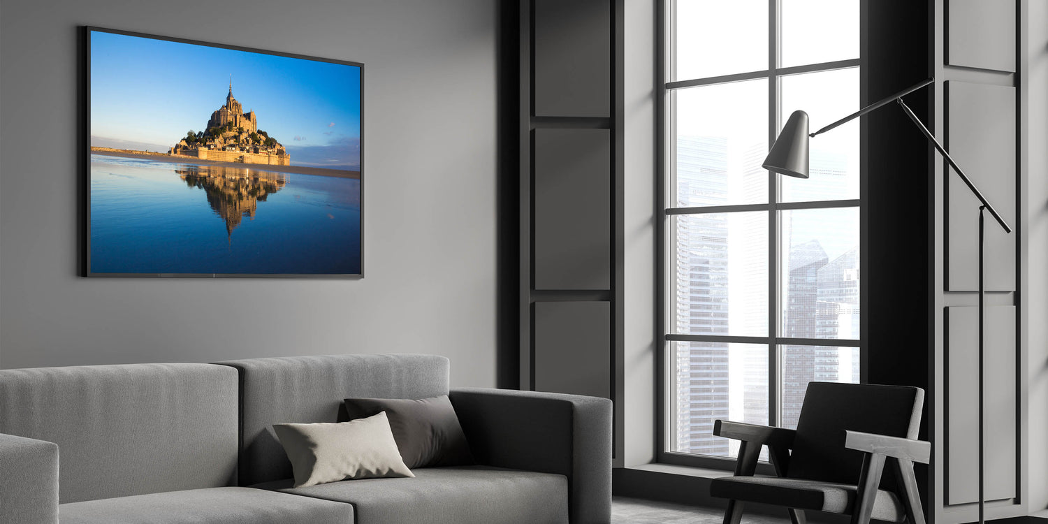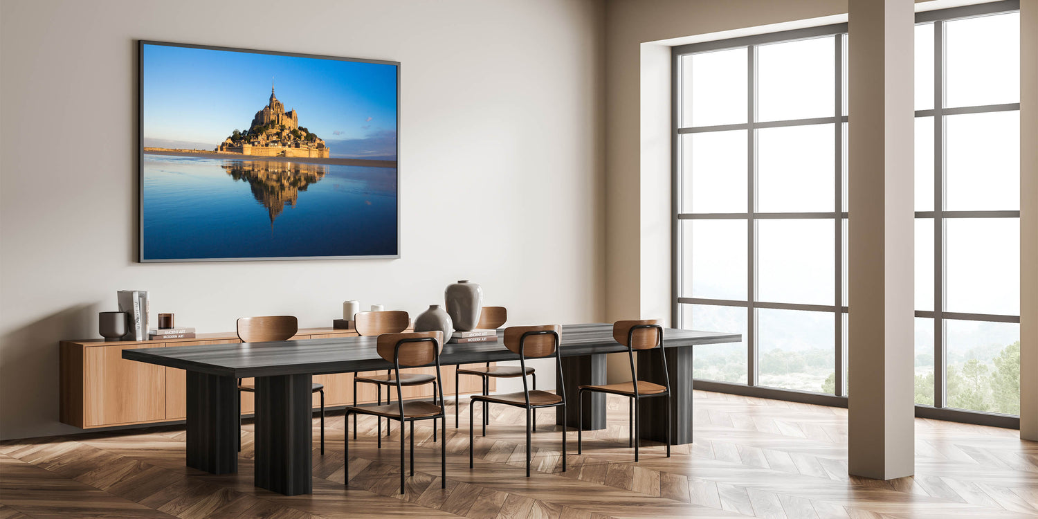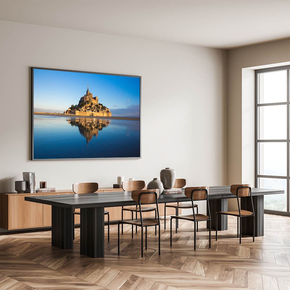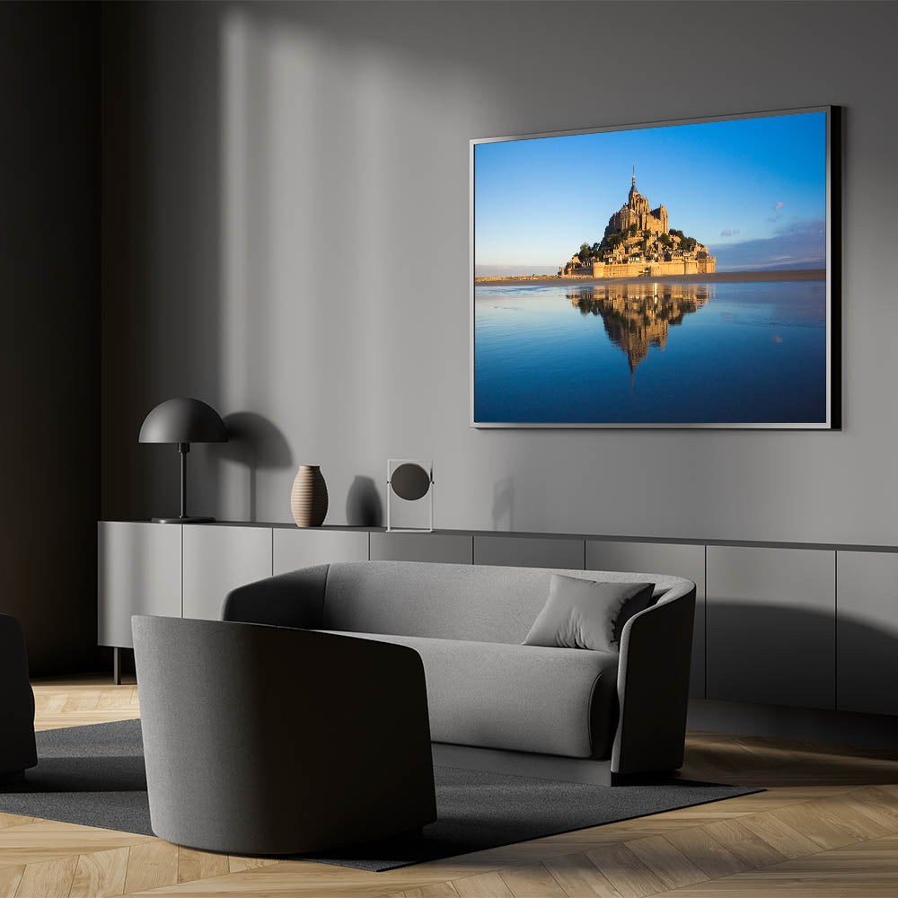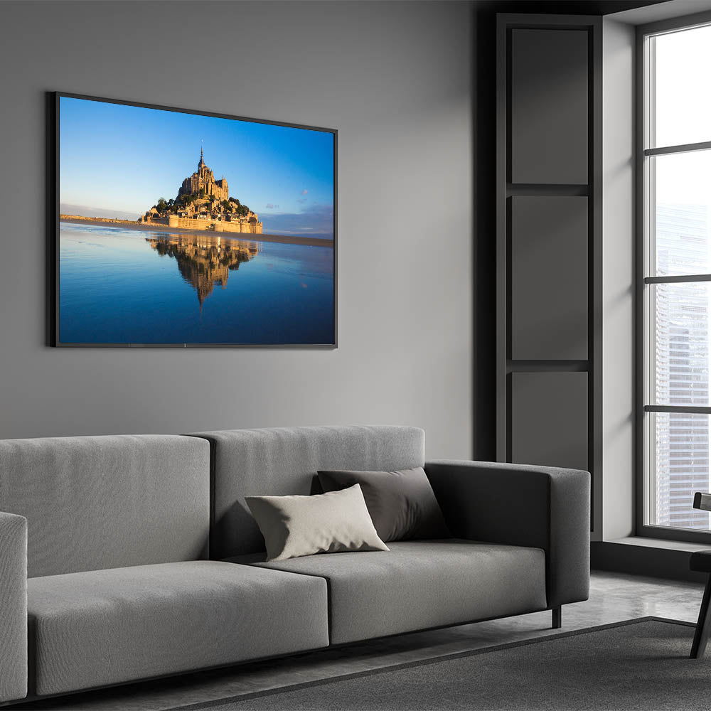 Perfect for adding a touch of French culture and history to your home, this piece will instantly elevate any living room, bedroom, or office. The tranquil reflection and soft hues of Mont St. Michel are sure to captivate anyone who sees it.