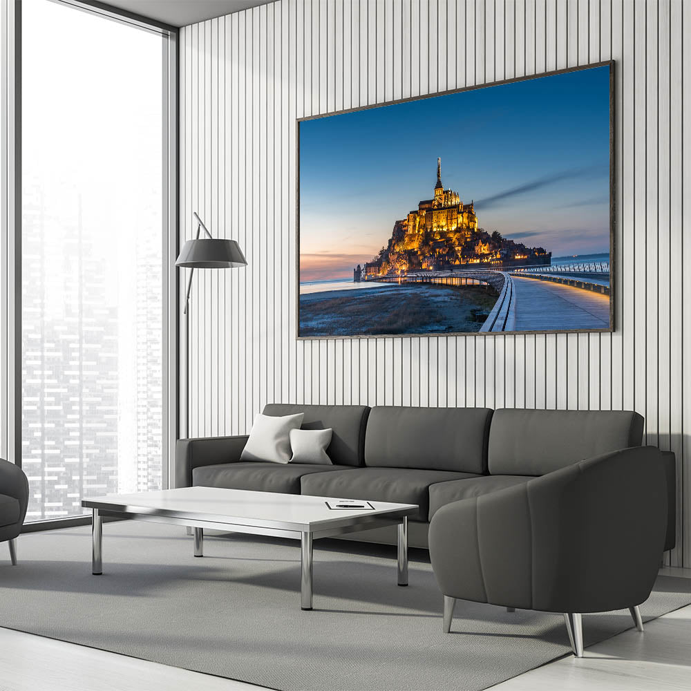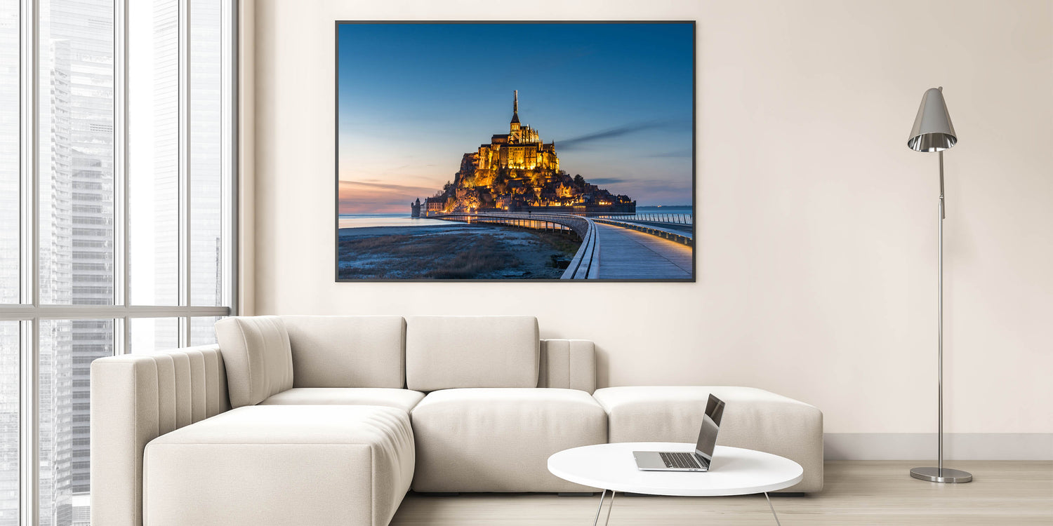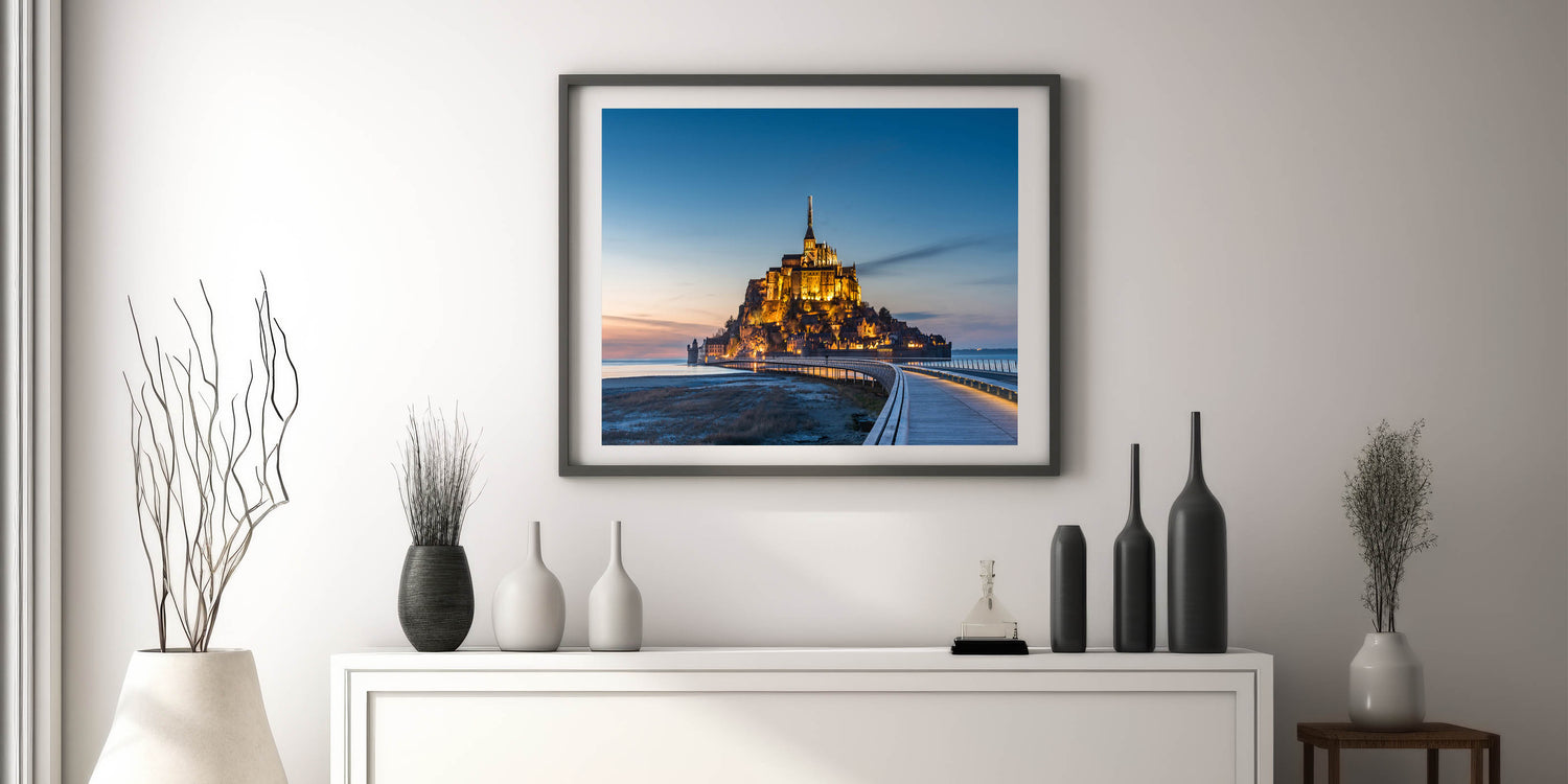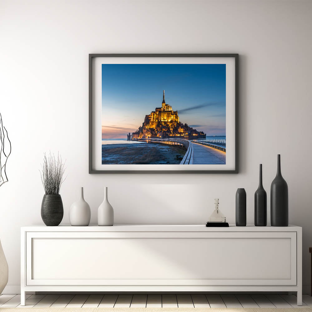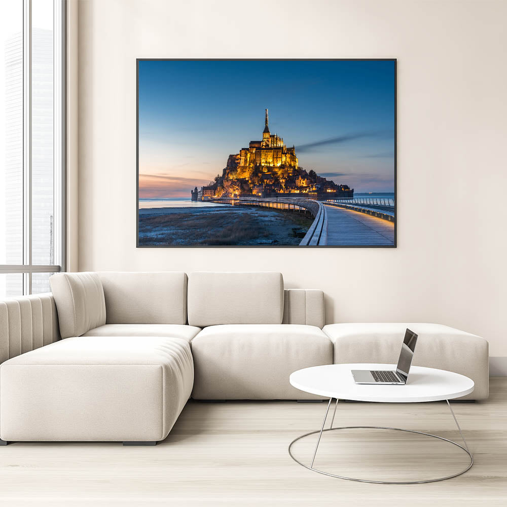Enhance your space with the captivating beauty of Mont St. Michel through this Michel Acrylic Glass Art, part of our French Scenery Prints collection. This artwork features a beautifully lit Mont St. Michel at dusk, with the serene waters and majestic architecture reflected in stunning detail. The winding path leading up to the iconic monument adds depth and grandeur to this breathtaking scene.